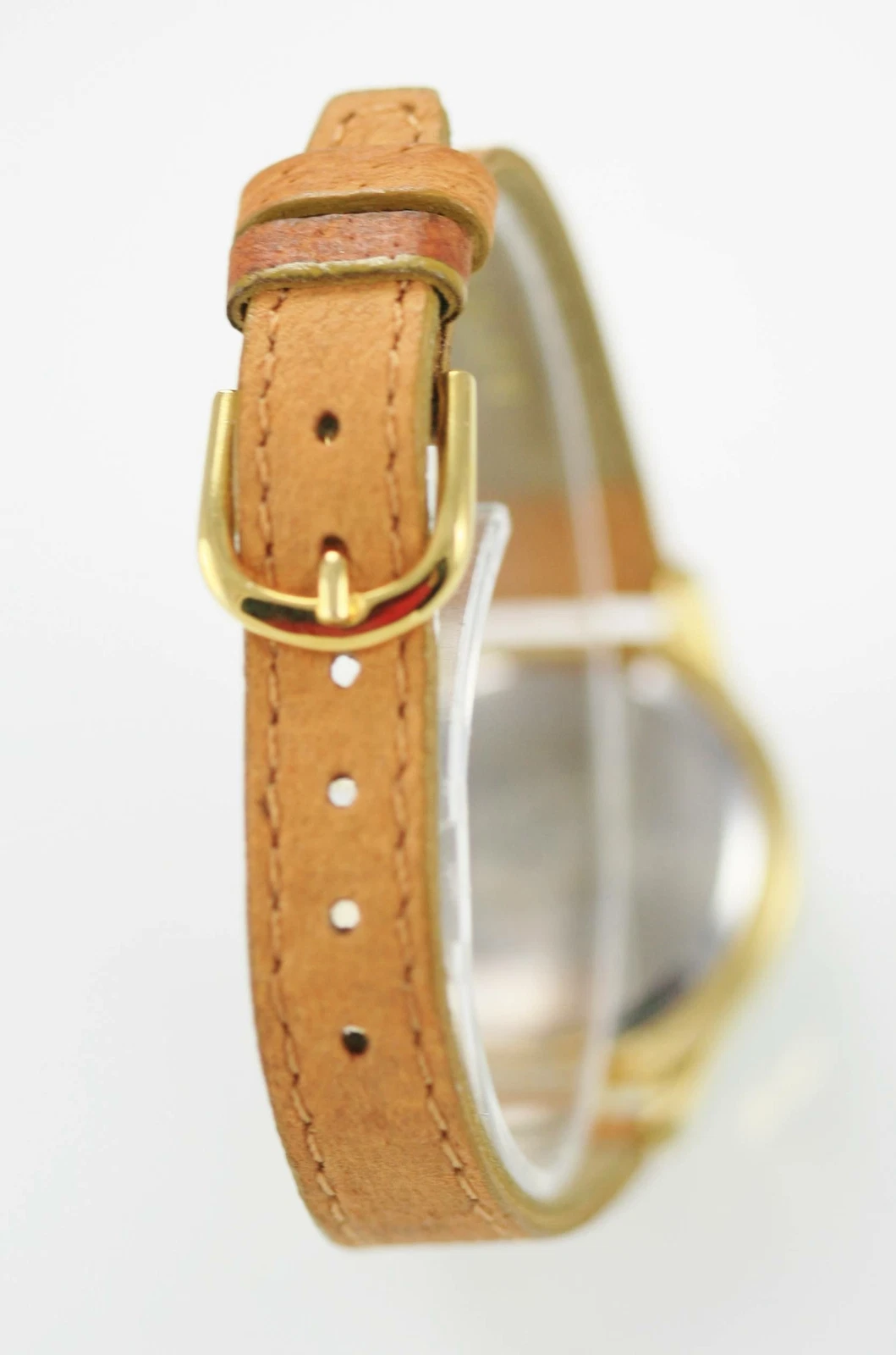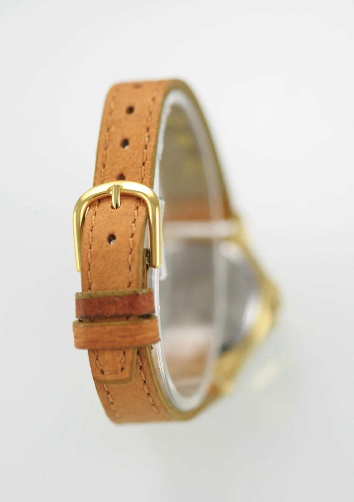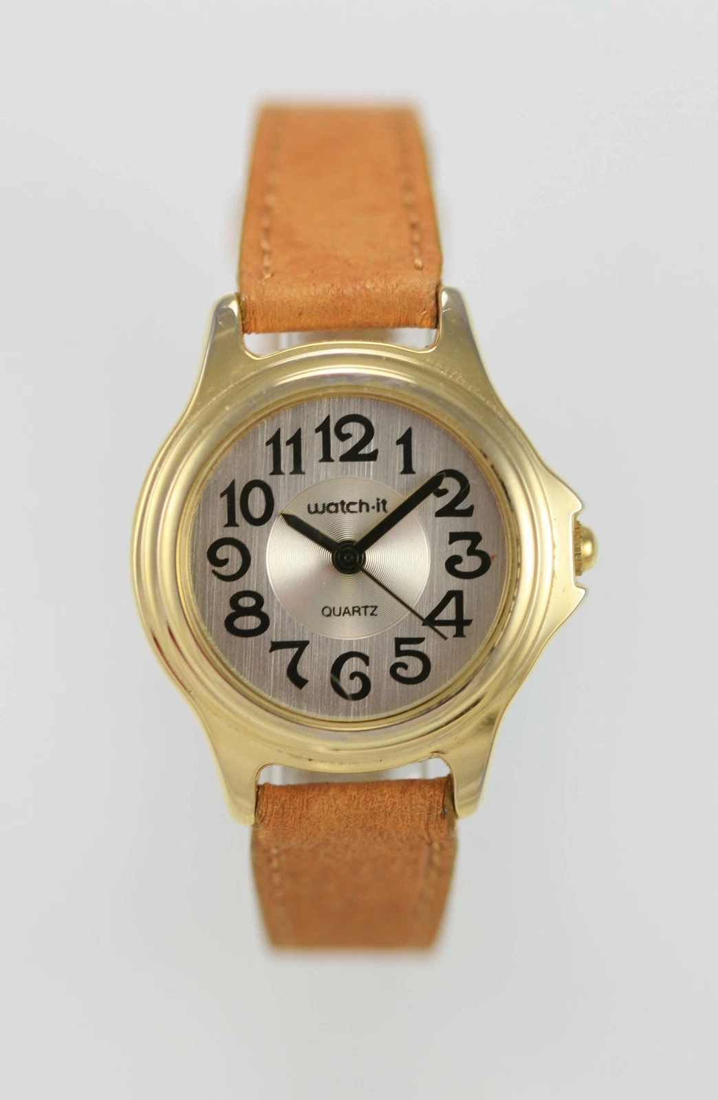 Watchit Womens Watch Stainless Gold Tan Leather Water Resist Batt Silver Quartz