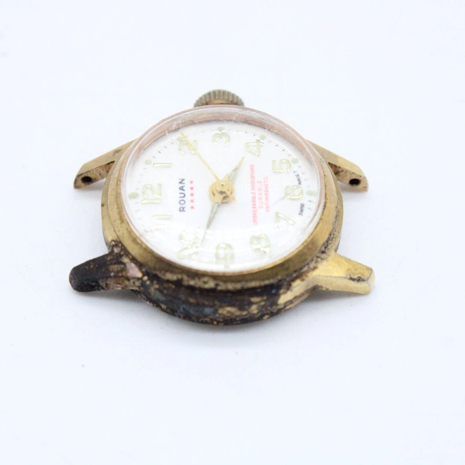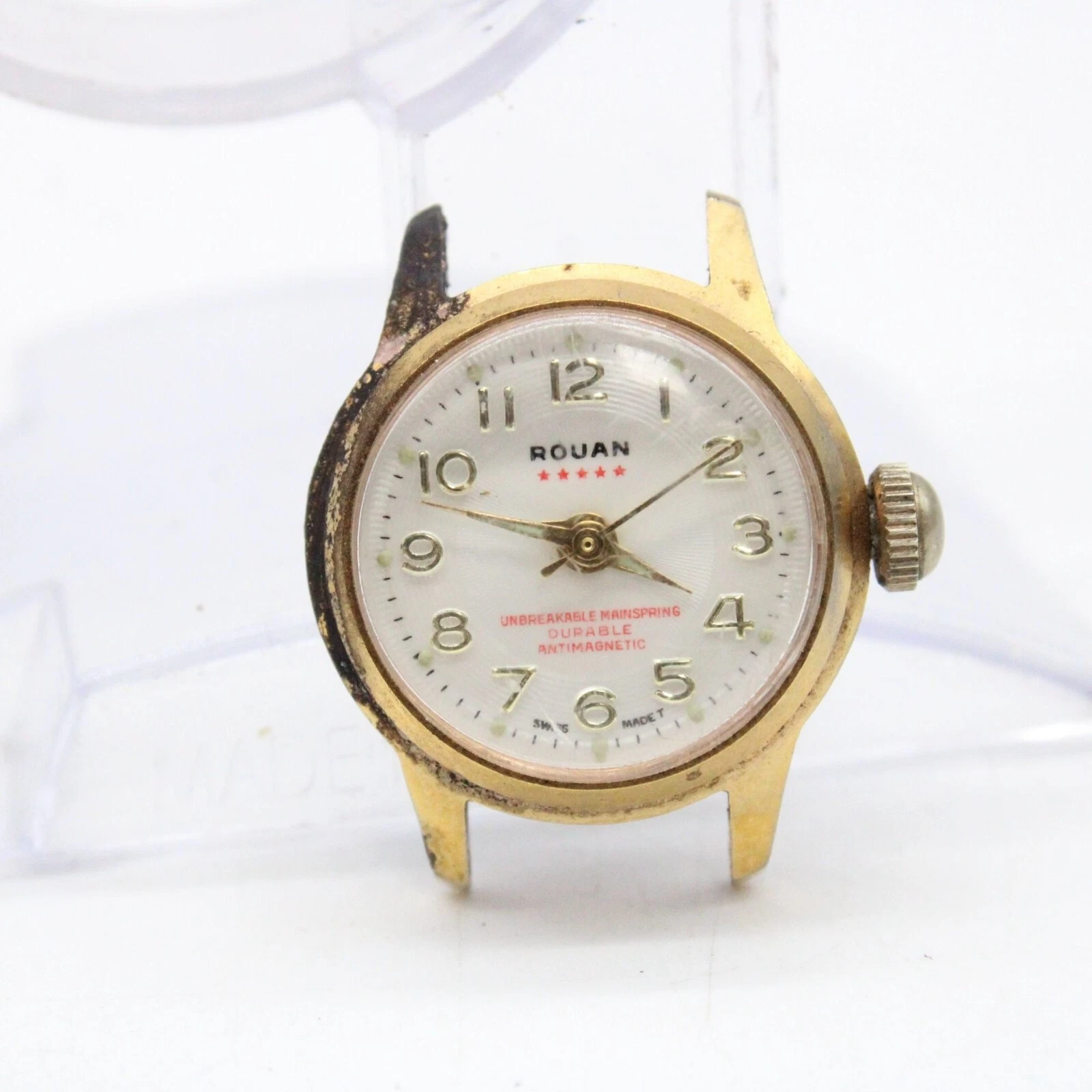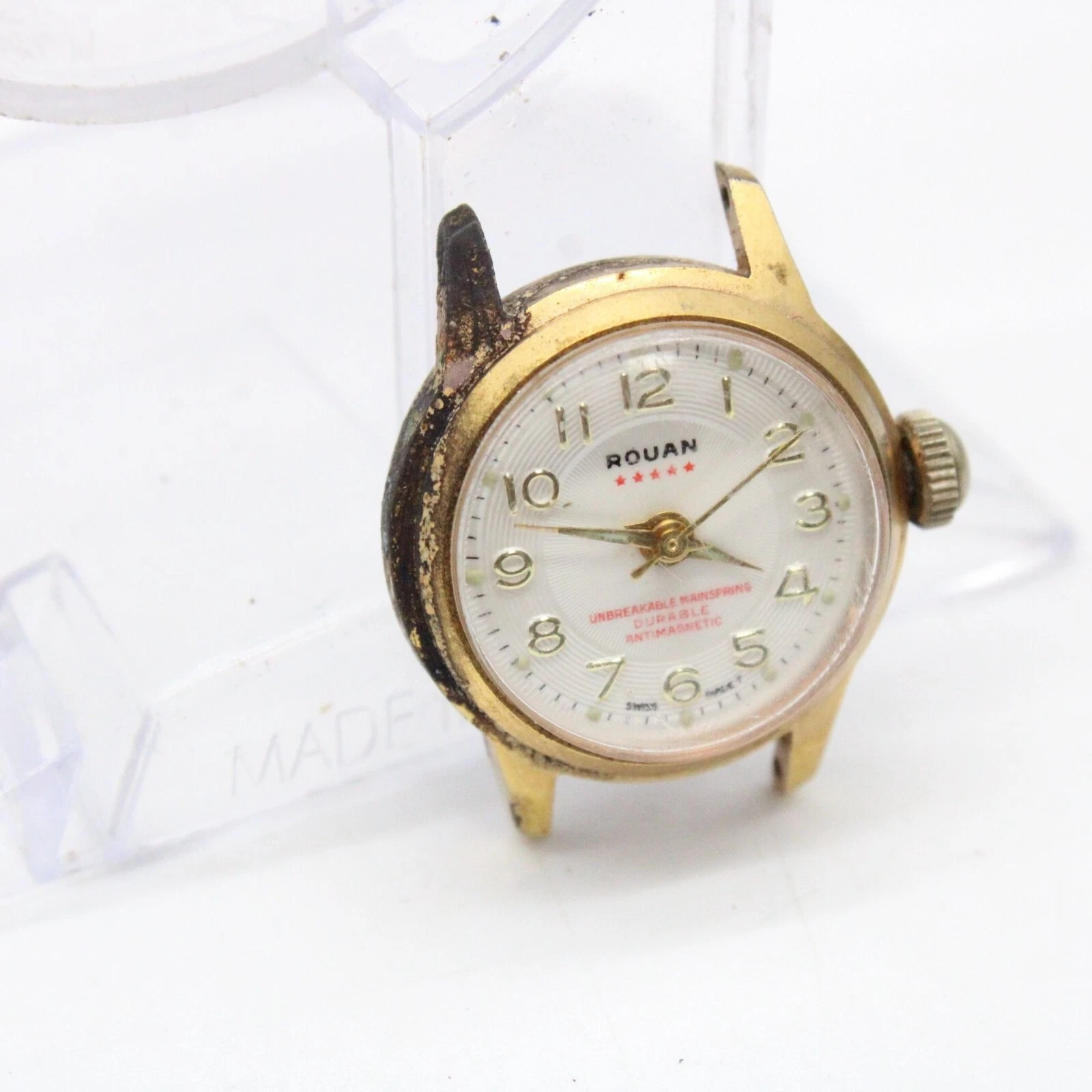Vintage ROUAN Swiss Made Watch Womens Gold Tone Stainless Steel White Dial