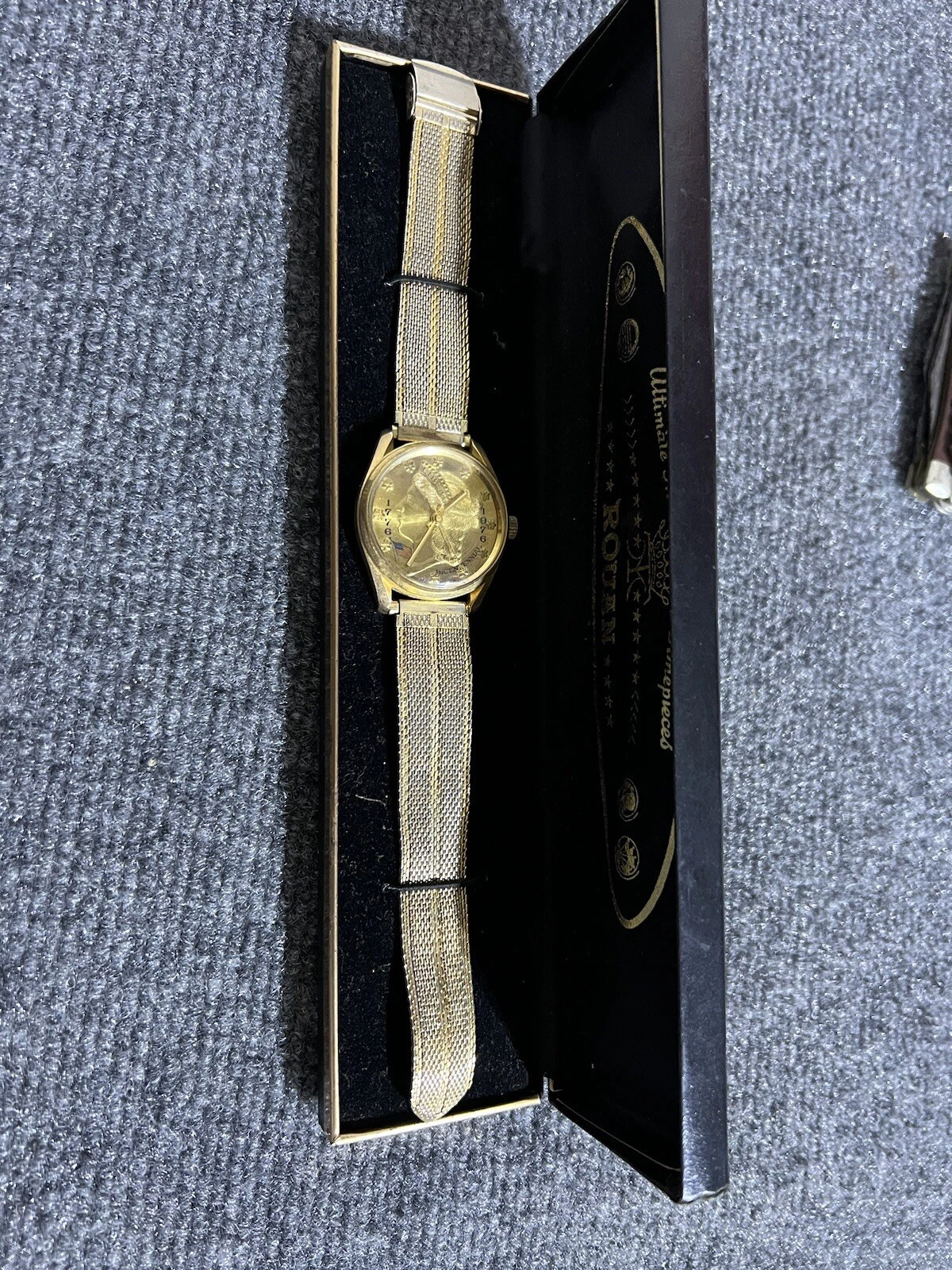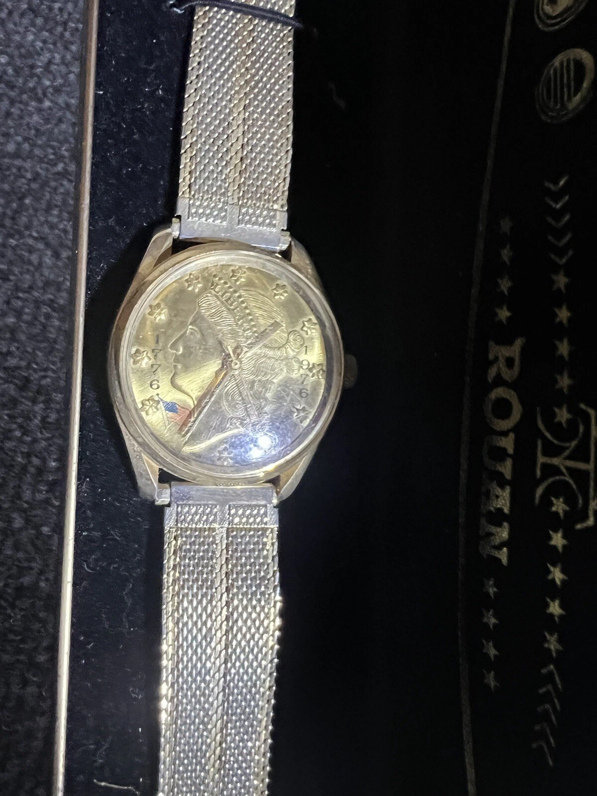 1976 Rouan Bicentennial Coin Mechanical Watch Mens Gold Tone W/Box Vintage
