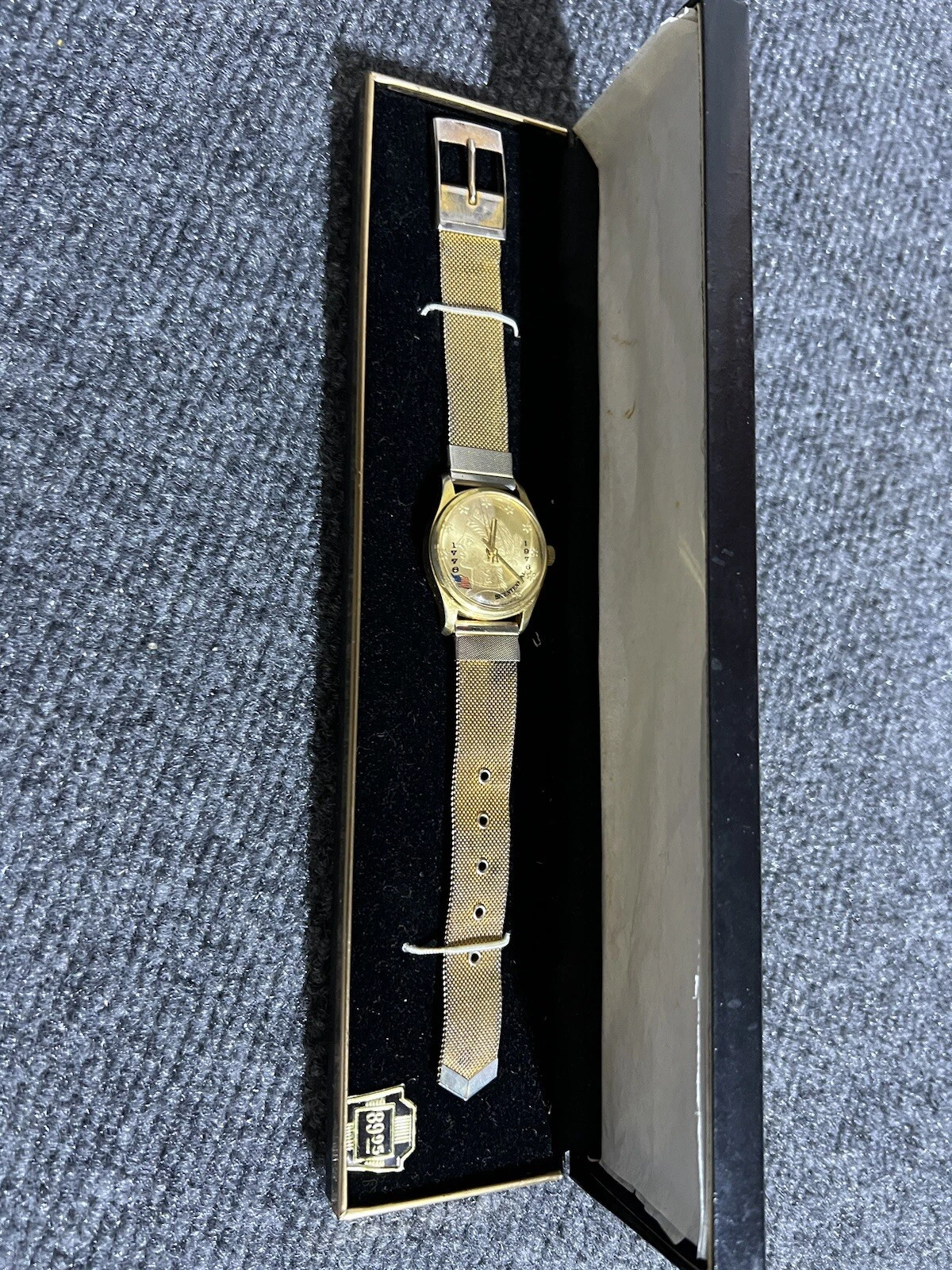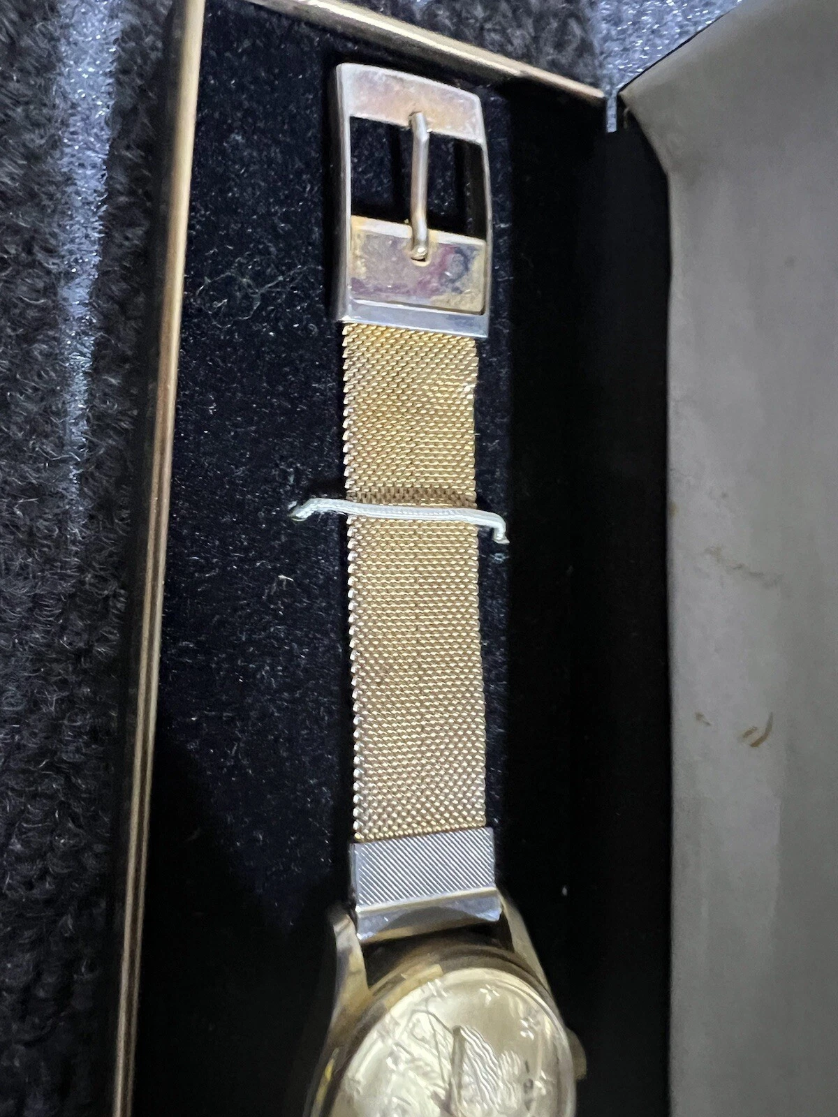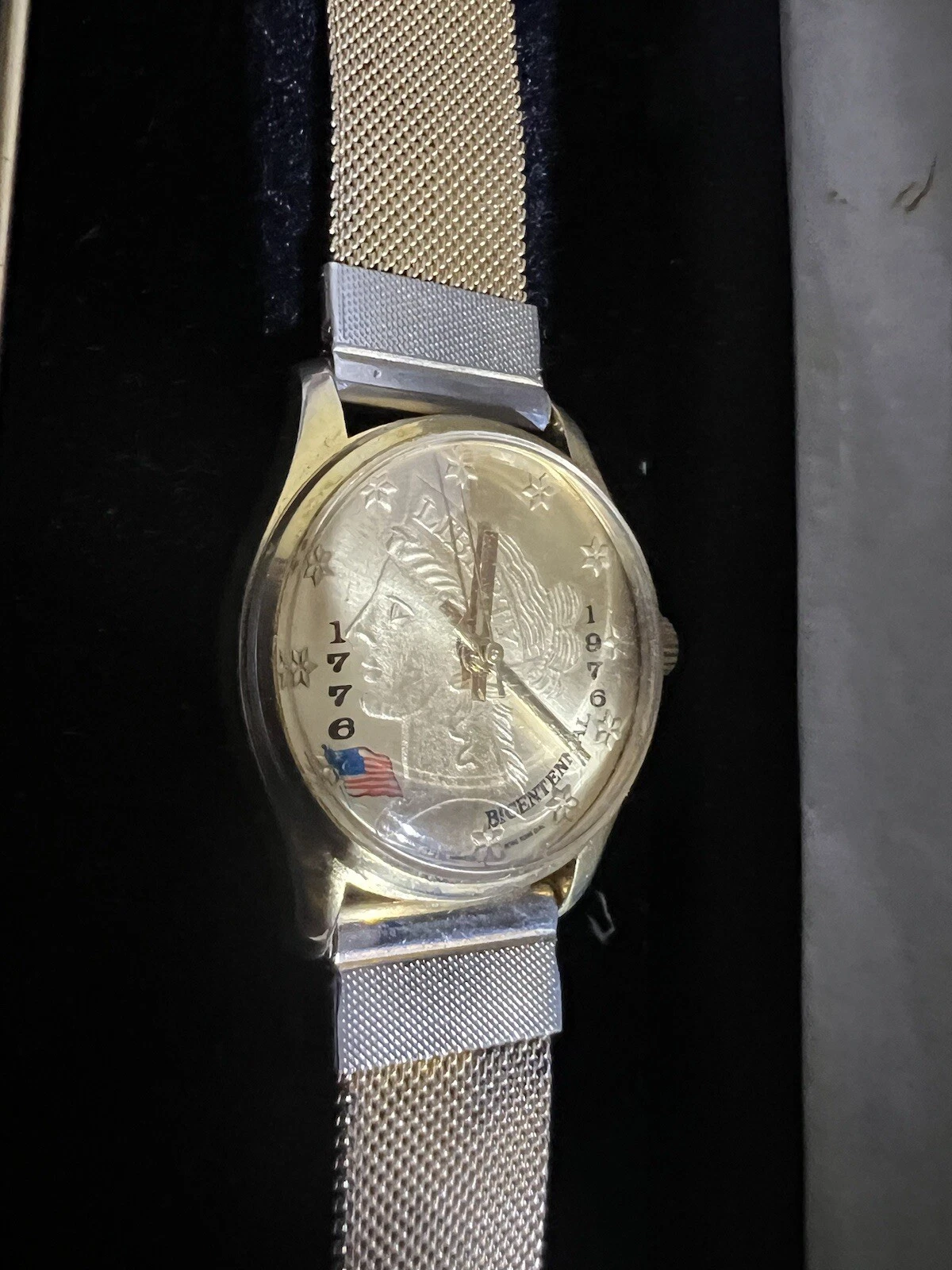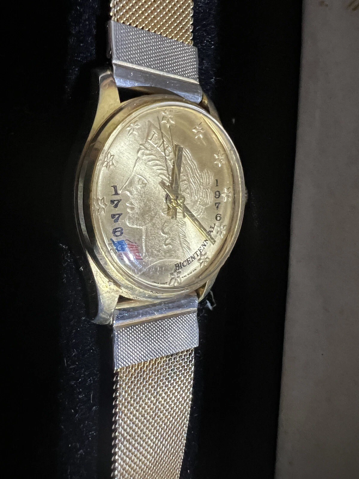 1976 Rouan Bicentennial Coin Mechanical Watch Mens Gold Tone Red Box Vintage