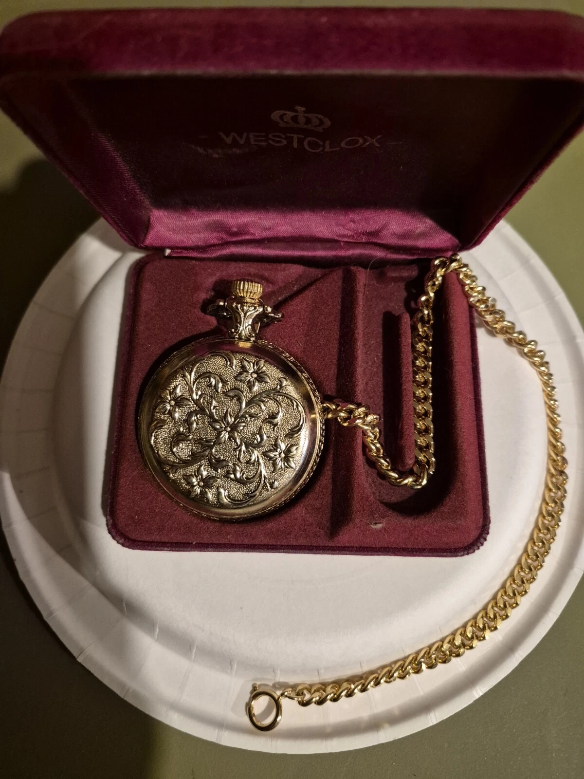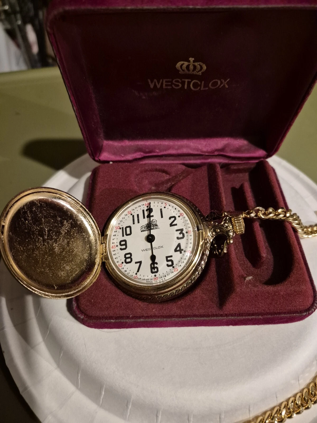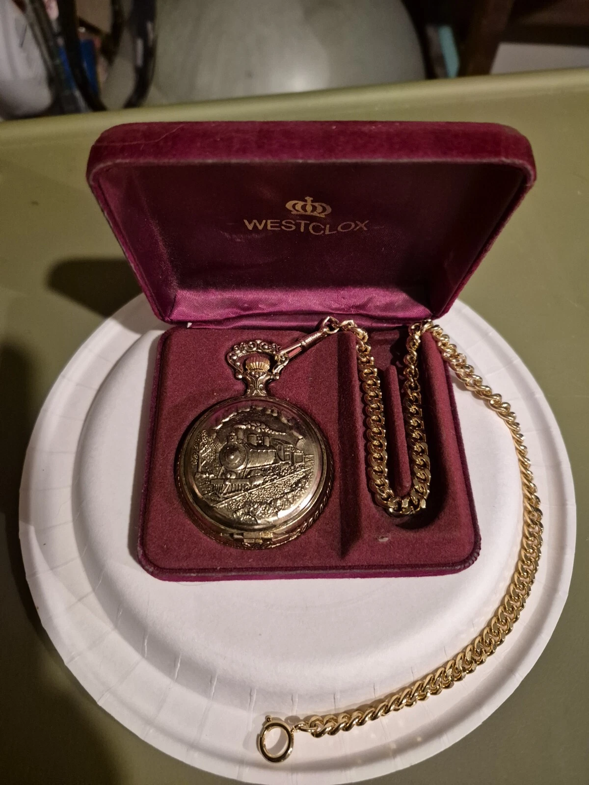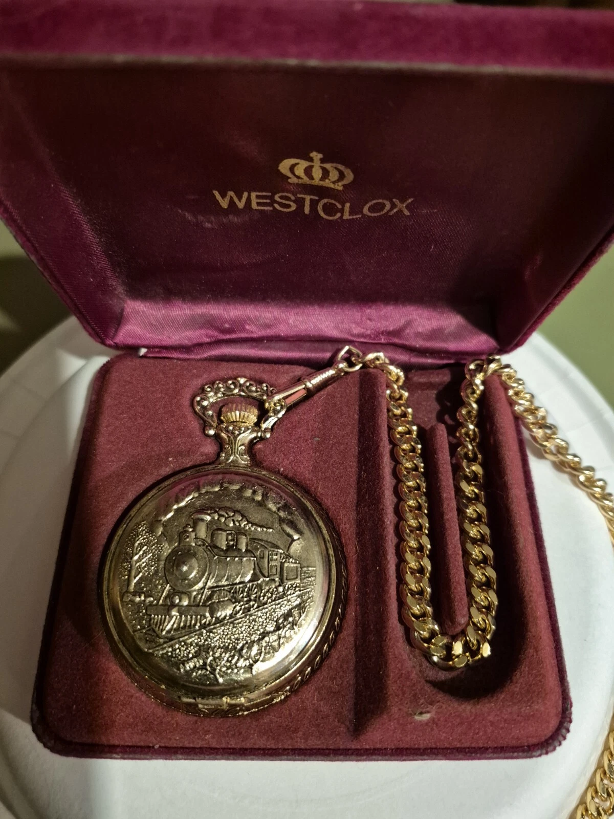 Westclox Pocket Watch - Full In Original Box With Chain- Steam Train Engraving
