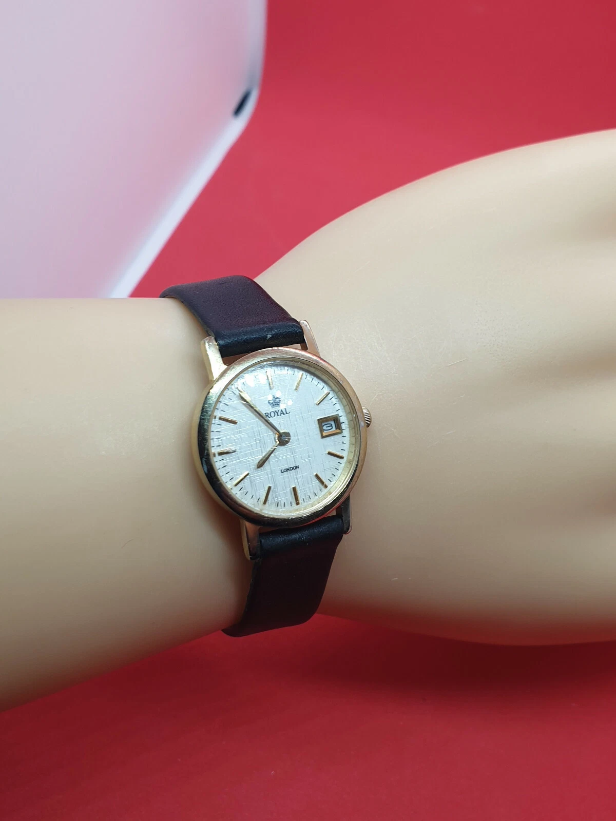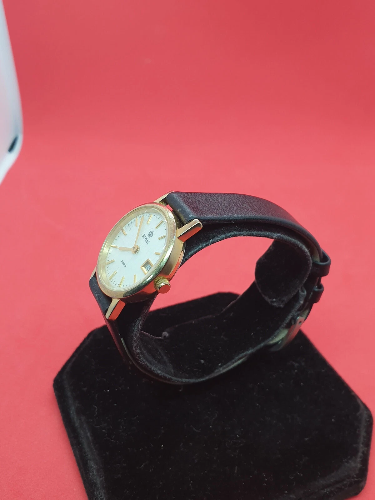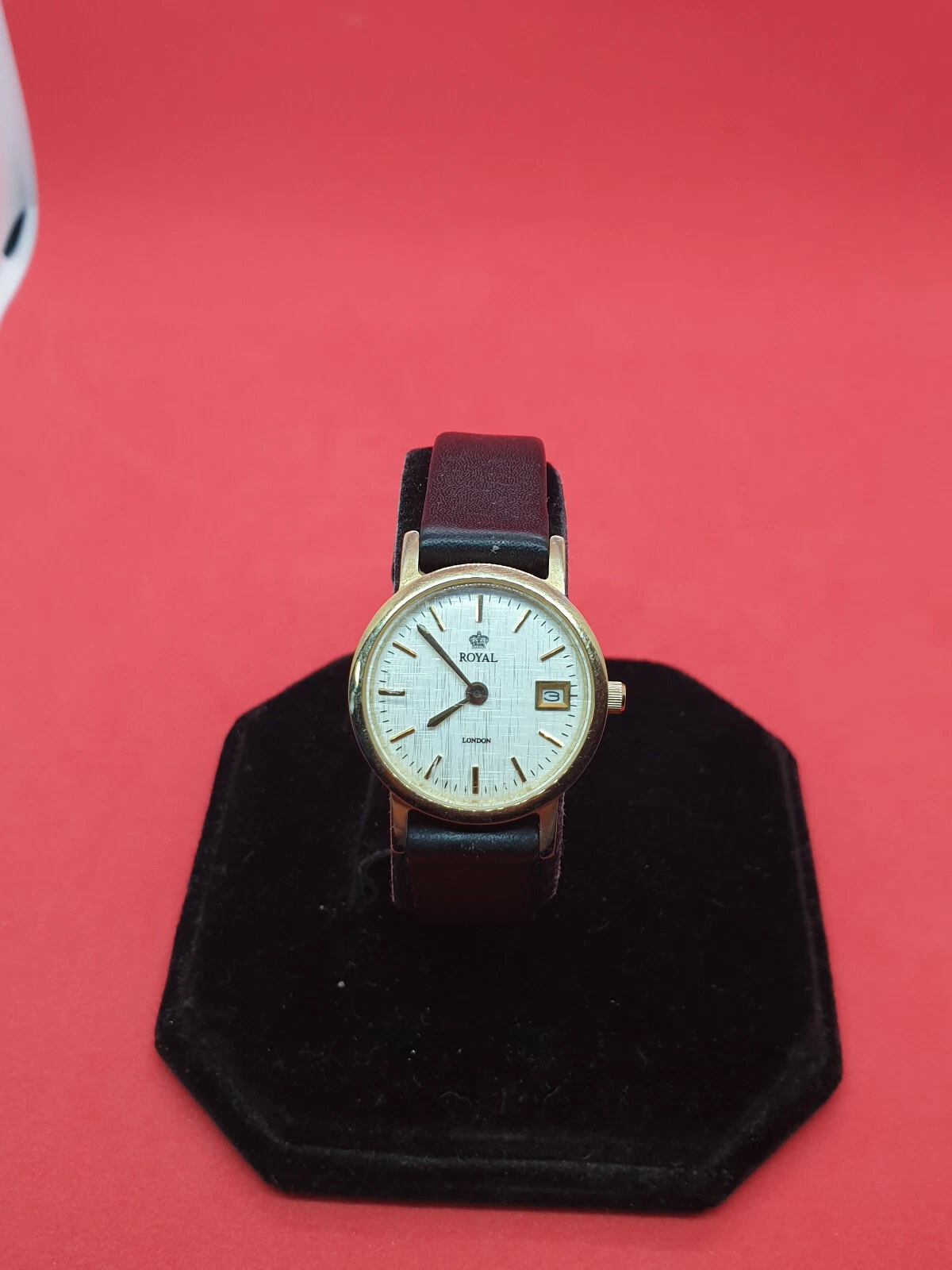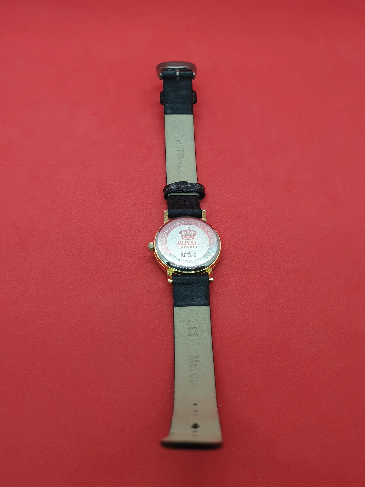 ladies royal london gold tone watch with date display window,black strap.#136.