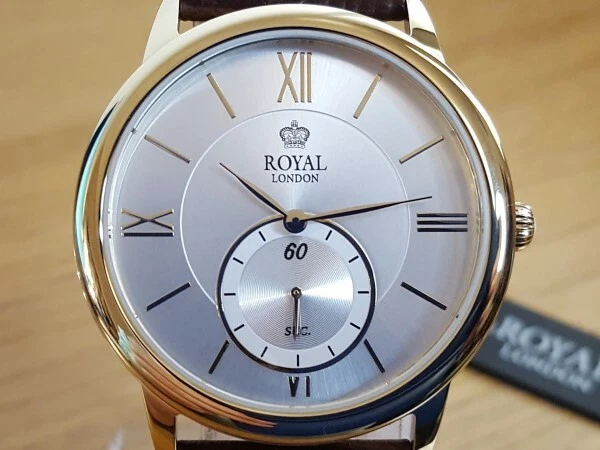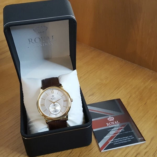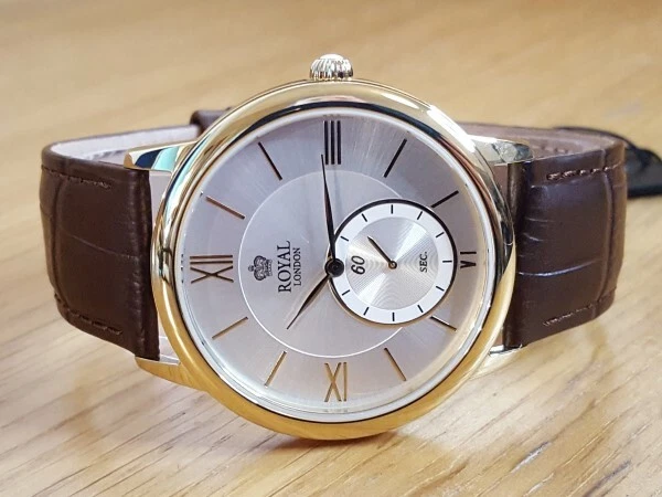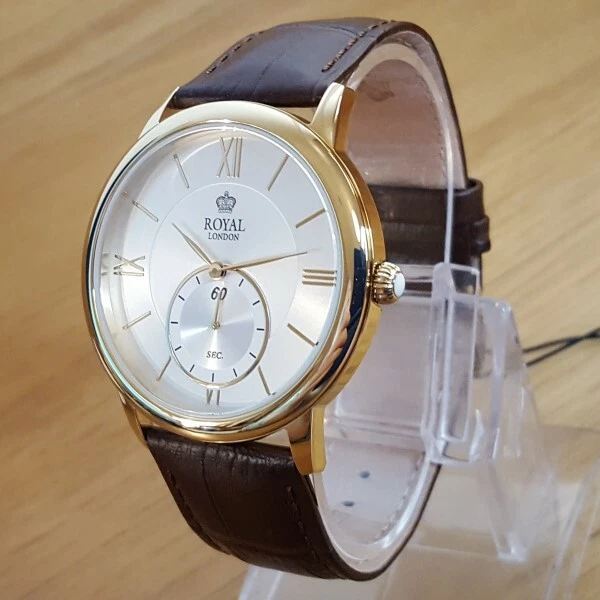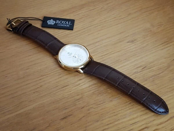 Mens Classic Brown Leather Royal London Gold Gents Suit Watch NEW IN BOX