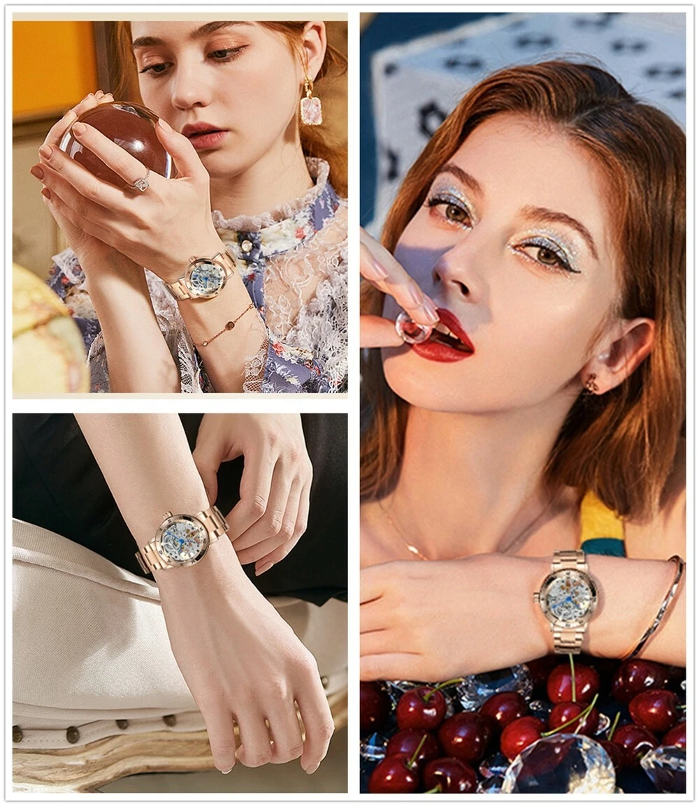 Mechanical Watch Women's Gear Roman Hollow Out Hand-Wind Rose-Gold Wristwatches