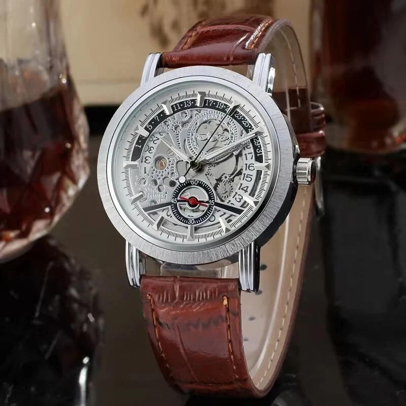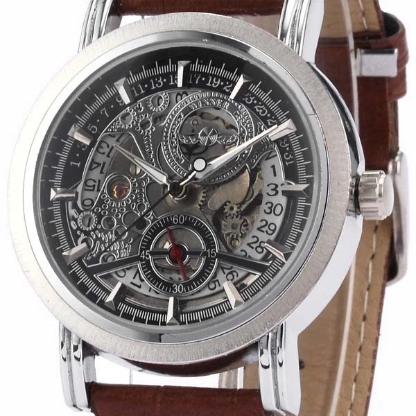 Winner Automatic Stainless Steel Skeleton Mechanical Watch Brown Leather Strap