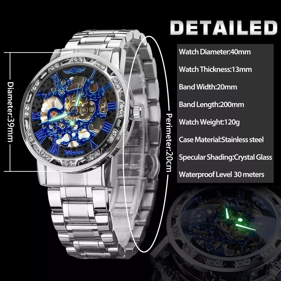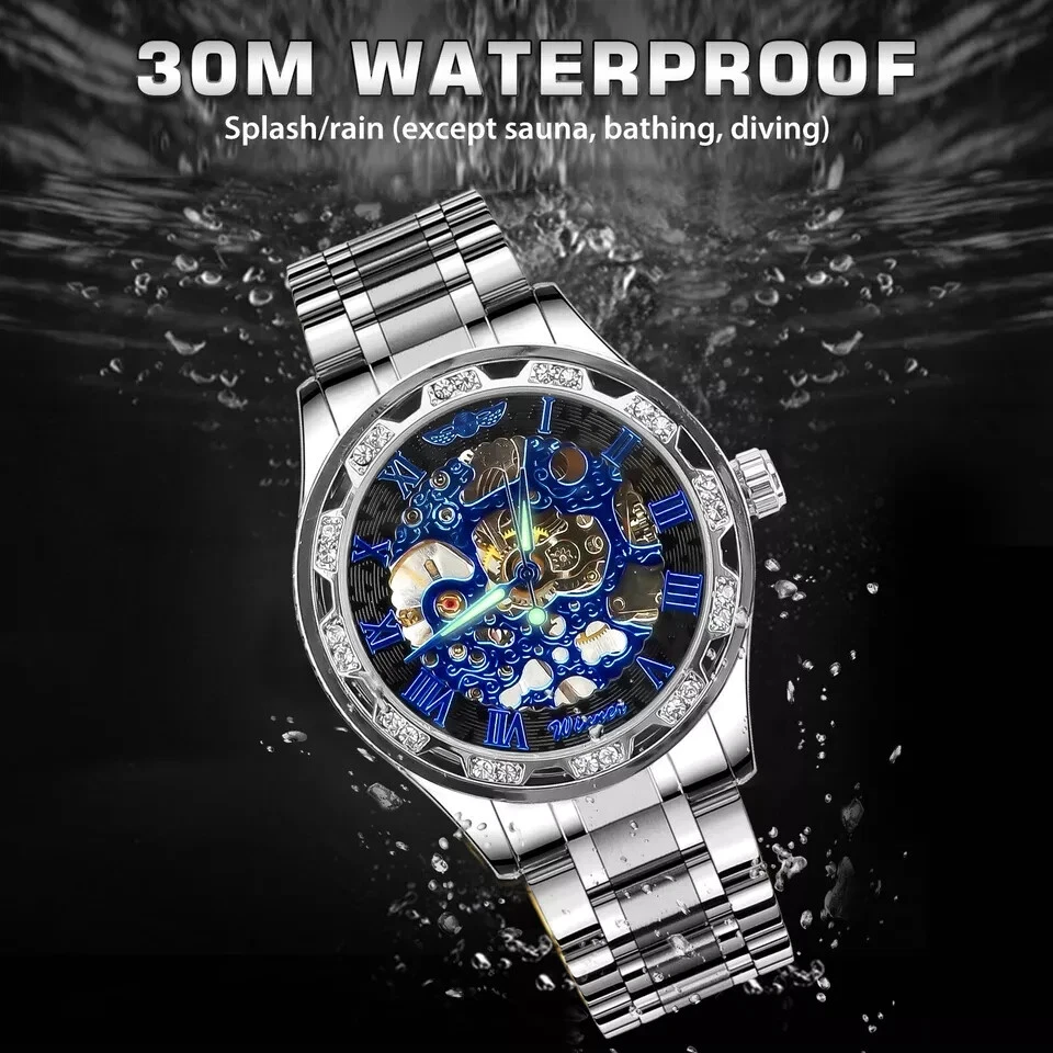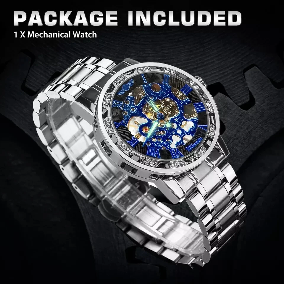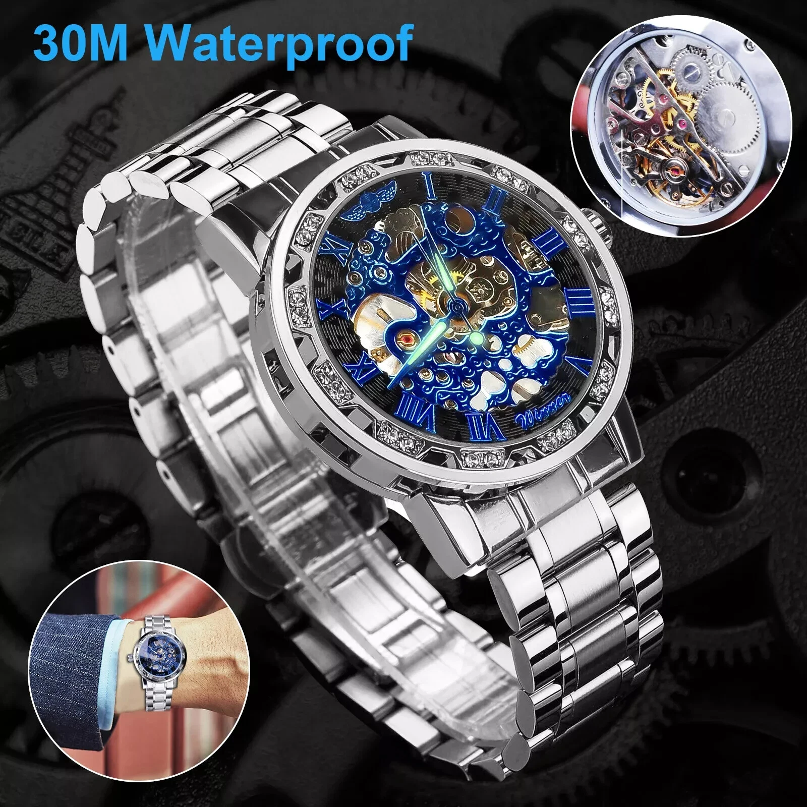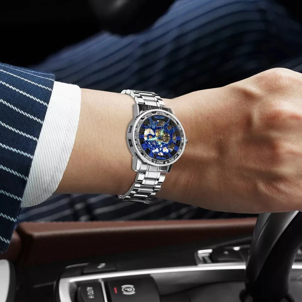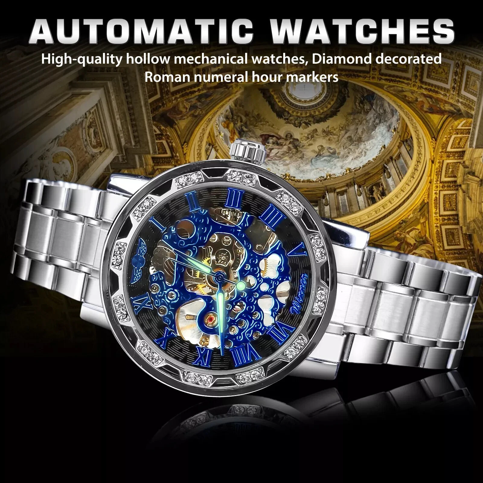 Men's Automatic Mechanical Wrist Watch Stainless Steel Blue Dial Skeleton Luxury