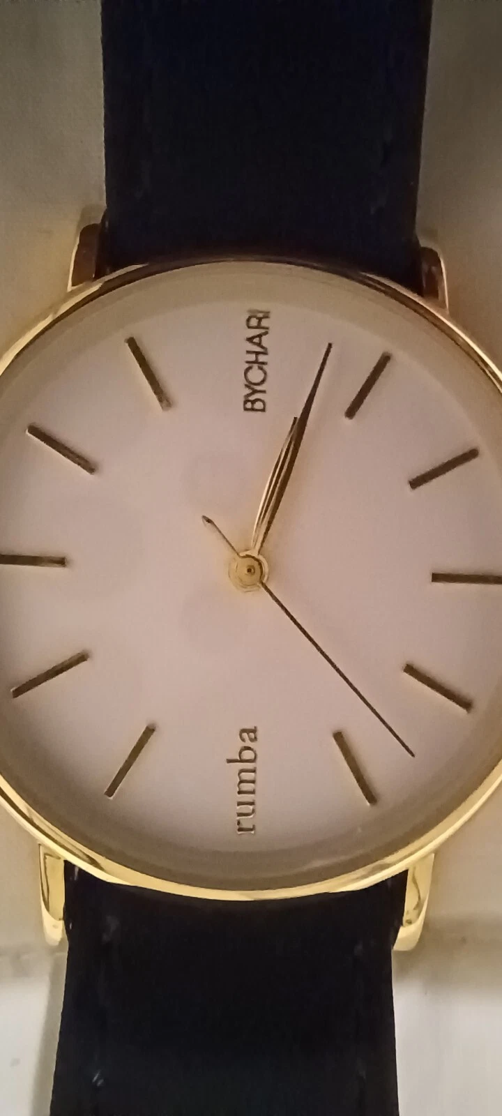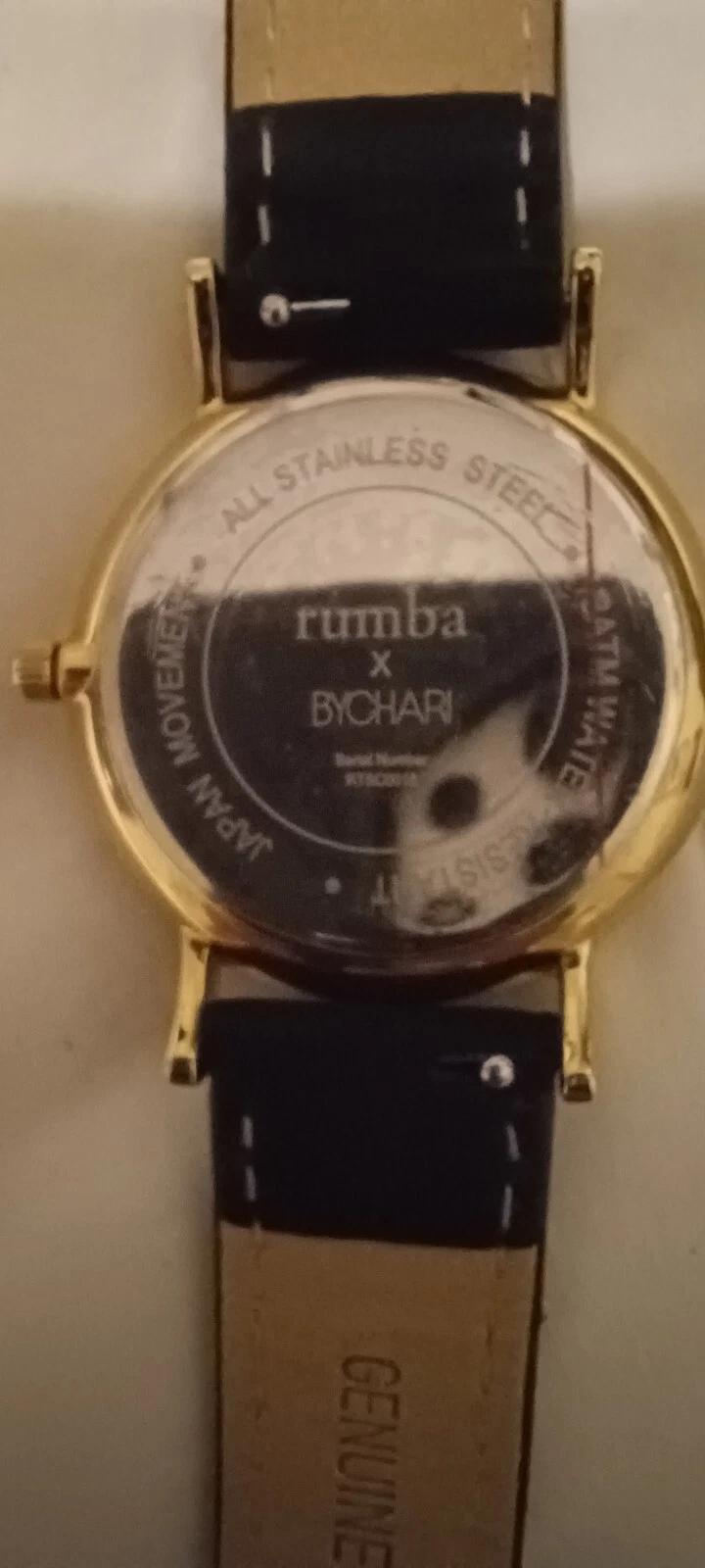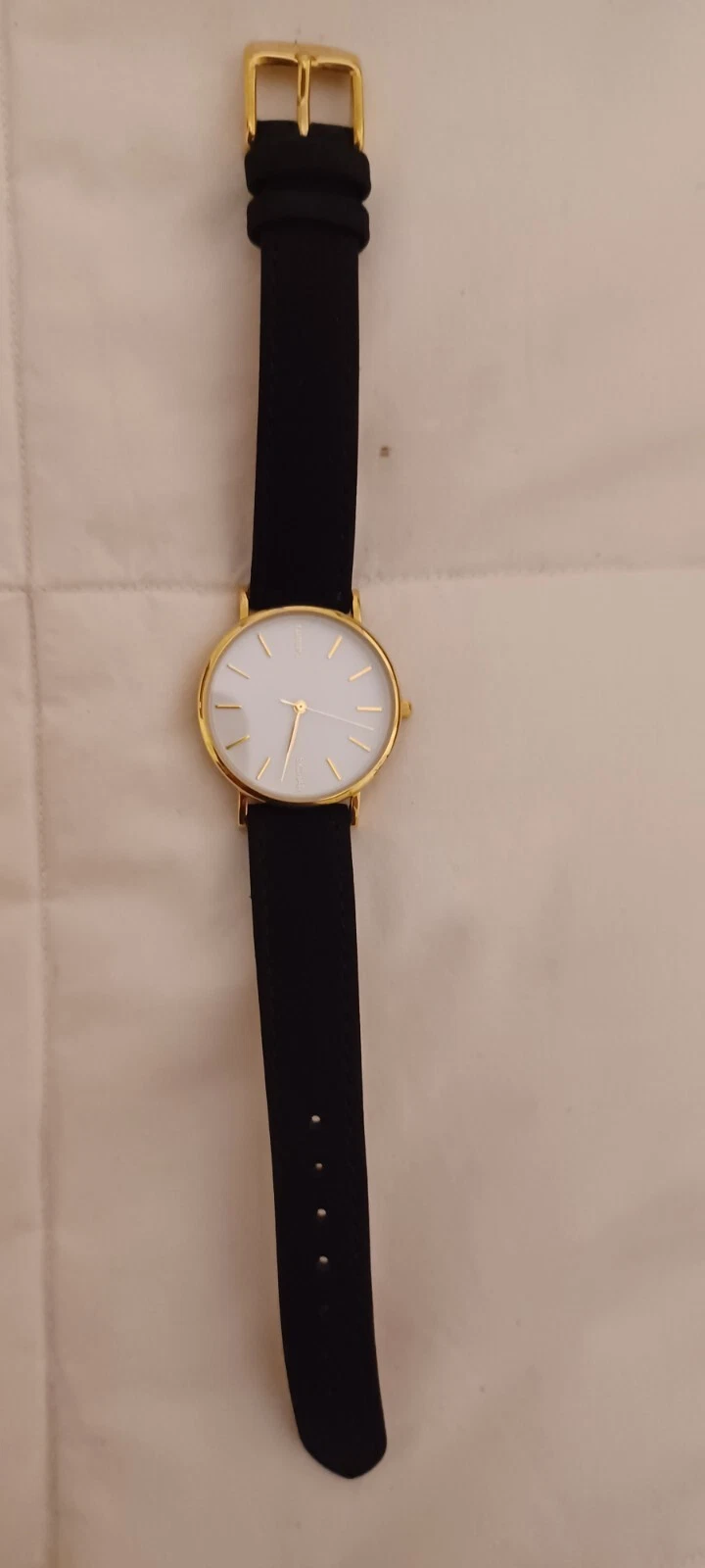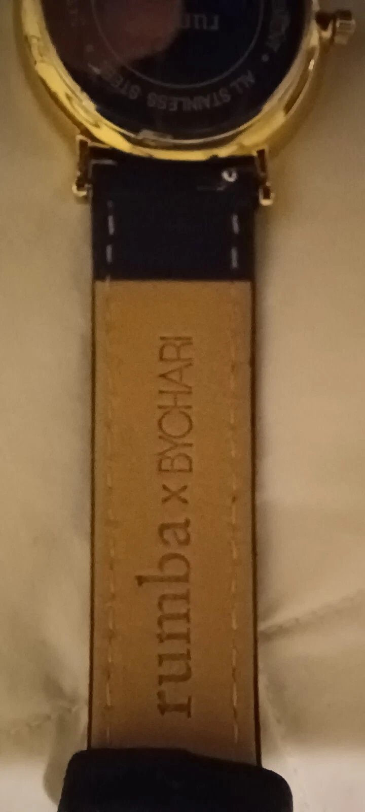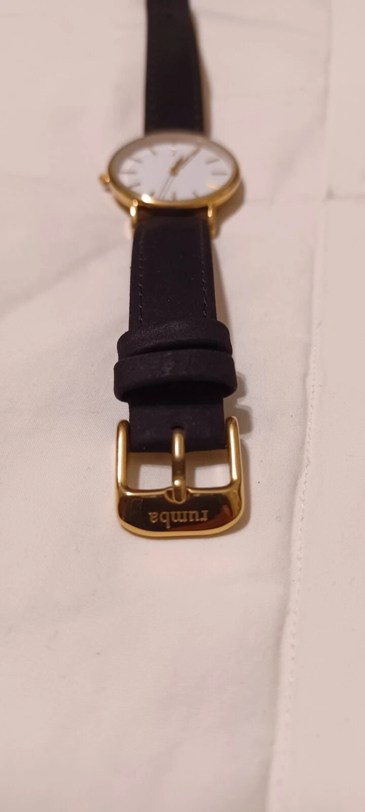 Rumba X Bychari Watch white dial gold and black leather suede band.