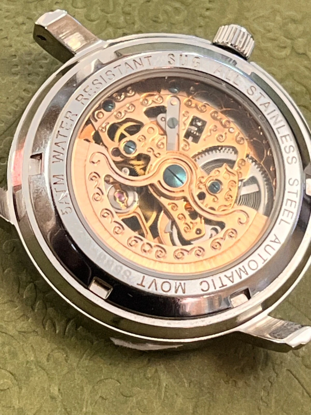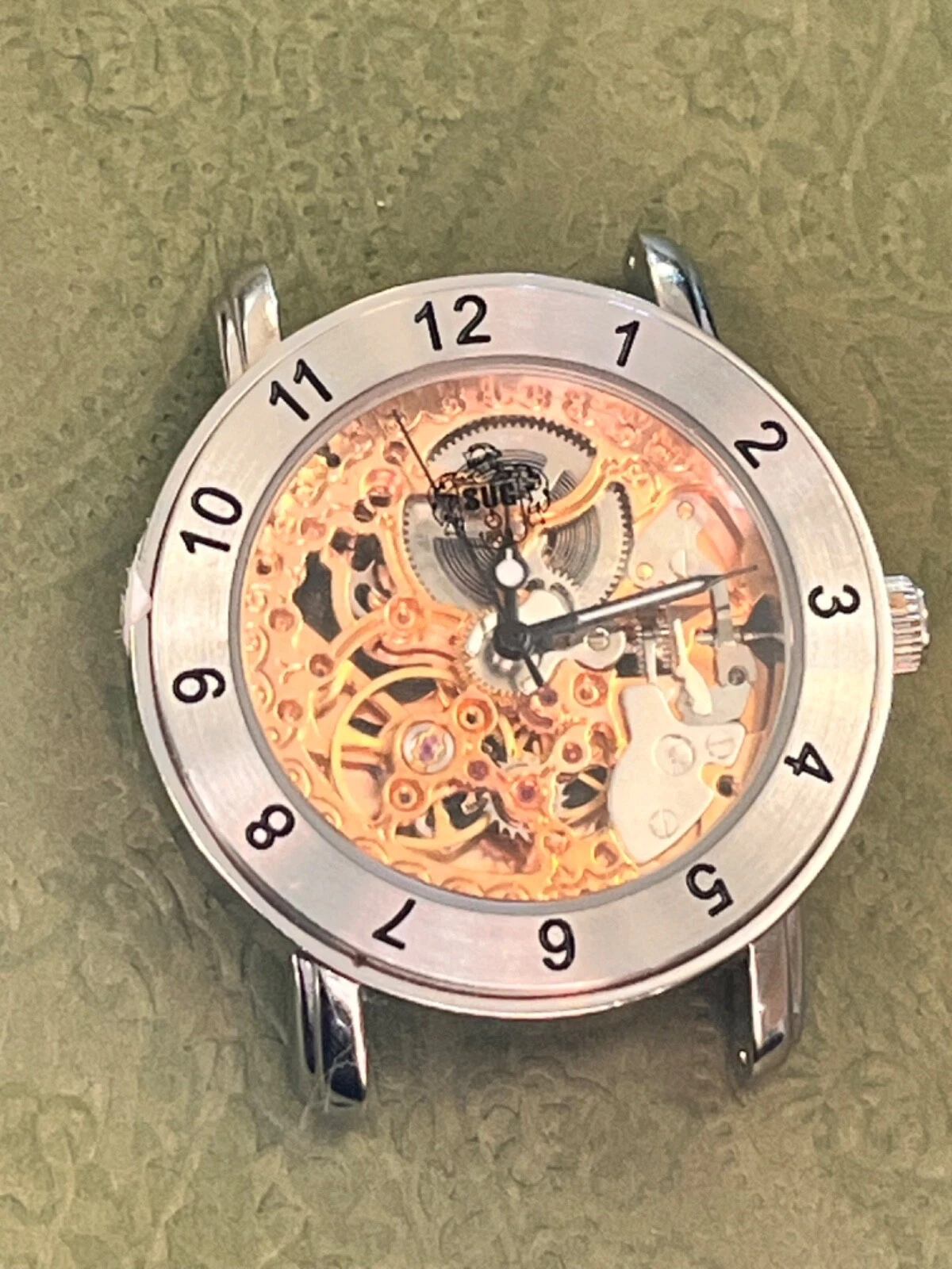 SUG AUTOMATIC SKELETON GOLD TONE WATCH 21 JEWELS MOVEMENT BLUE LEATHER