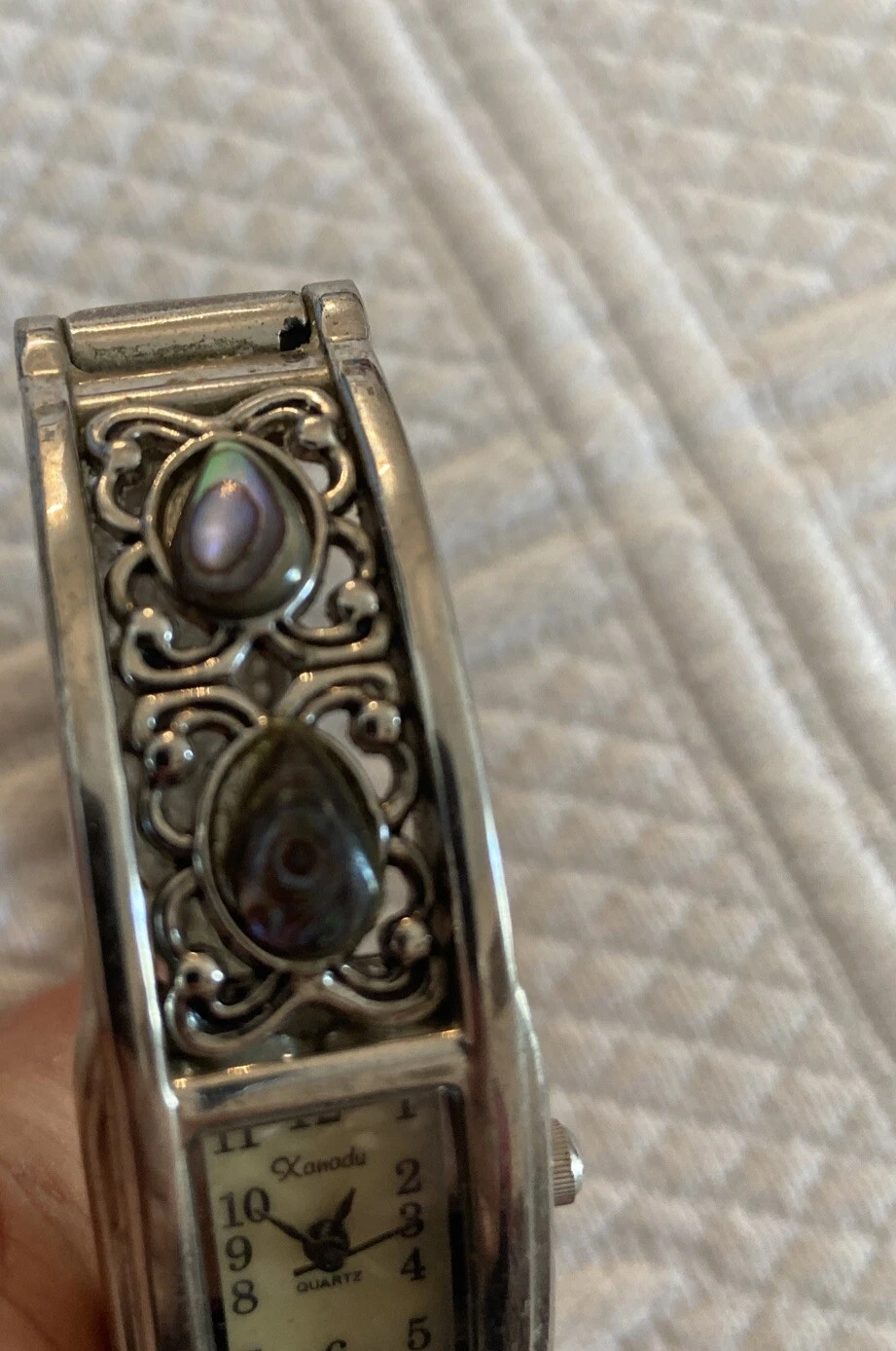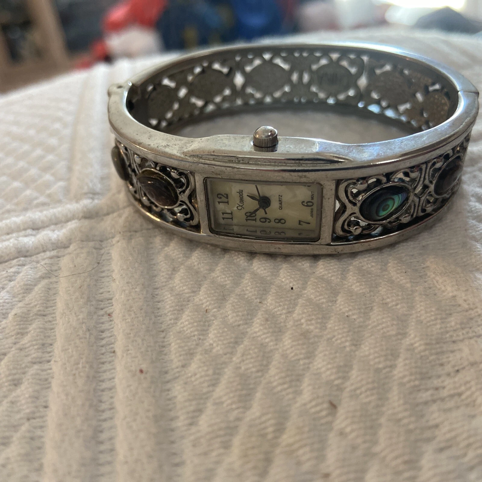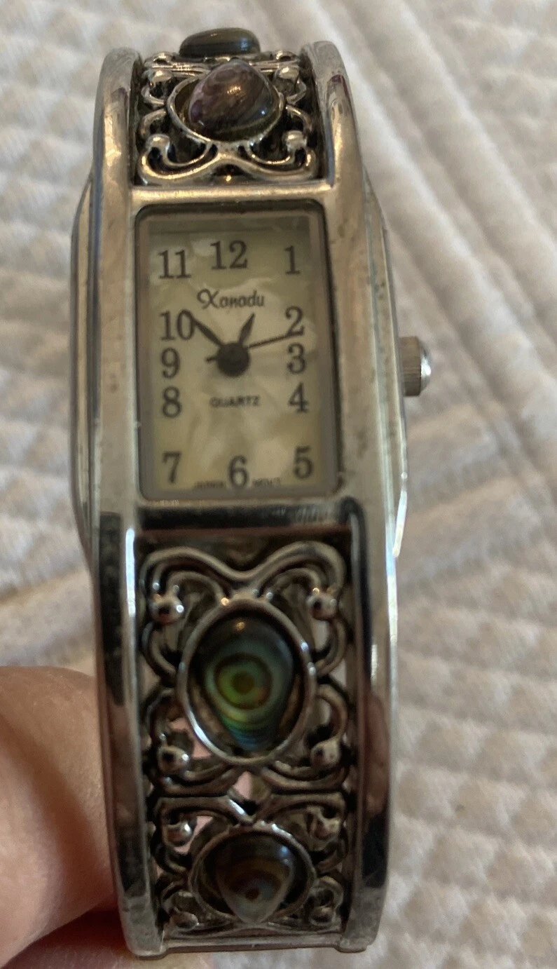 Vtg Xanadu Watch Women Silver Tone MOP Hinged Cuff 6.75" Japan Movement