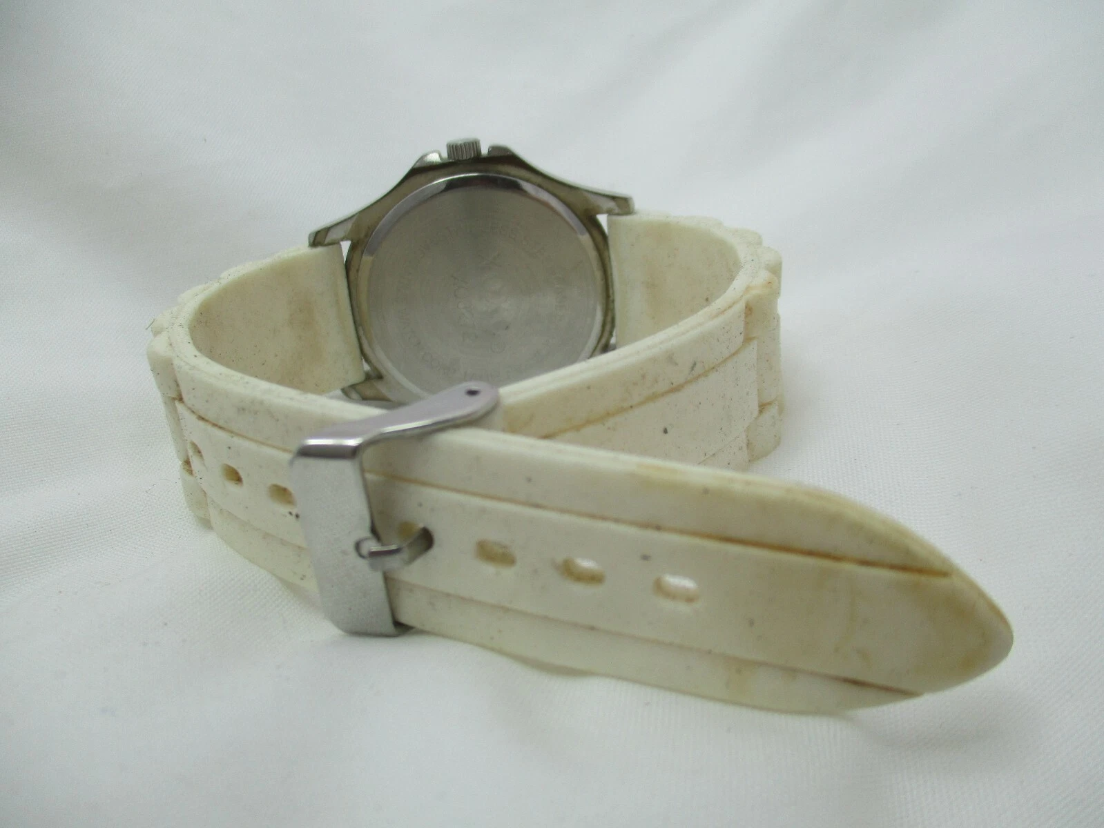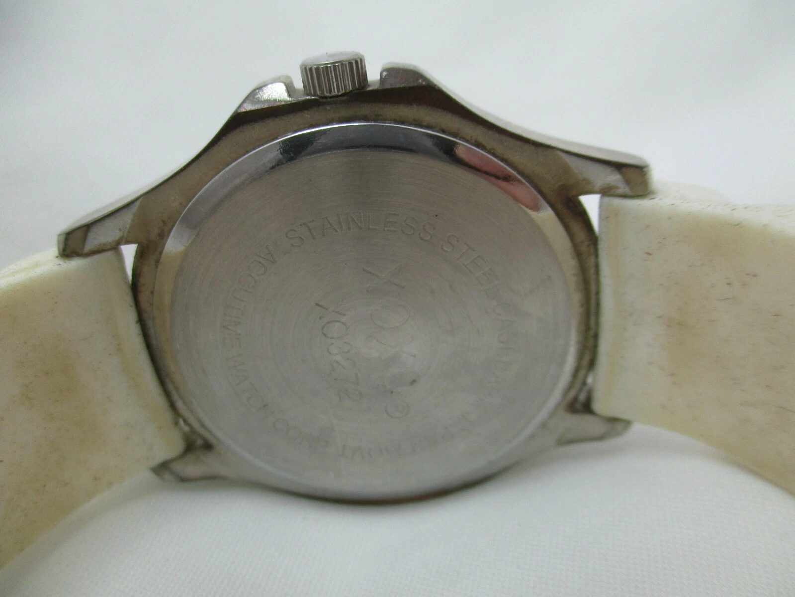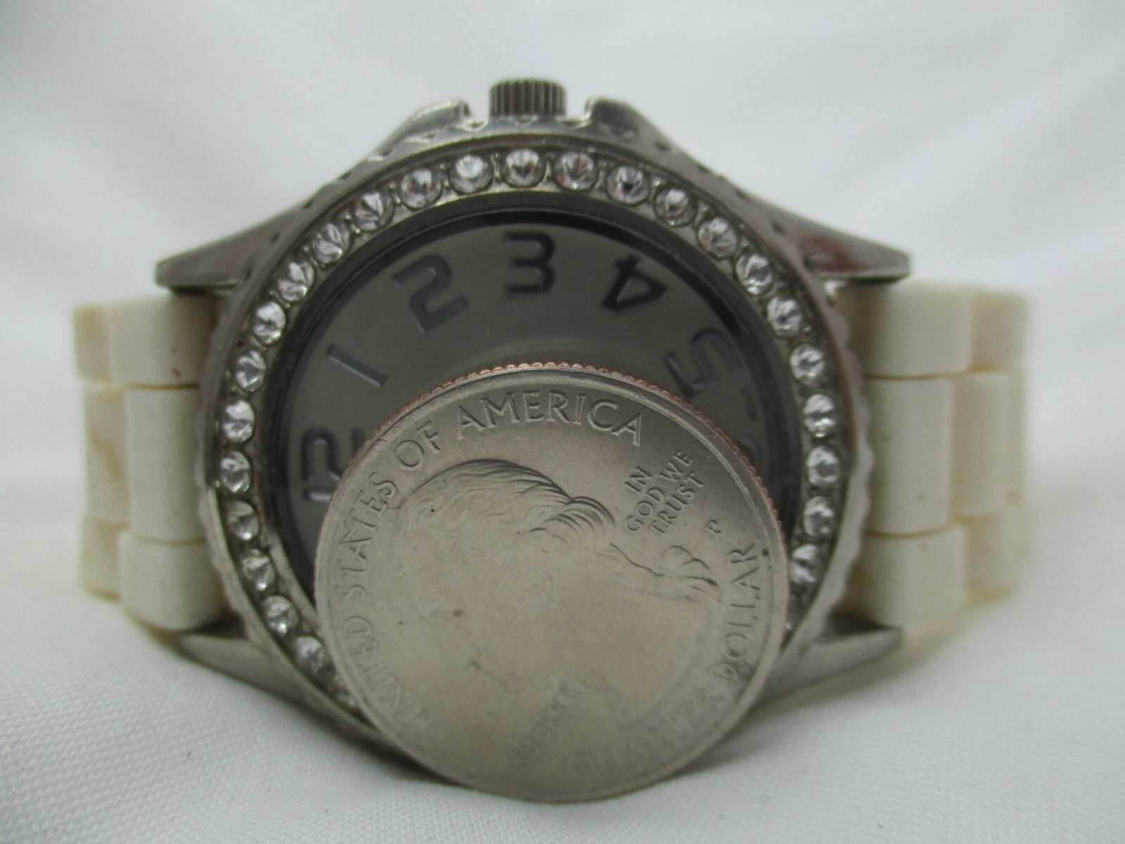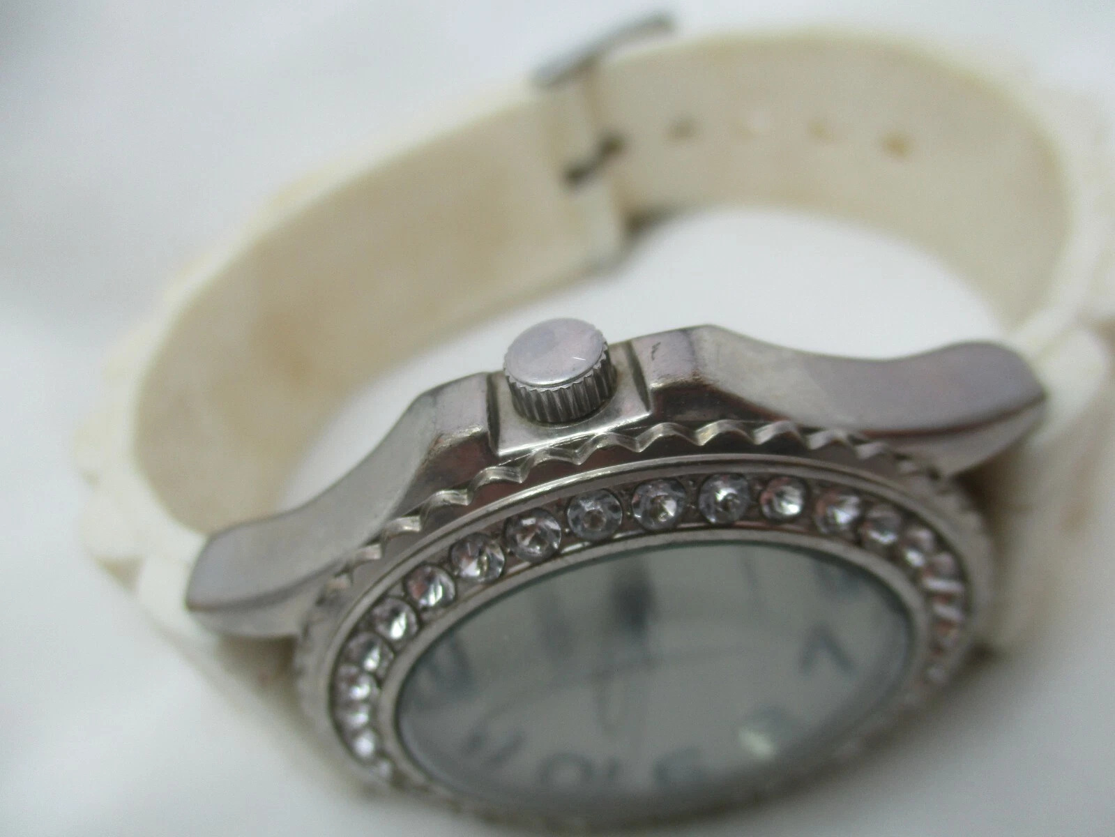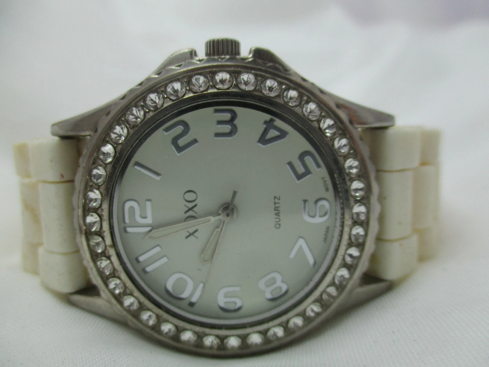 Xoxo Analog Wristwatch Round Face Silver Tone White Buckle Band Rhinestones