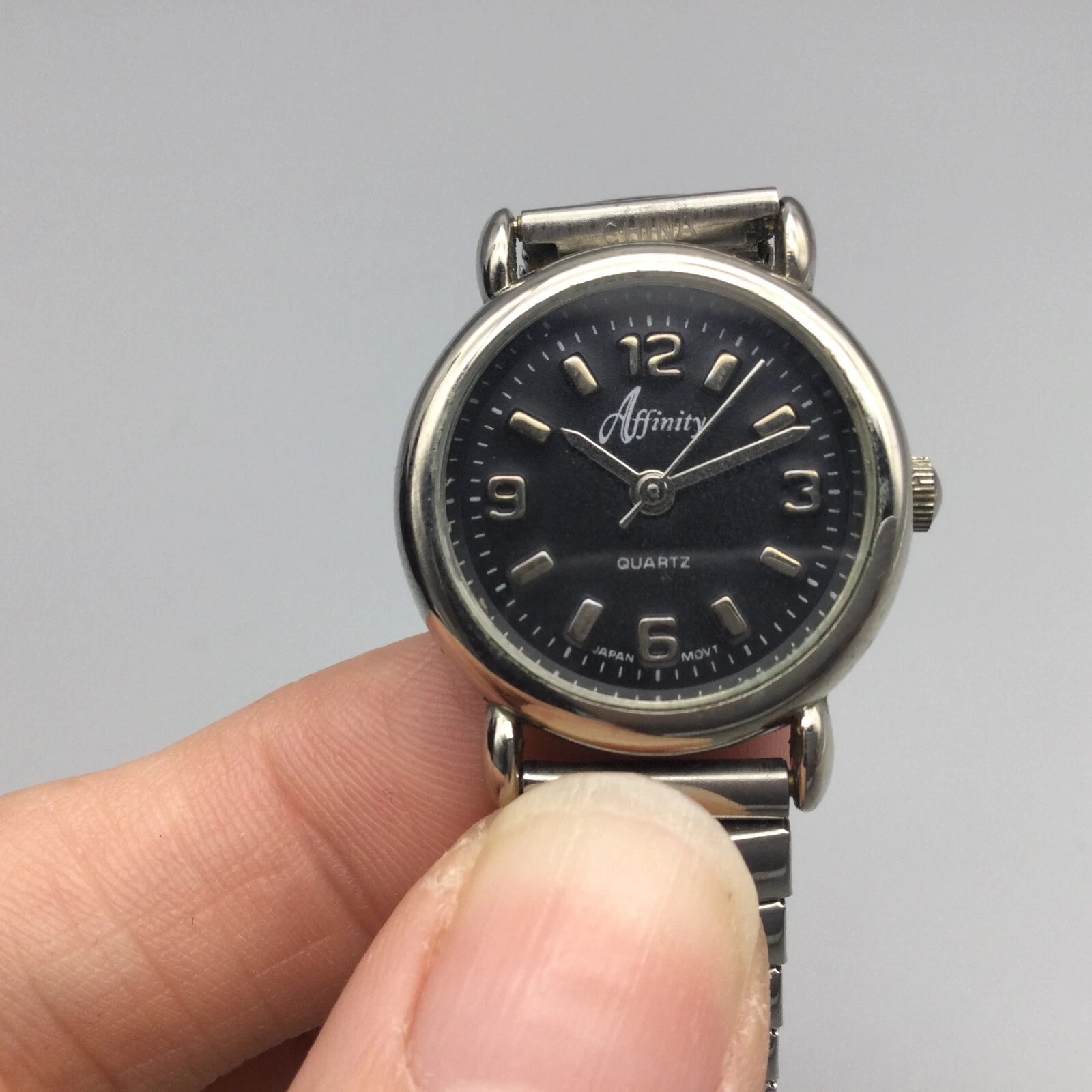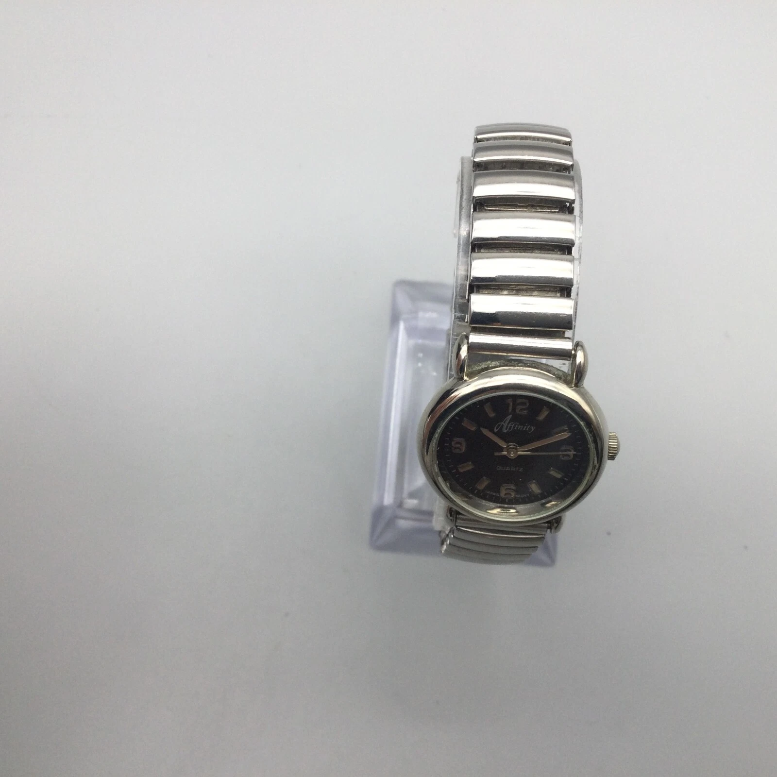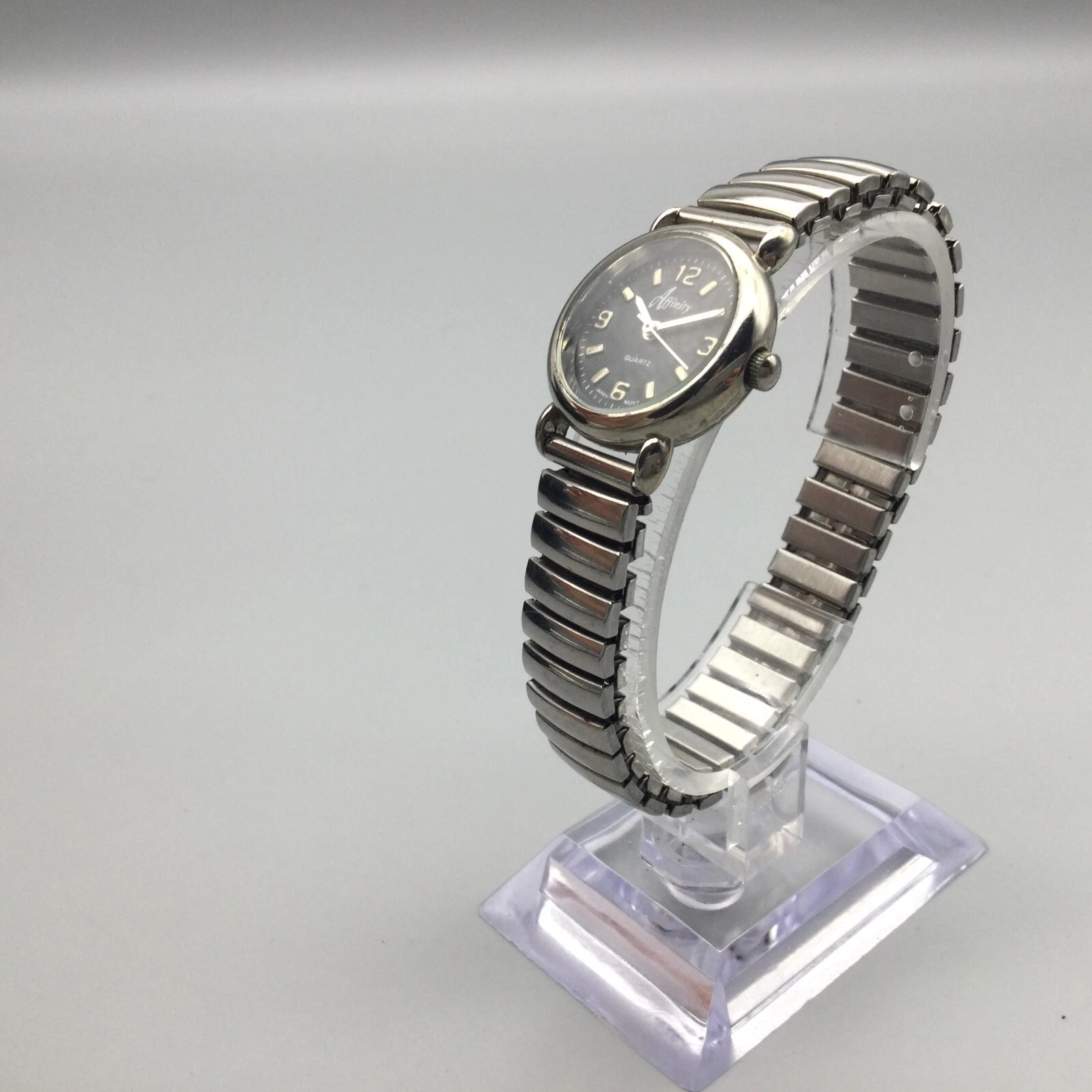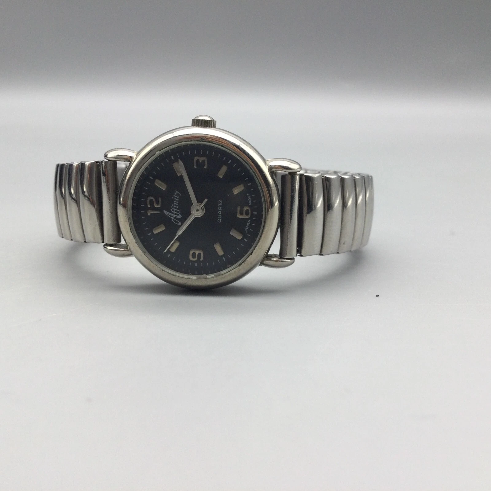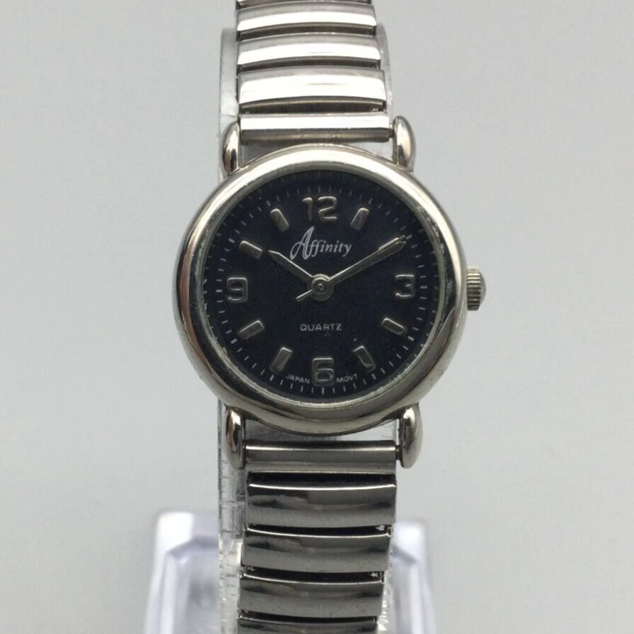 Vintage Affinity Watch Women 23mm Silver Tone Black Dial Stretch New Battery