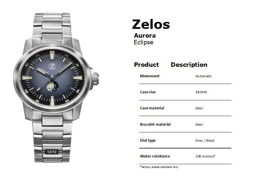 Zelos Aurora_Moonphase_Eclipse_Grey - New in box (unworn with seal)