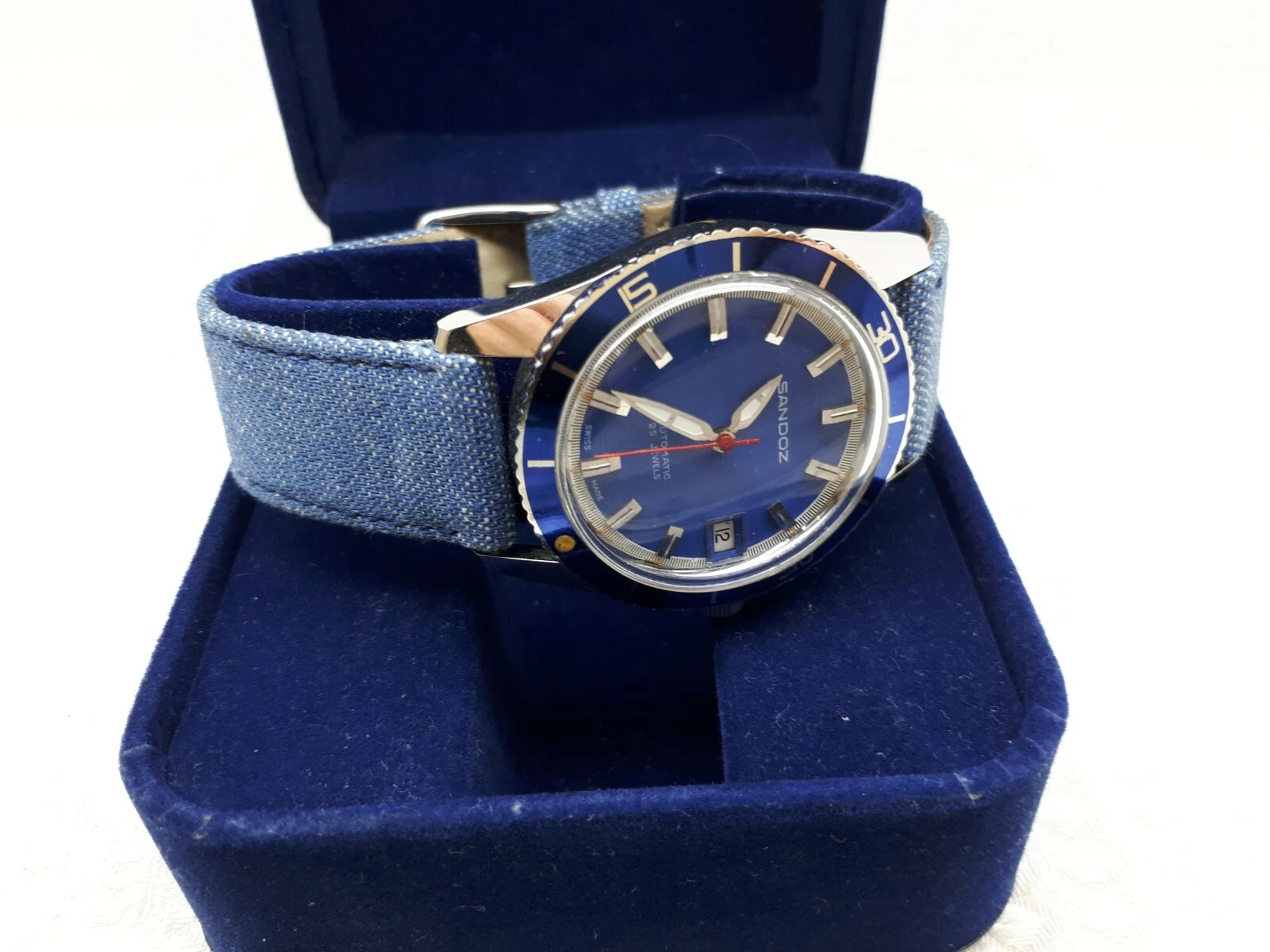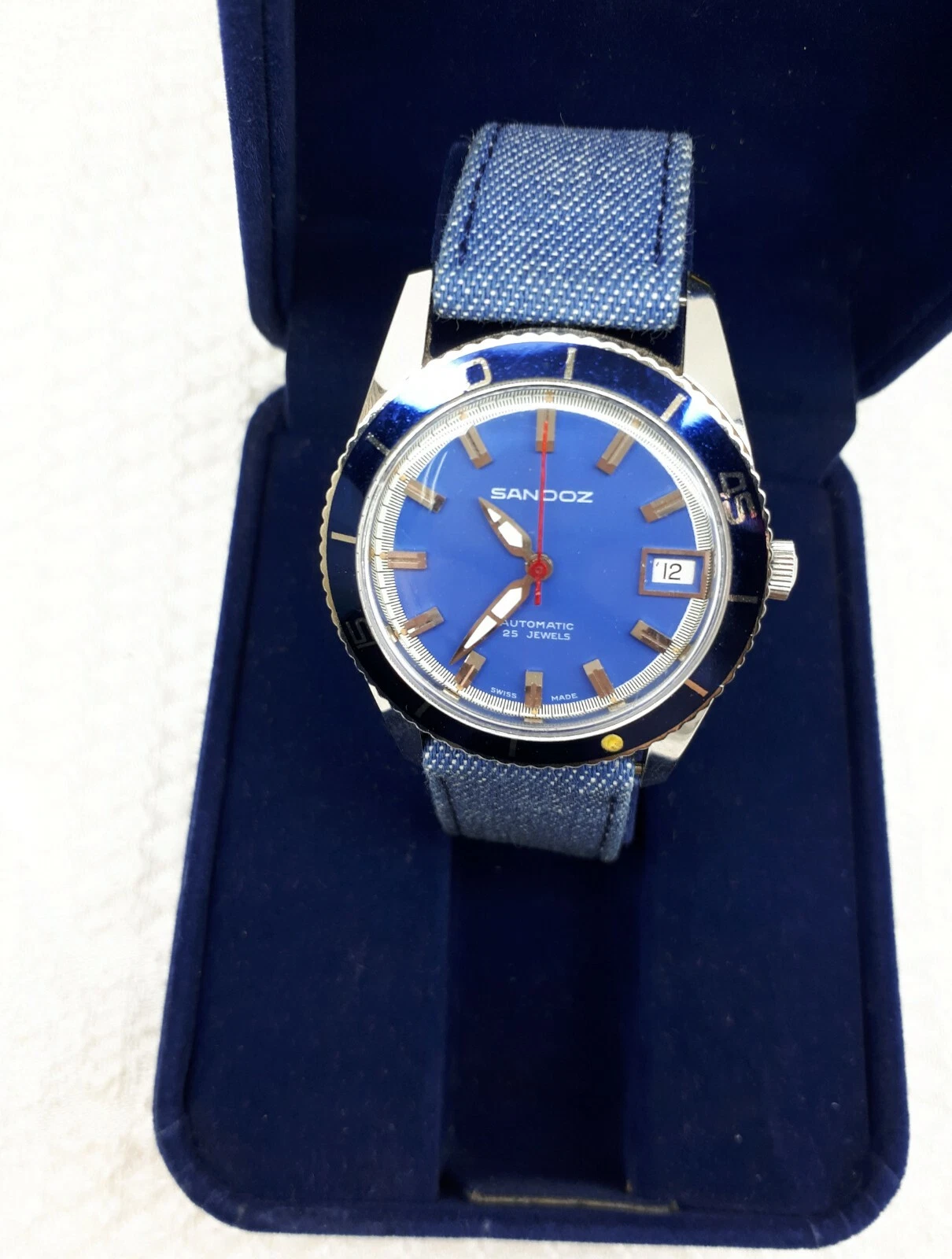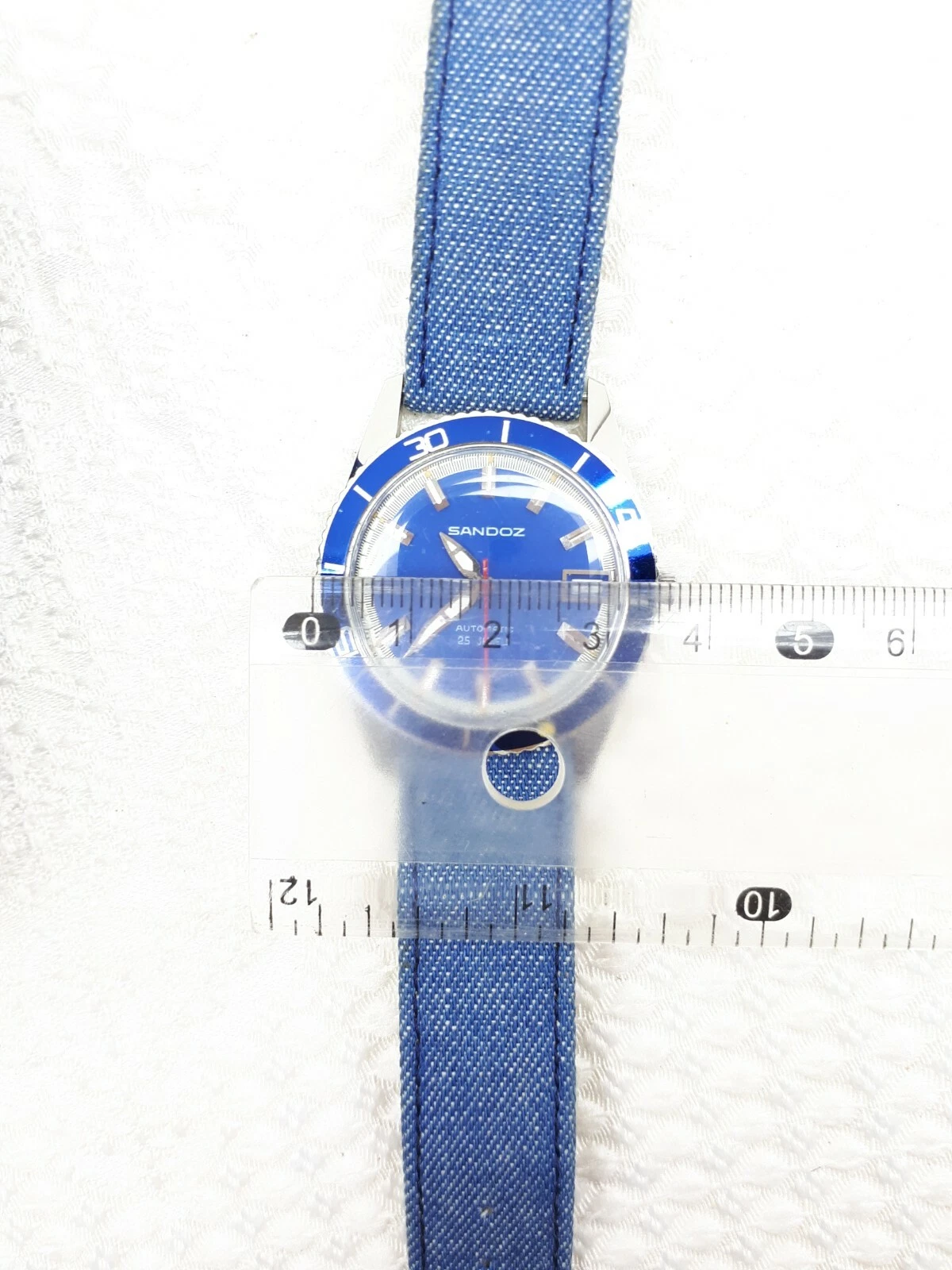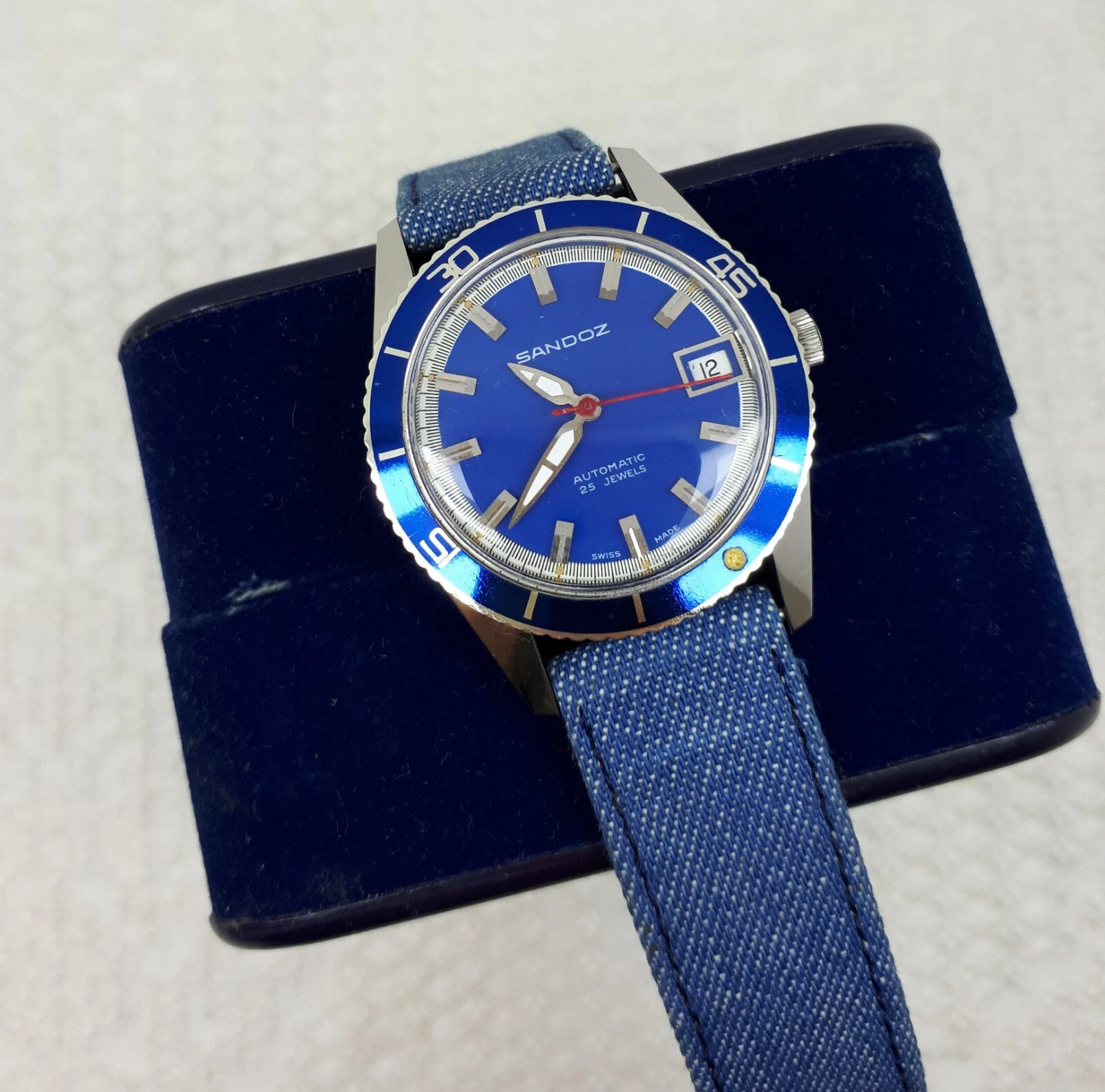 NOS SANDOZ AUTOMATIC BLUE DIAL RARE MEN’S WATCH SWISS DATE ROTATE BEZEL DIVER