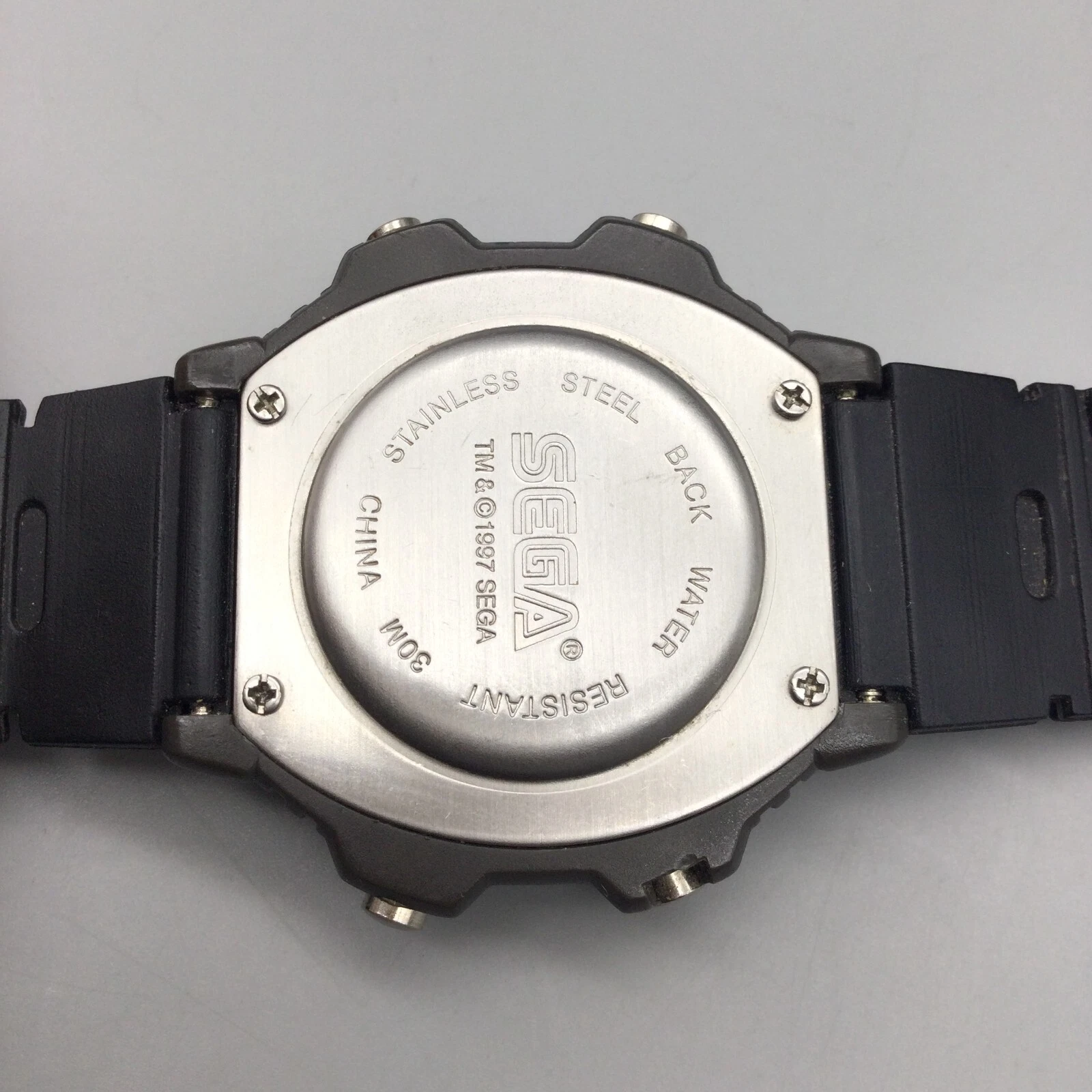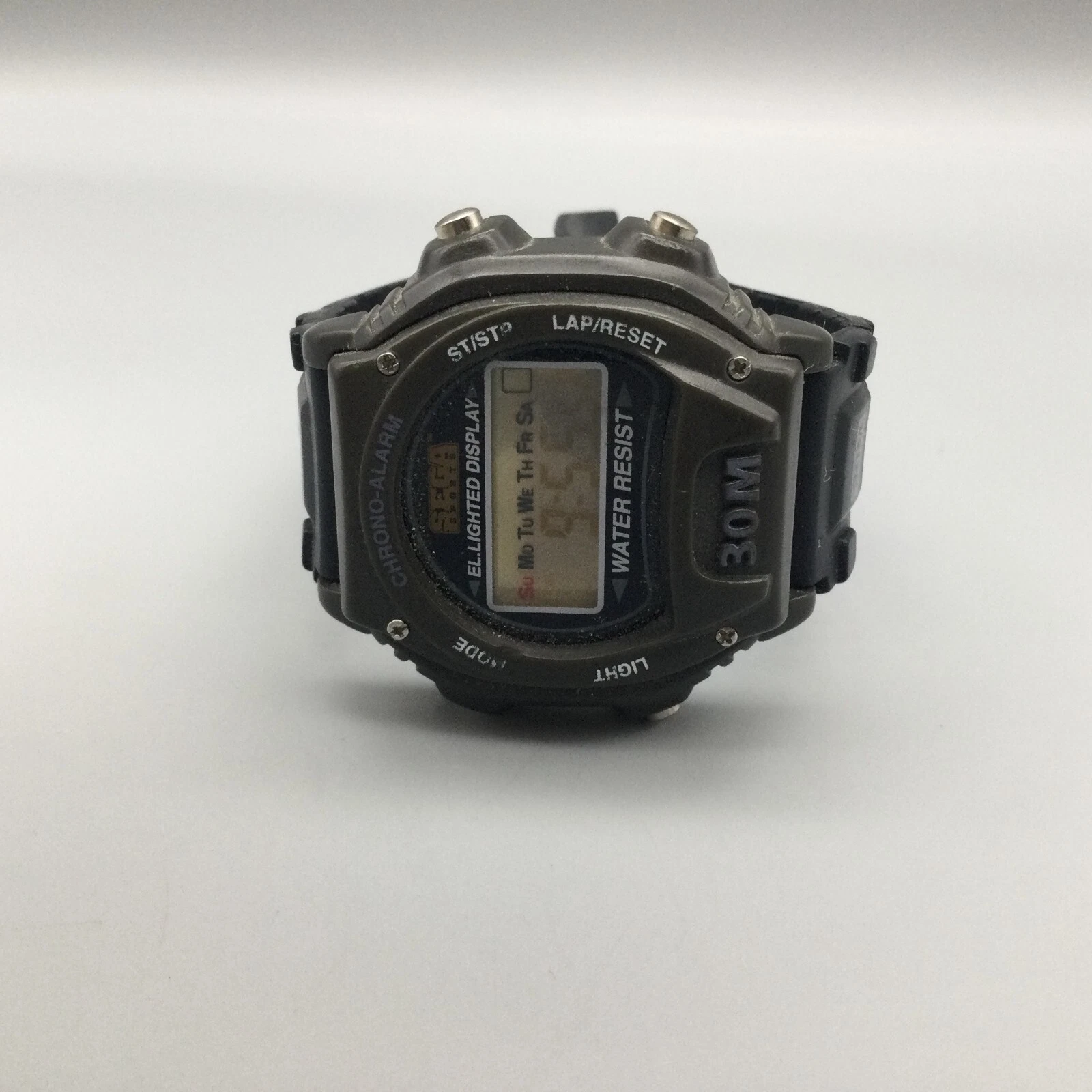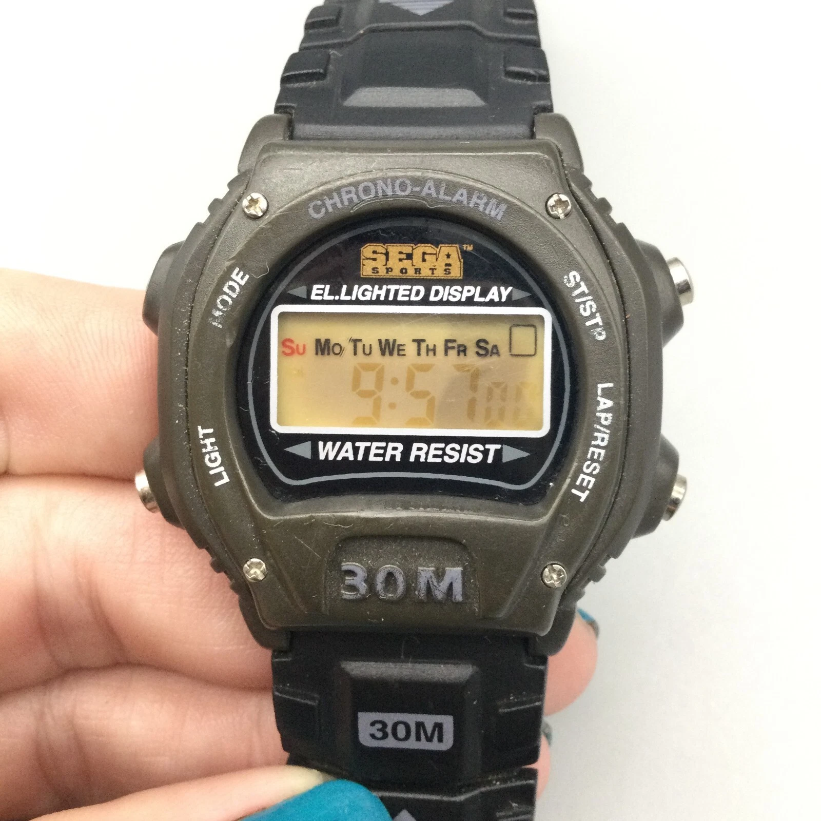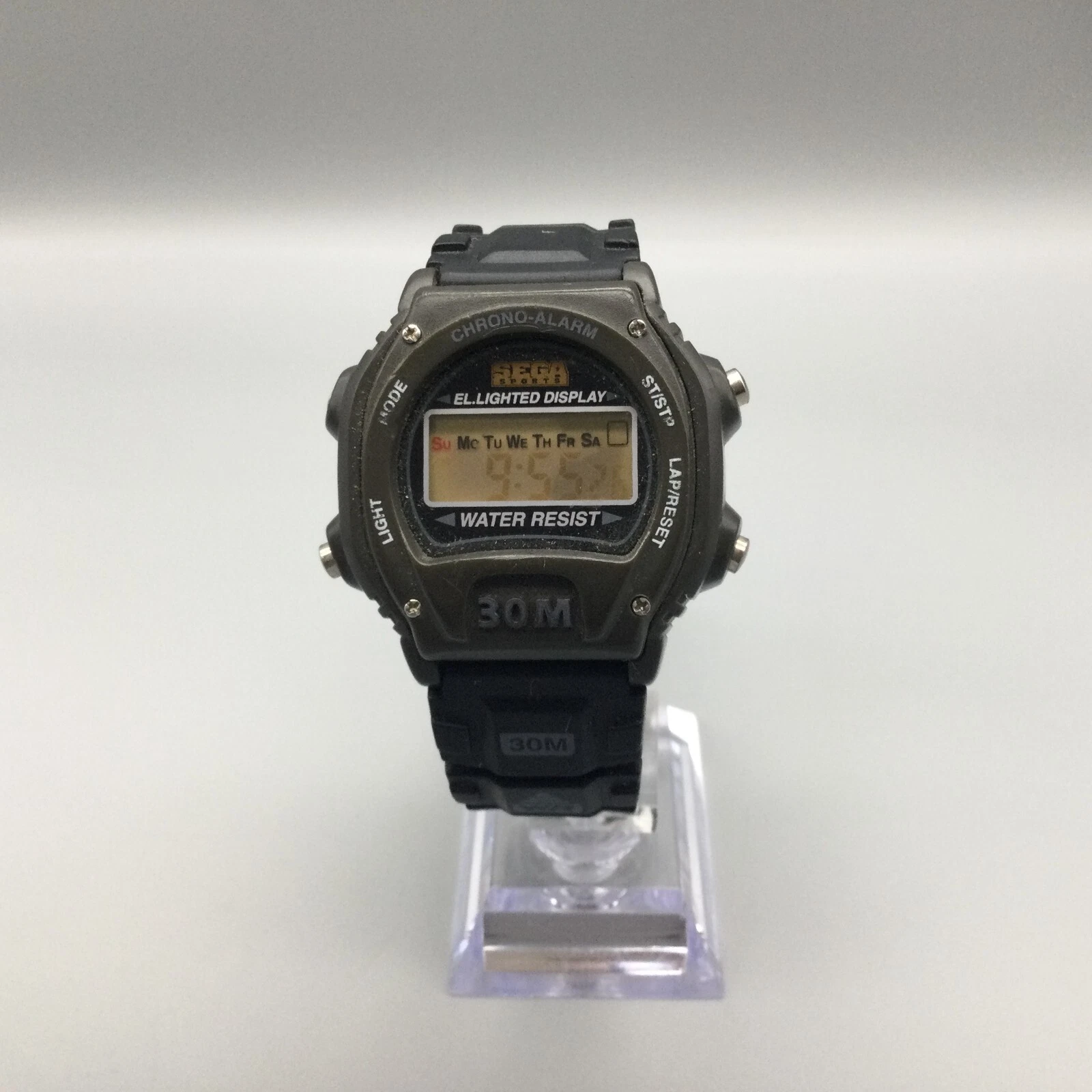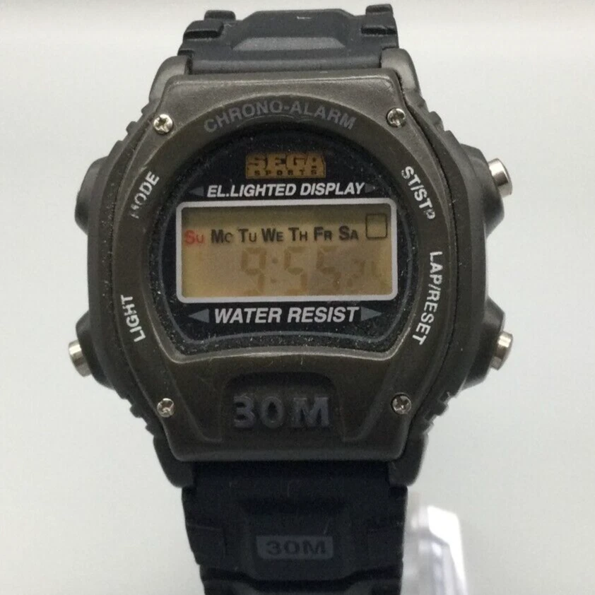 Vtg Sega Sports Digital Watch Men 41mm Black Alarm Day Date New Battery 1997