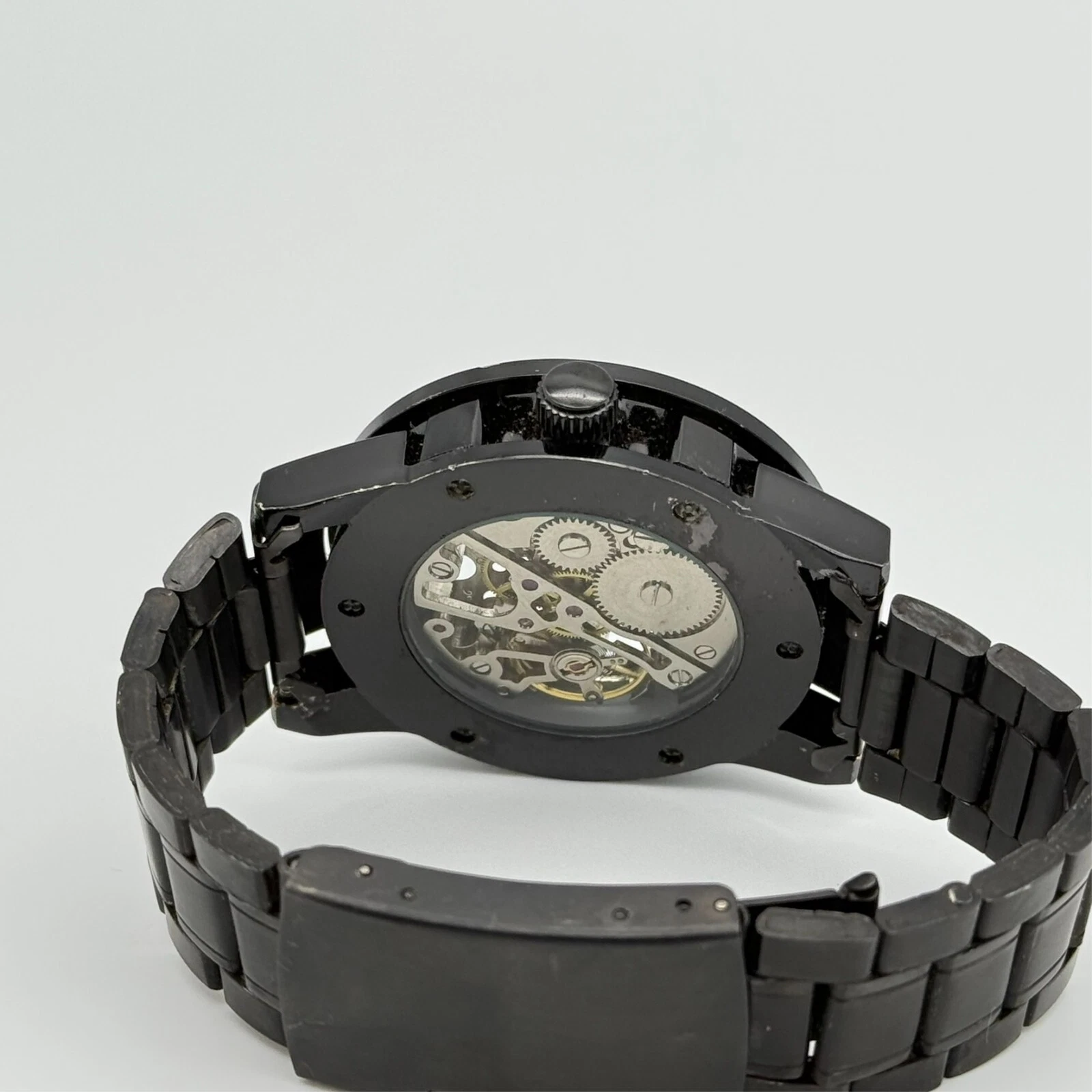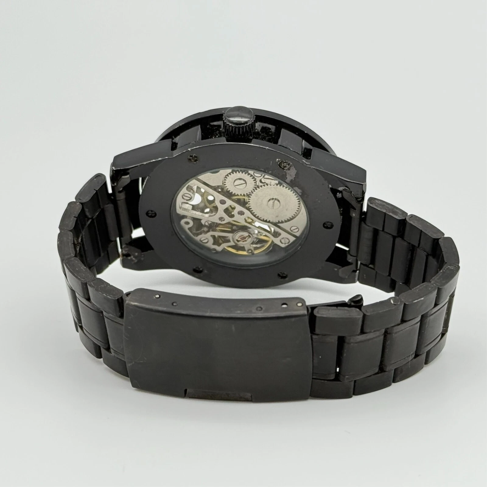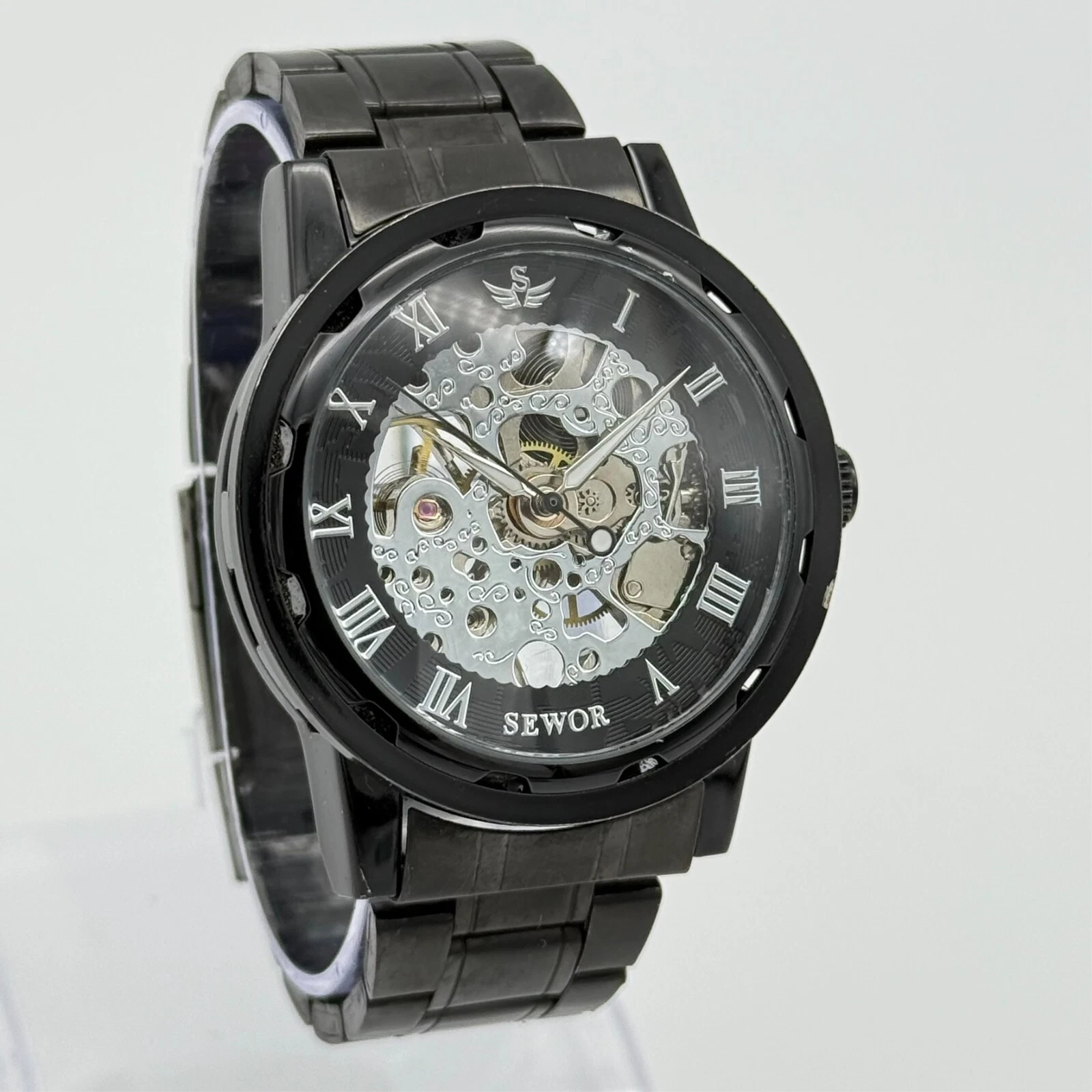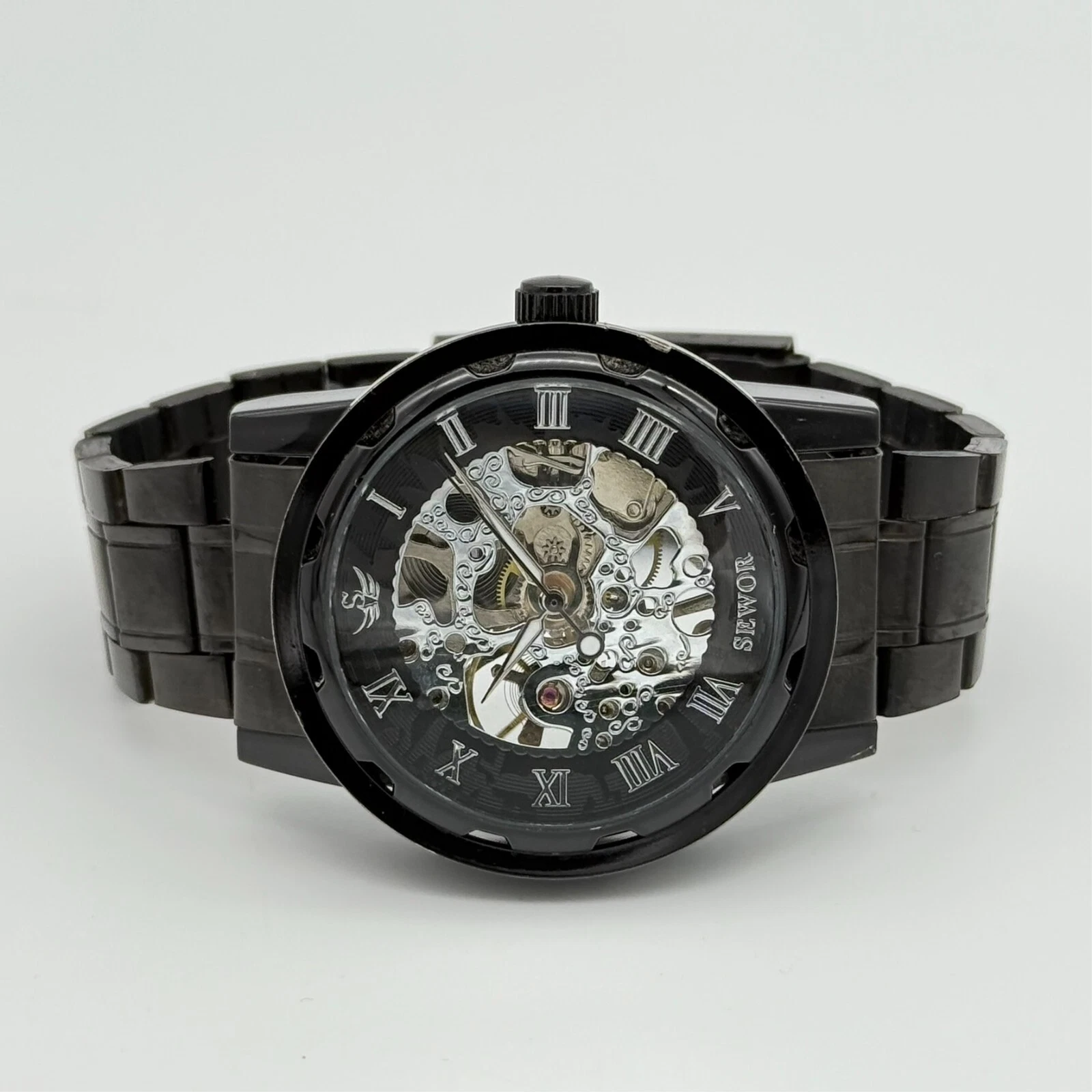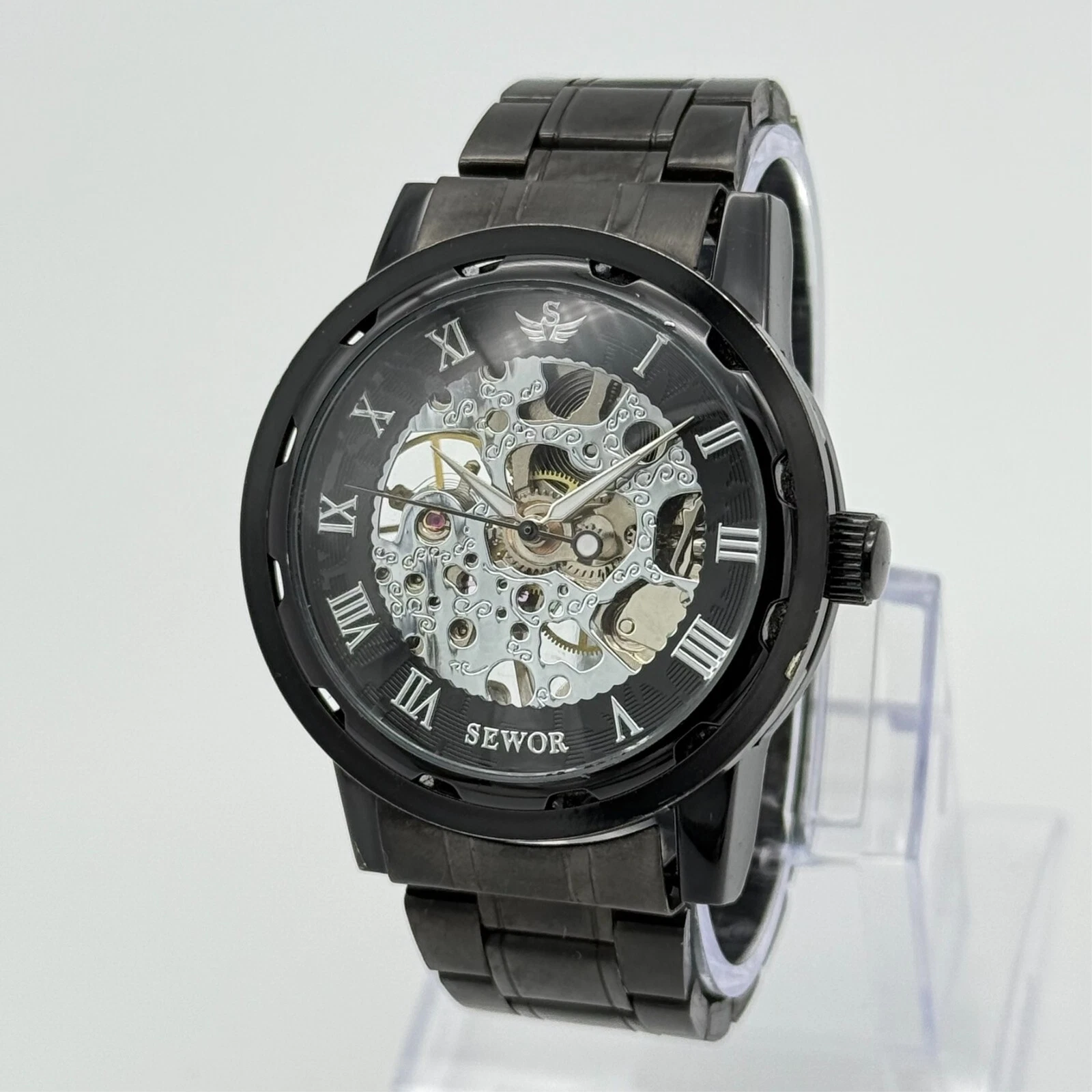 Men's SEWOR Mechanical Silver Skeleton Dial Watch, Black Bracelet, 41mm, Runs