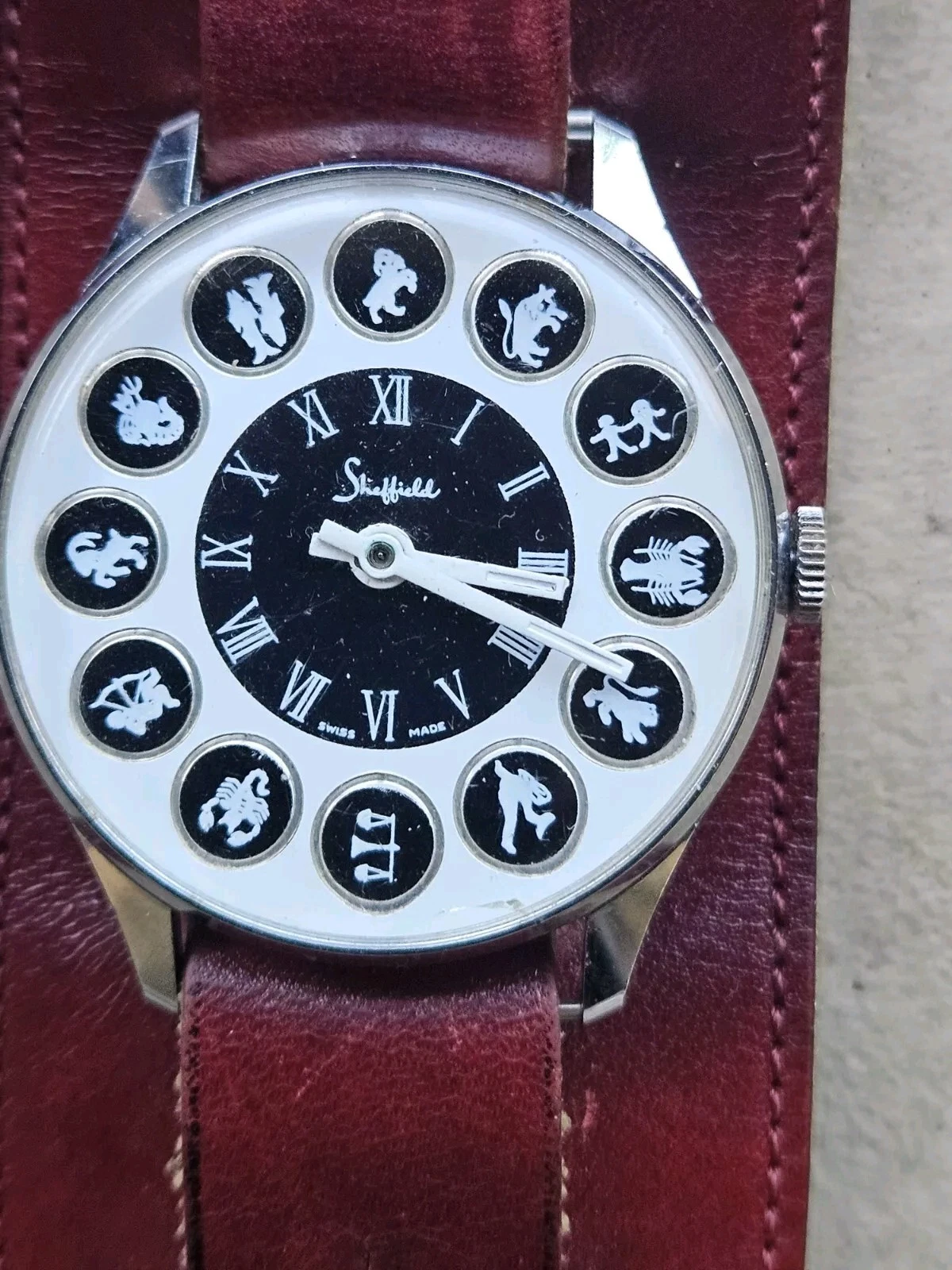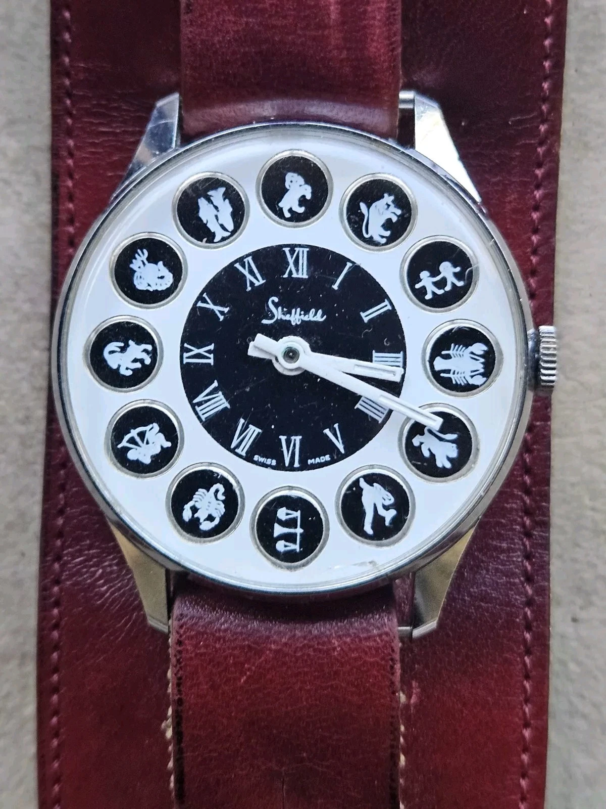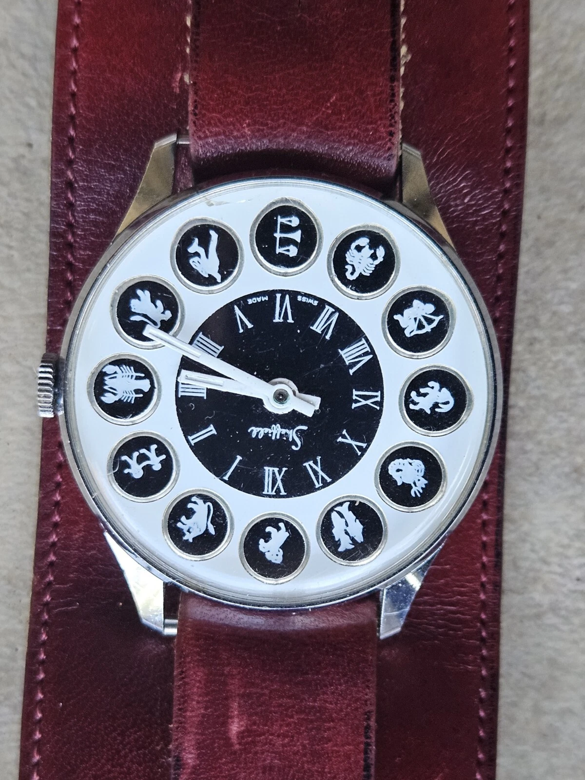 Works Vintage 1970 Men Sheffield Zodiac Swiss Watch Leather Ettiene Aigner Band