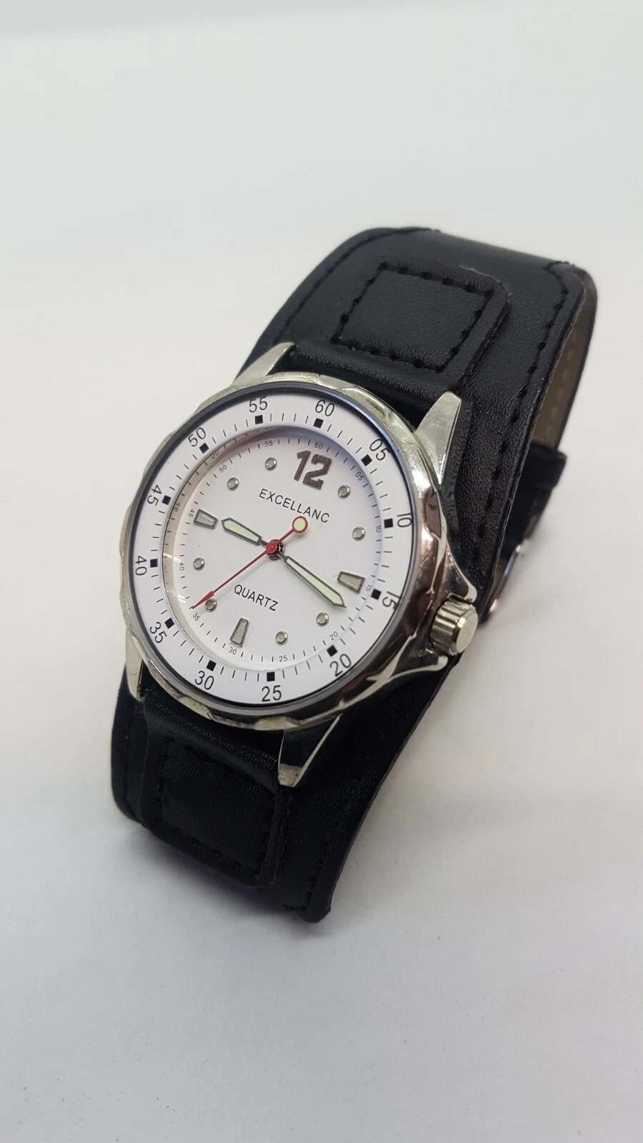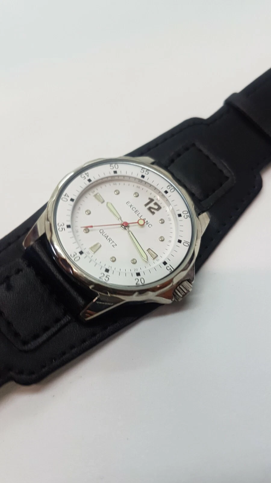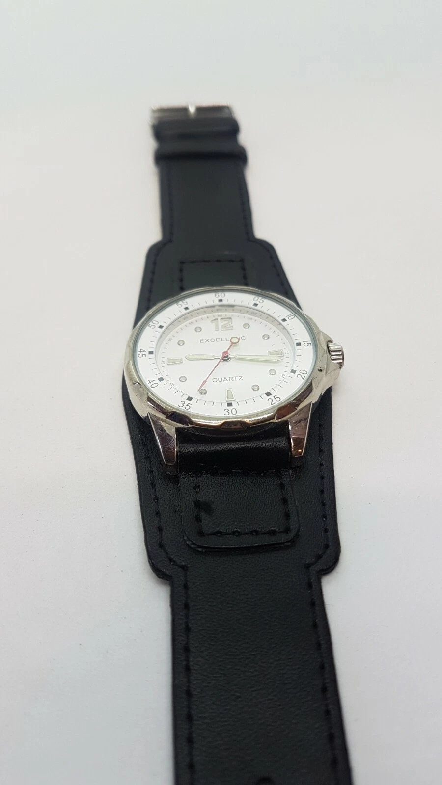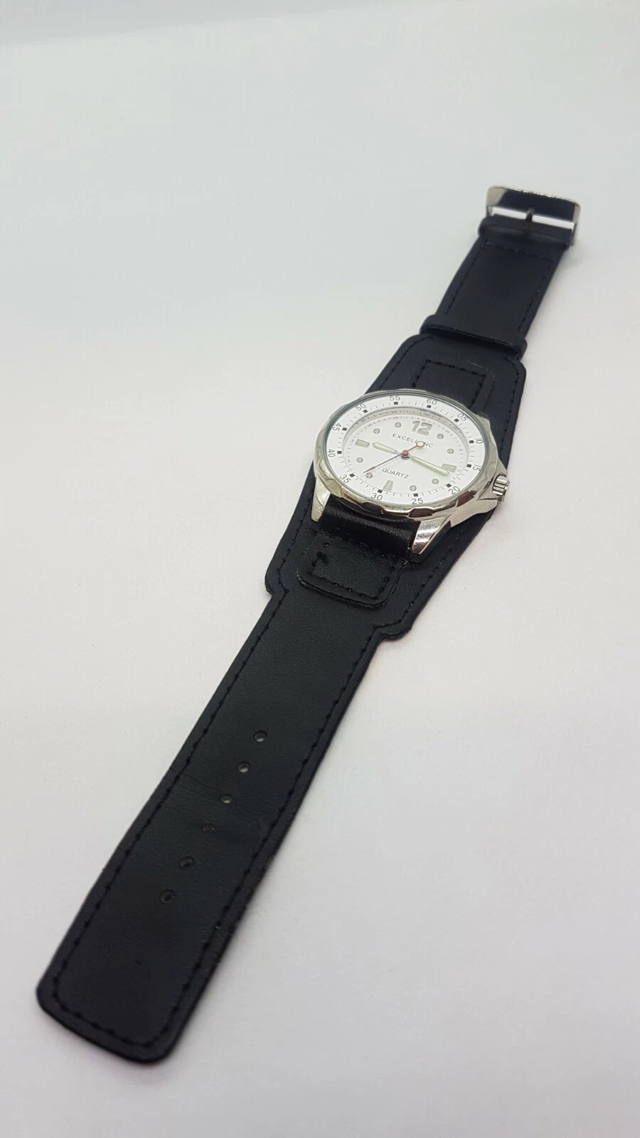 Excellanc Sports Simple White and Silver watch placed on large black cuff strap