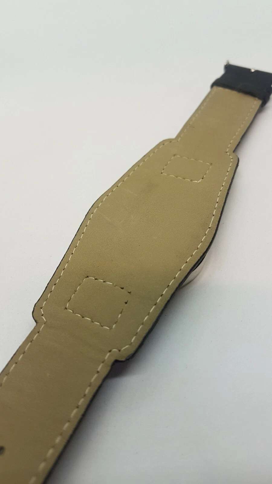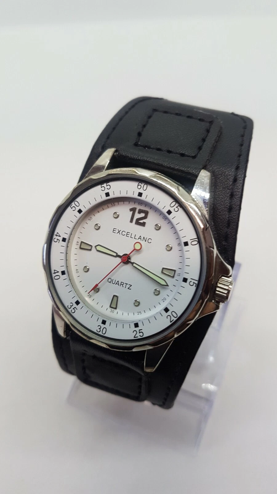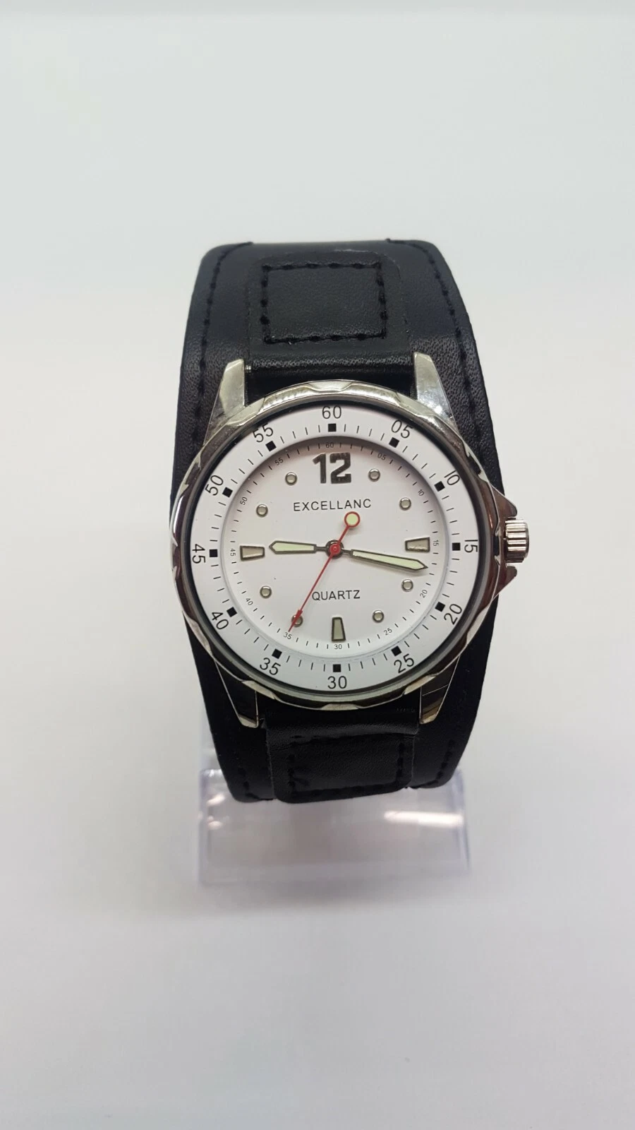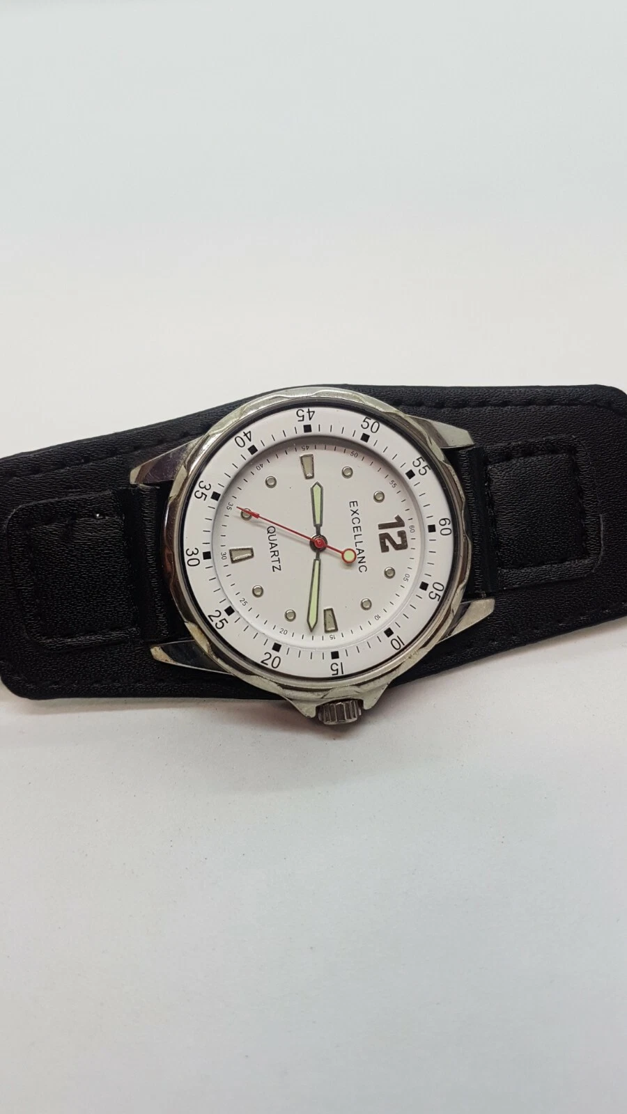 Excellanc Sports Simple White and Silver watch placed on large black cuff strap