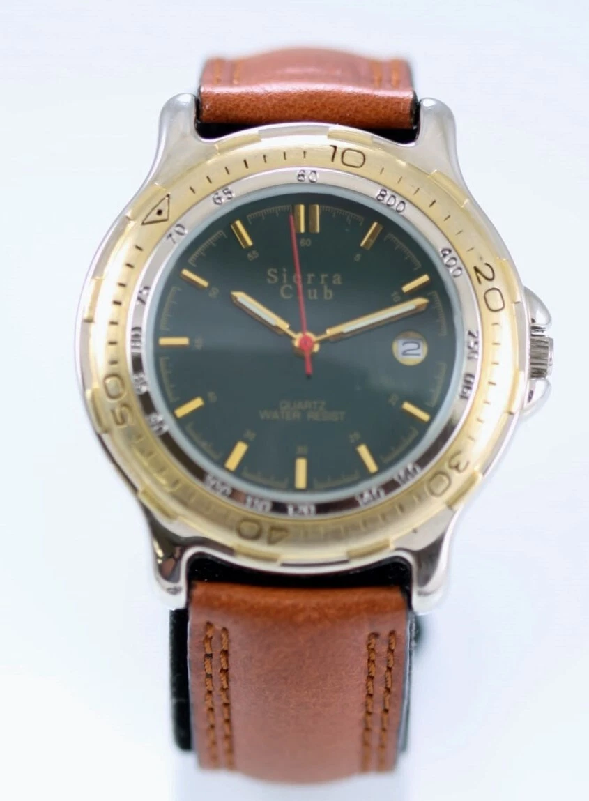 Sierra Club Watch Men Stainless Silver Gold WR Brown Leather Date Green Quartz