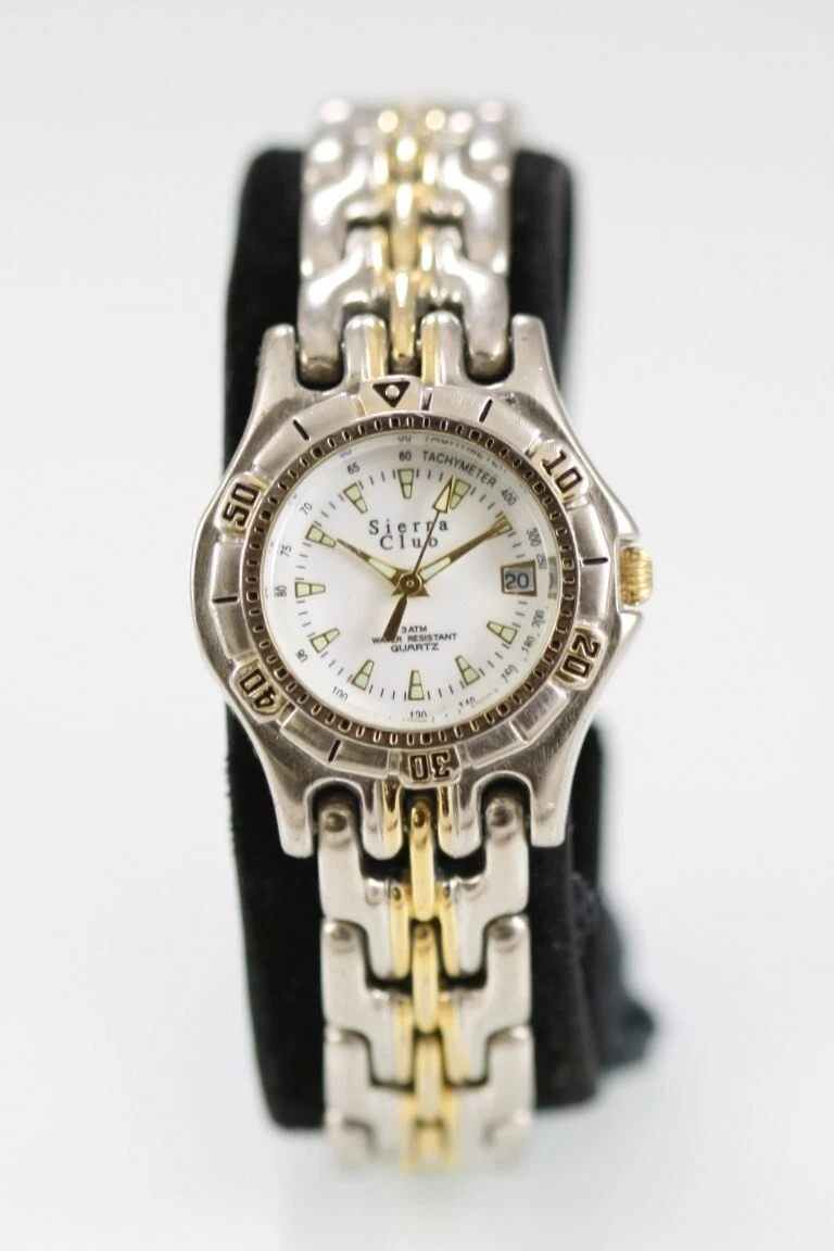 Sierra Club Women Watch Stainless Steel Silver Gold Batt 30m Date White Quartz