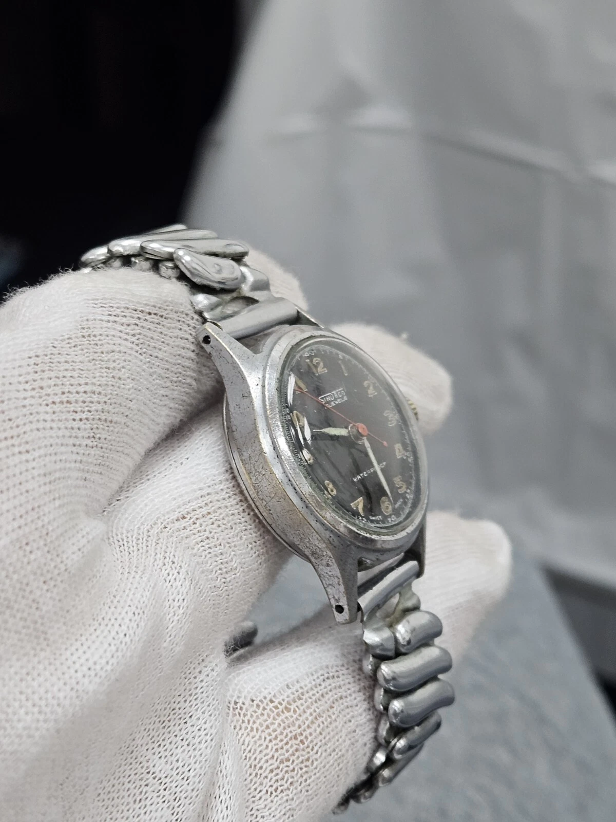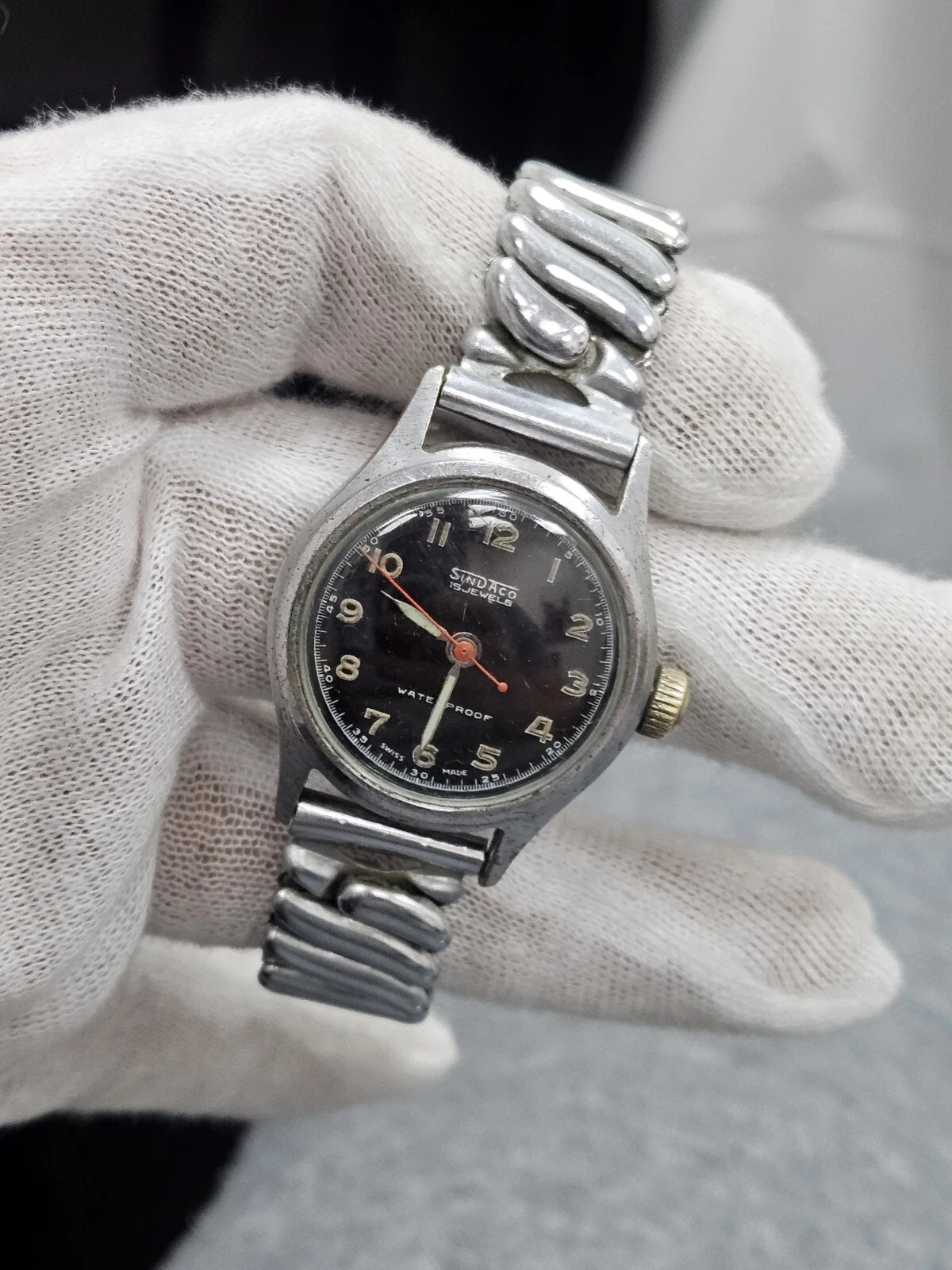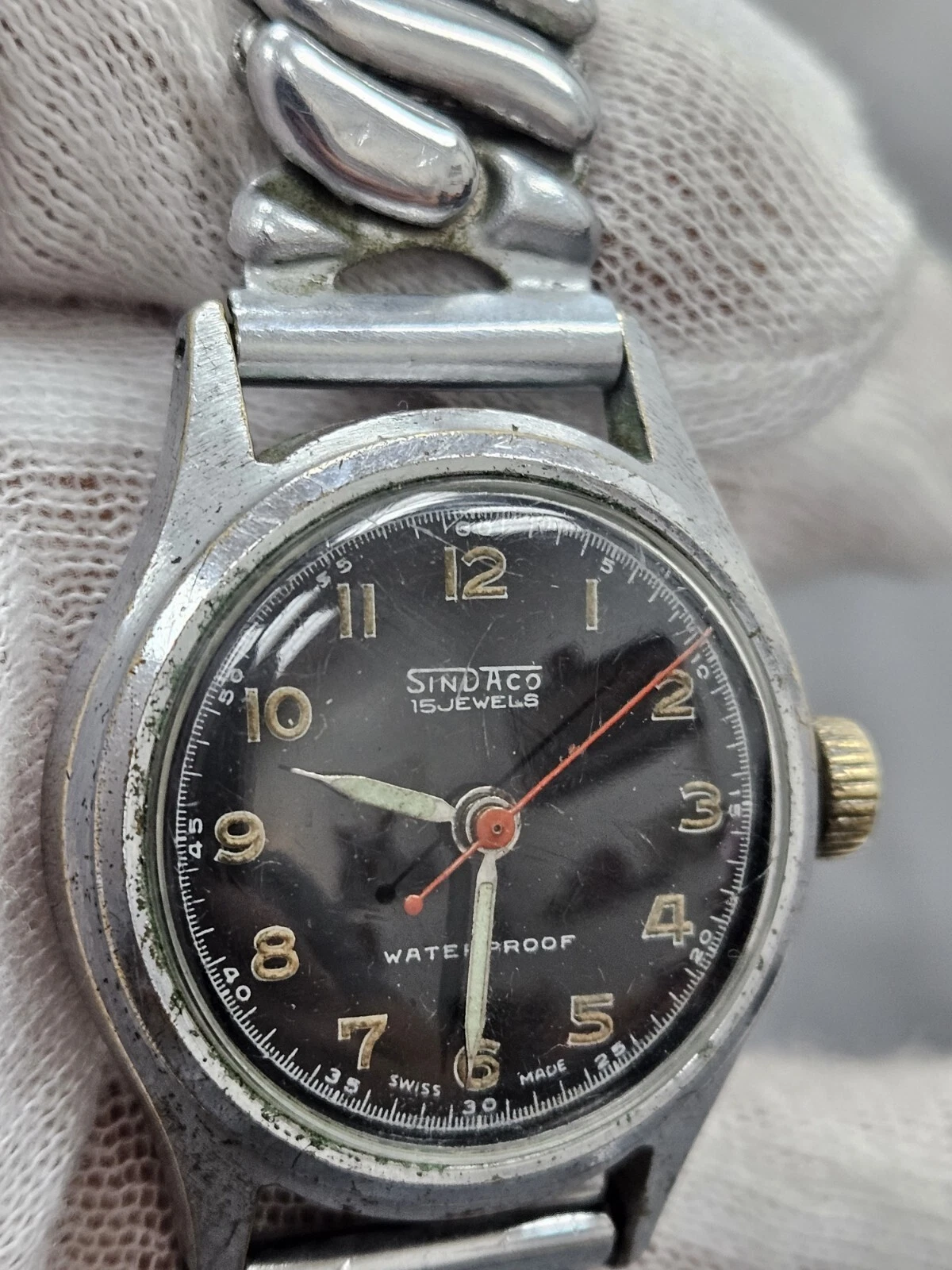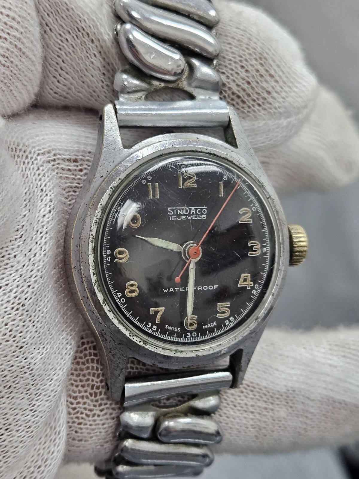 RARE MILITARY SINDACO 15 JEWELS MANUAL WIND MENS WRIST WATCH BLACK DIAL