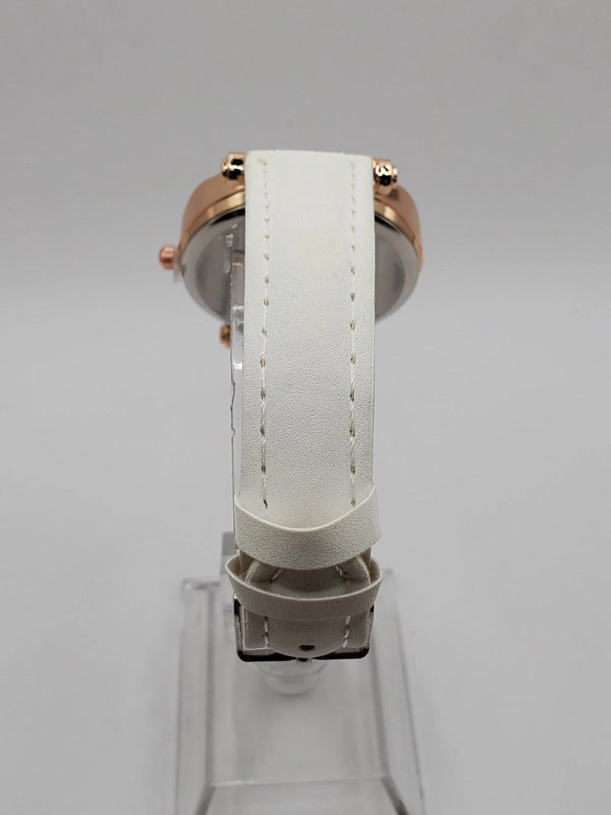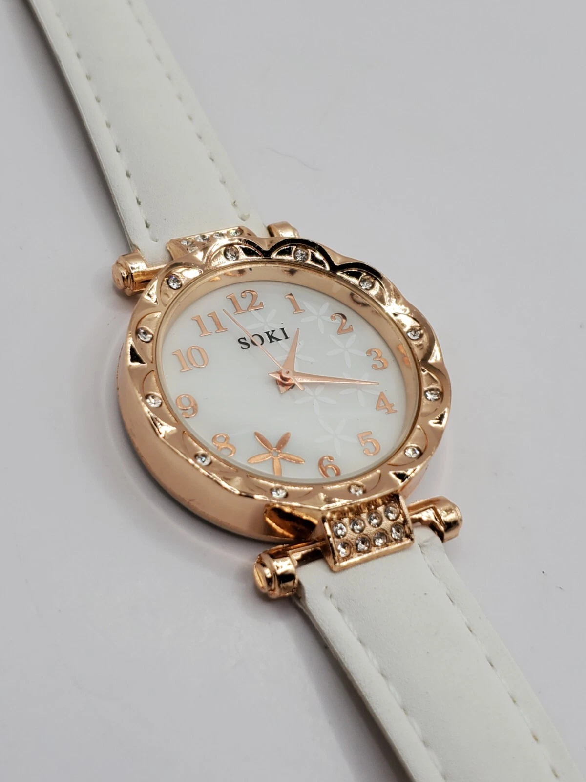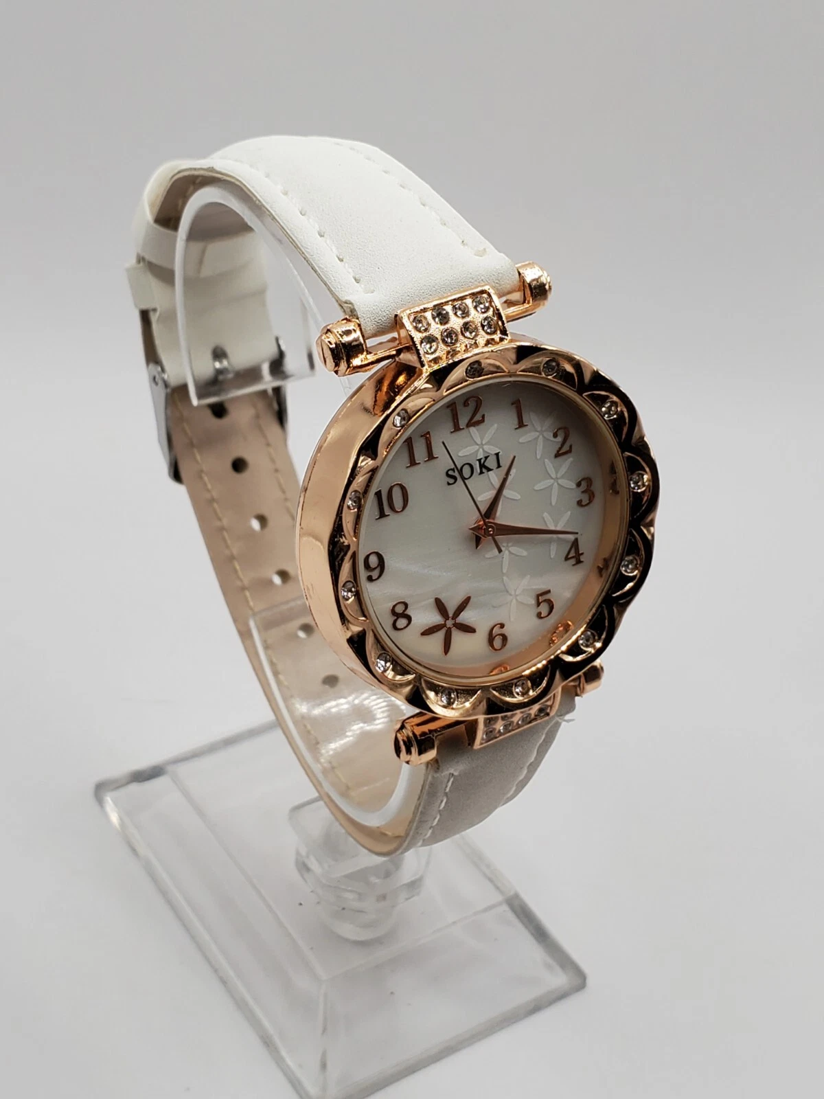 Soki Ladies Fashion gem Quartz Watch 34mm Round Gold Tone Faux Leather Band