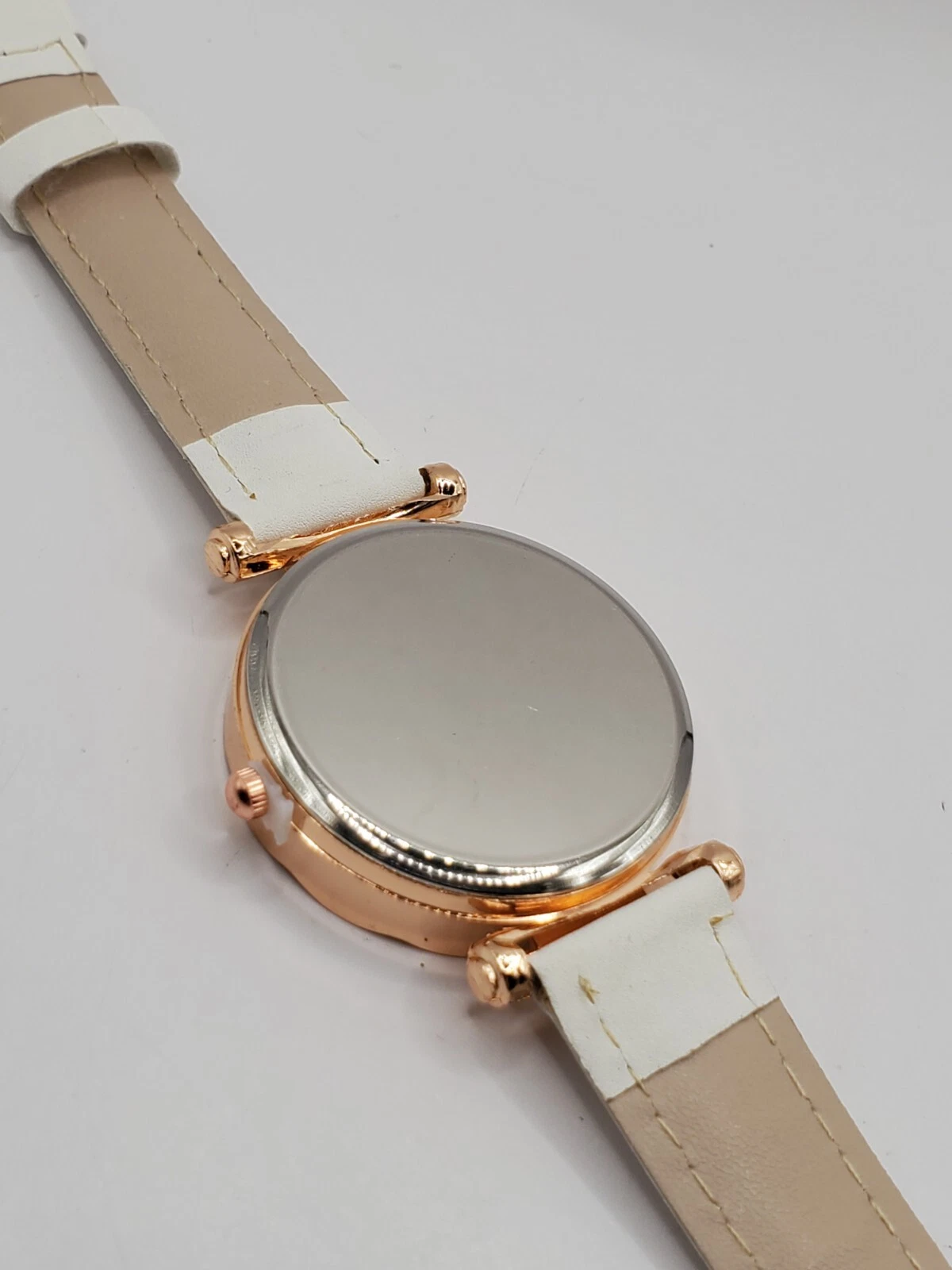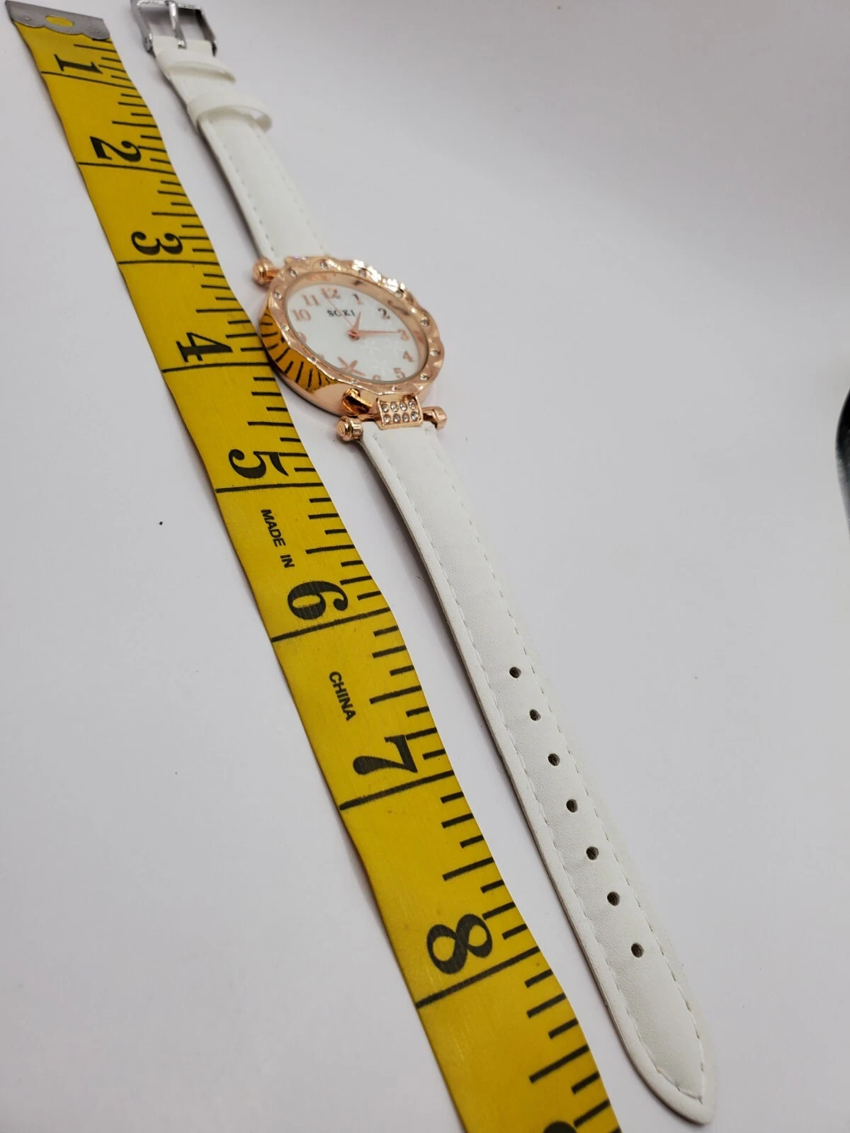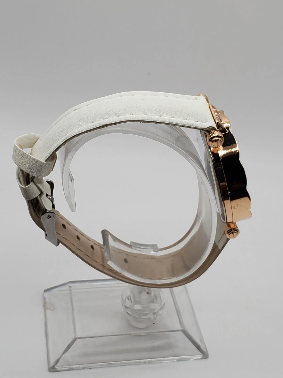 Soki Ladies Fashion gem Quartz Watch 34mm Round Gold Tone Faux Leather Band