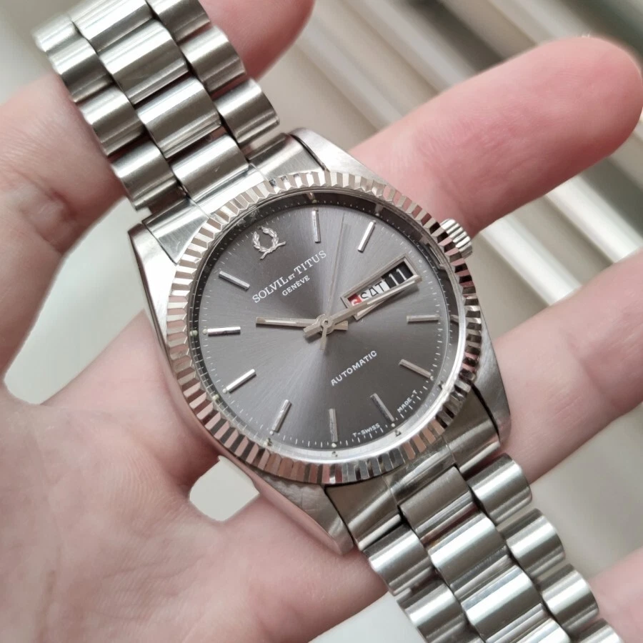 RARE Solvil et Titus President Day Date Grey Sunburst Automatic Vintage Watch