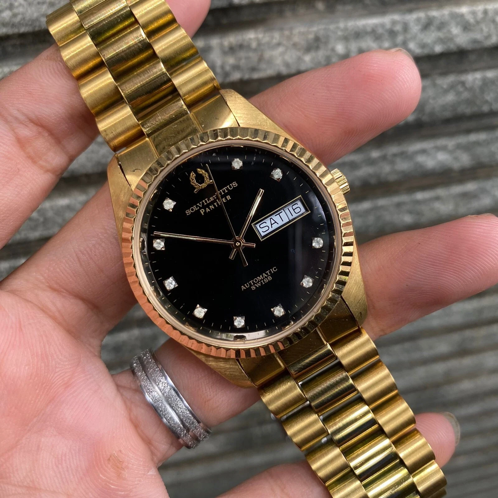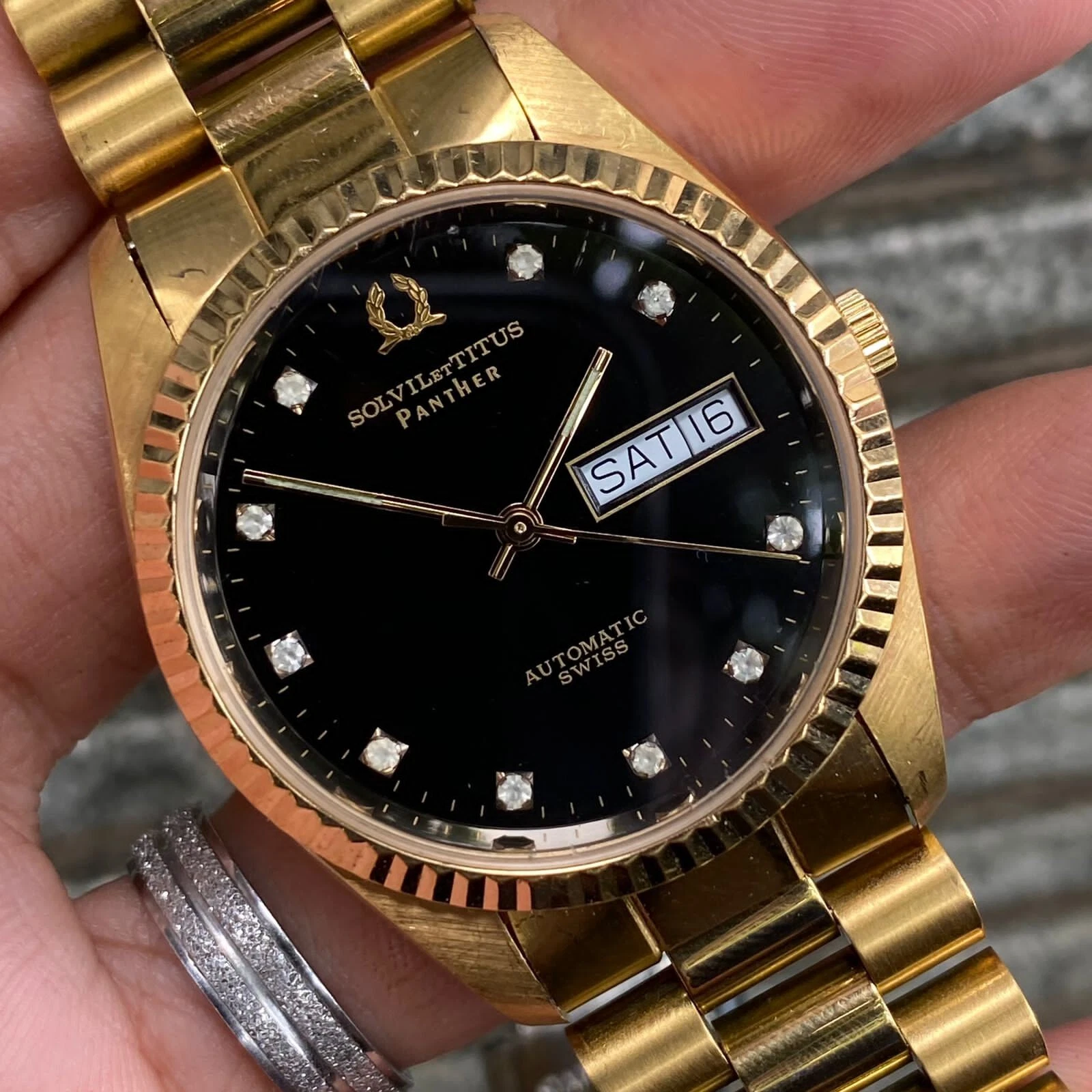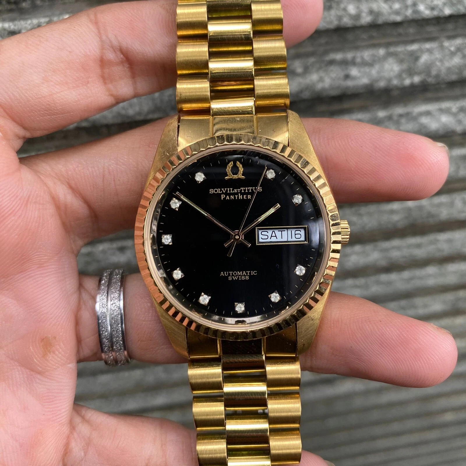 RARE Solvil et Titus Day Date Panther Black Dial Automatic Vintage Men Watch