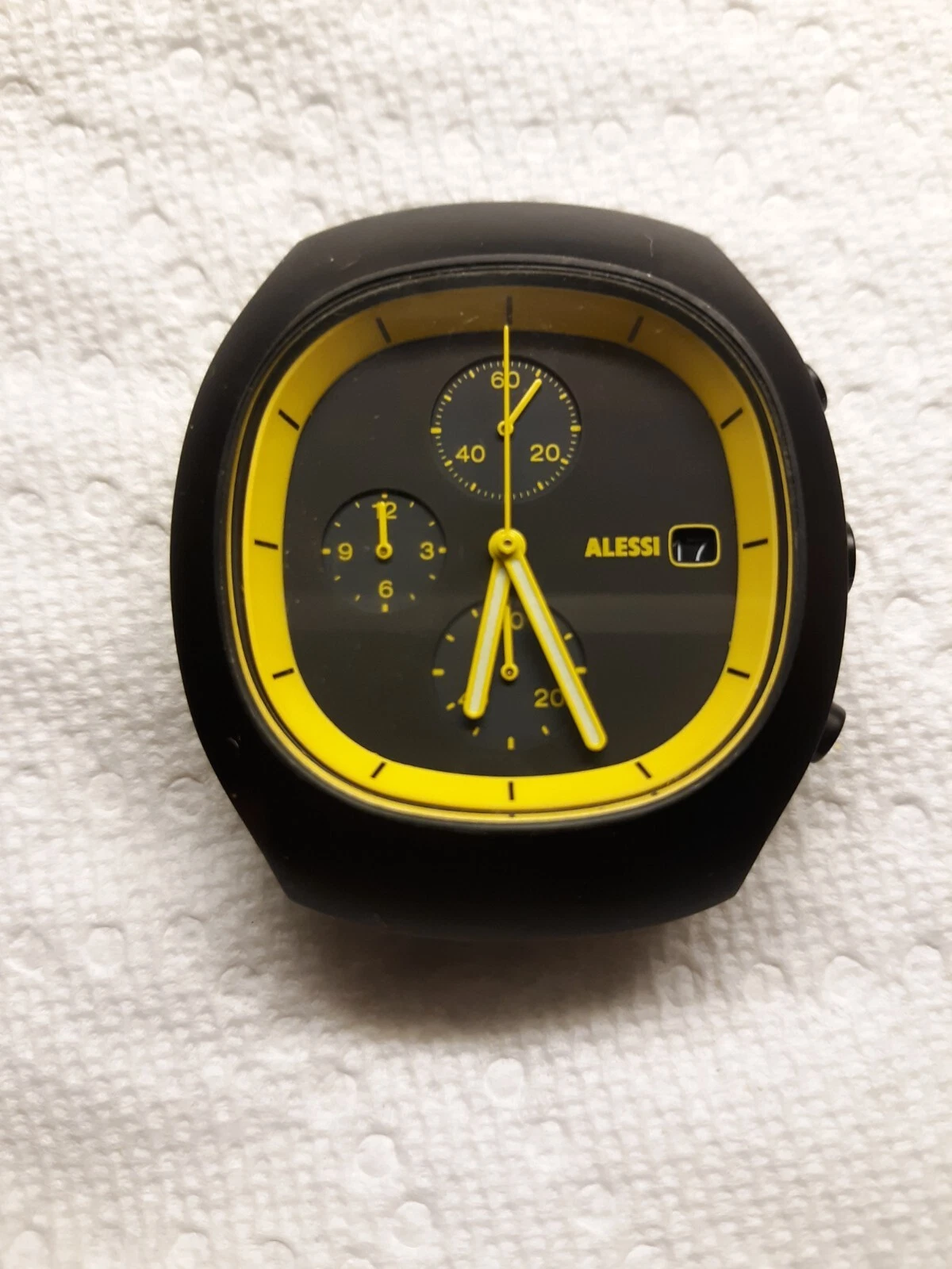 USED ALESSI #AL21011 WATCH ONLY-NO BAND, BLACK WITH YELLOW NUMBERS, HANDS AND DI