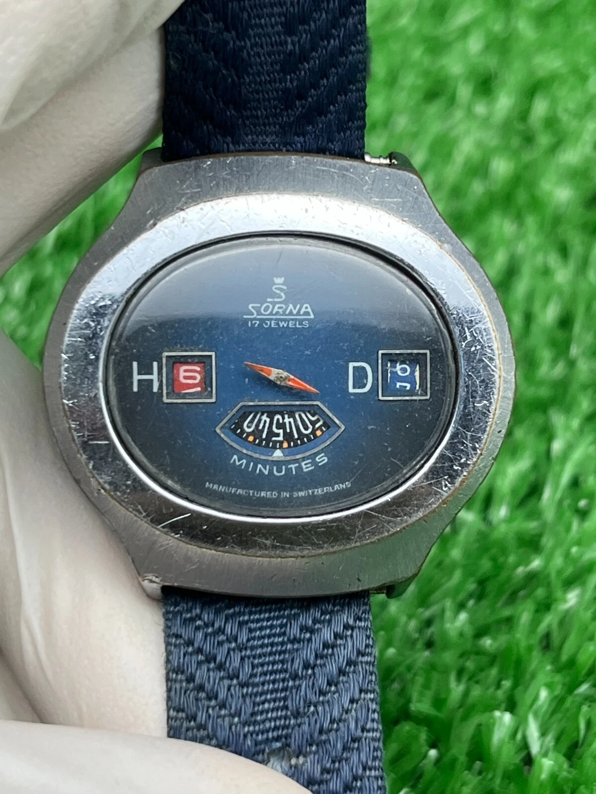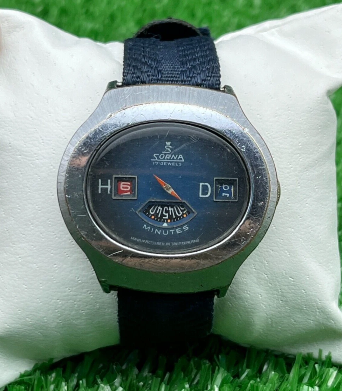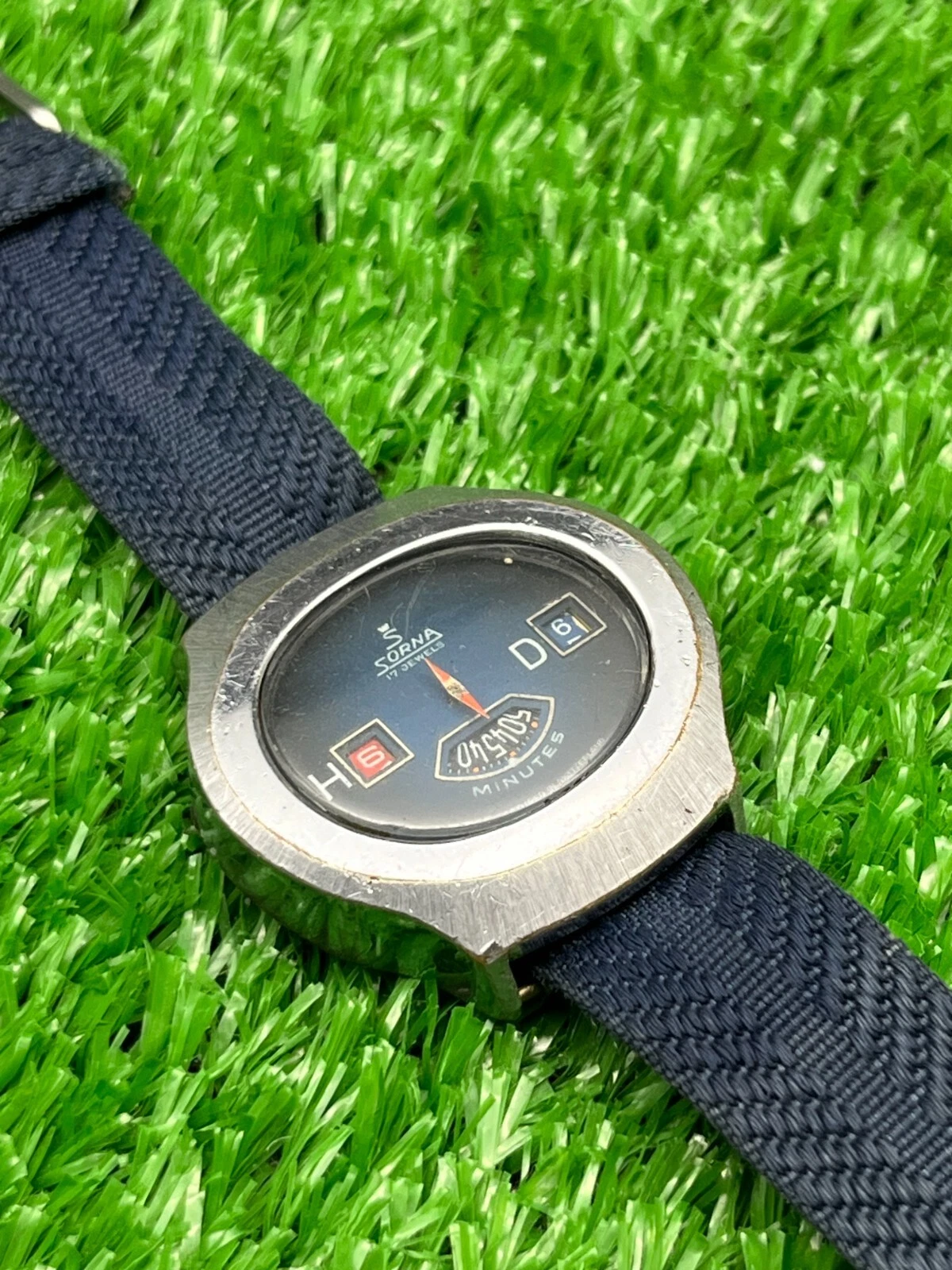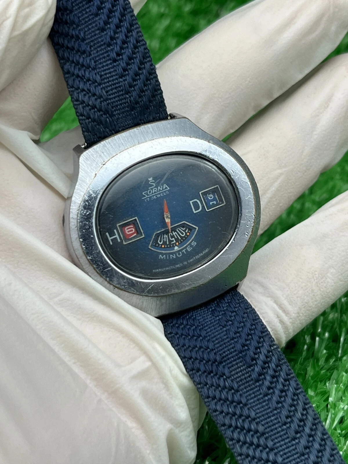 Rare Vintage SORNA Space Age Digital Jump Hour Automatic Watch Blue Dial 70s