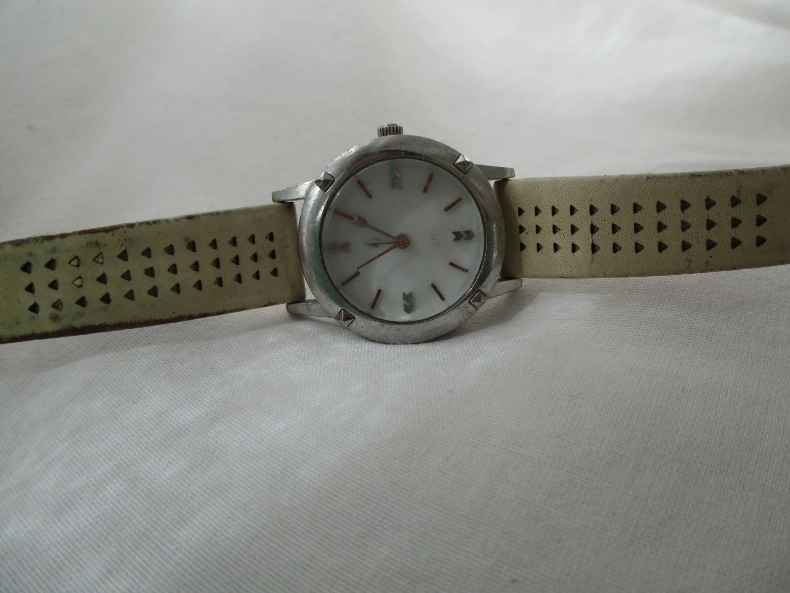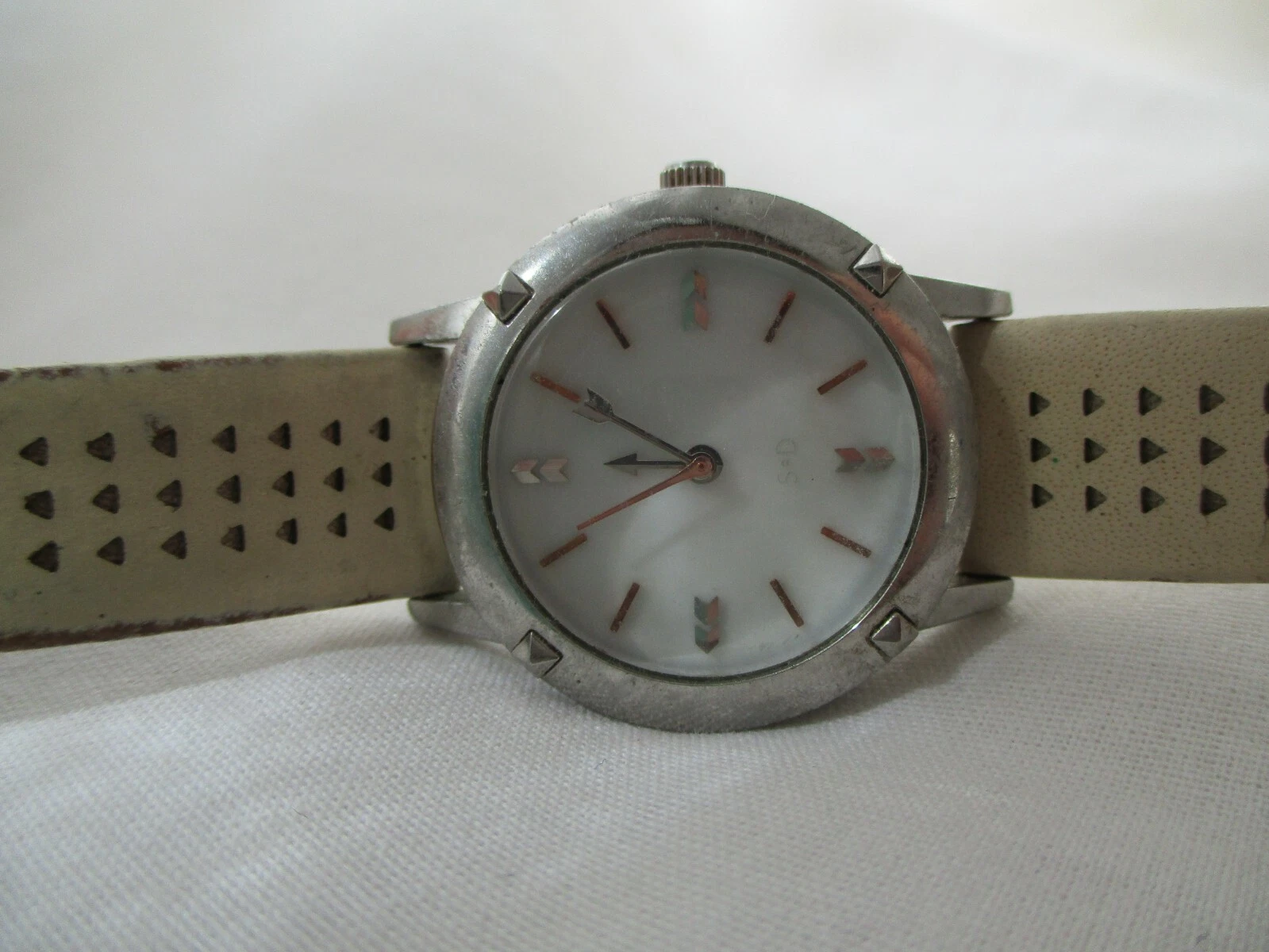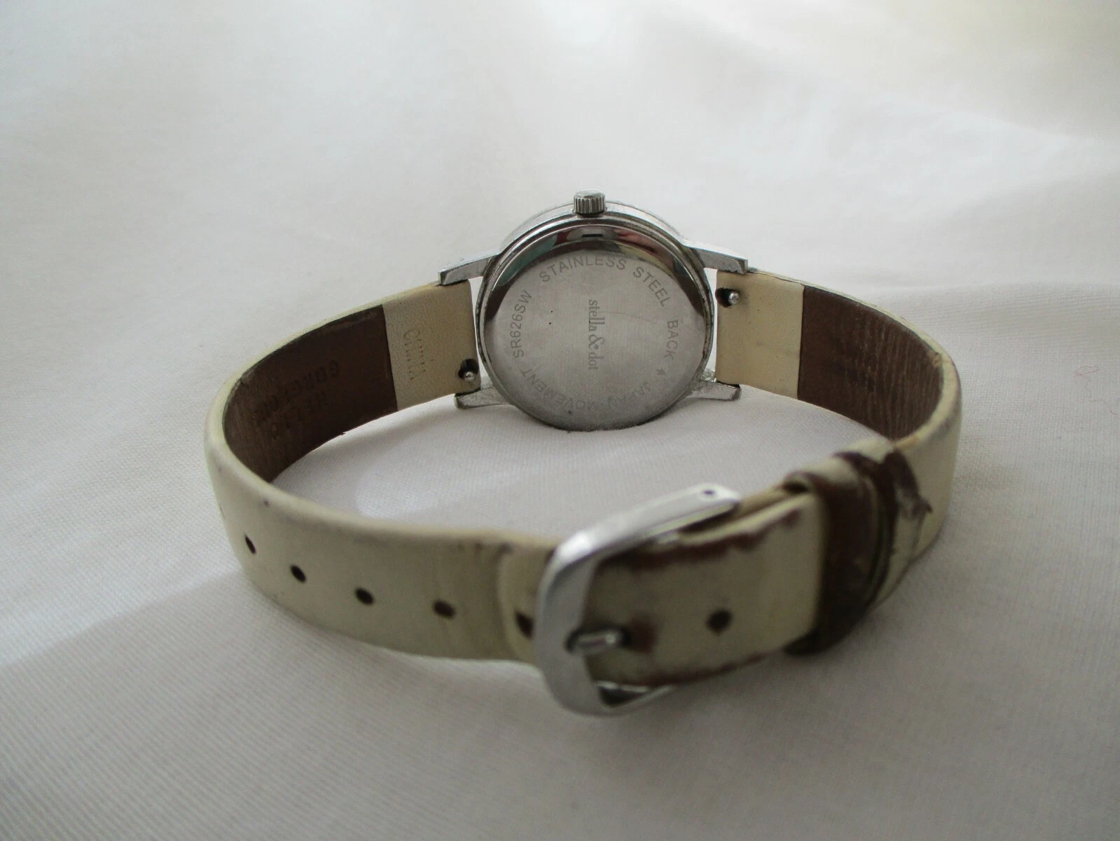 Stella & Dot Watch Beige Buckle Band Round White Face Silver Toned