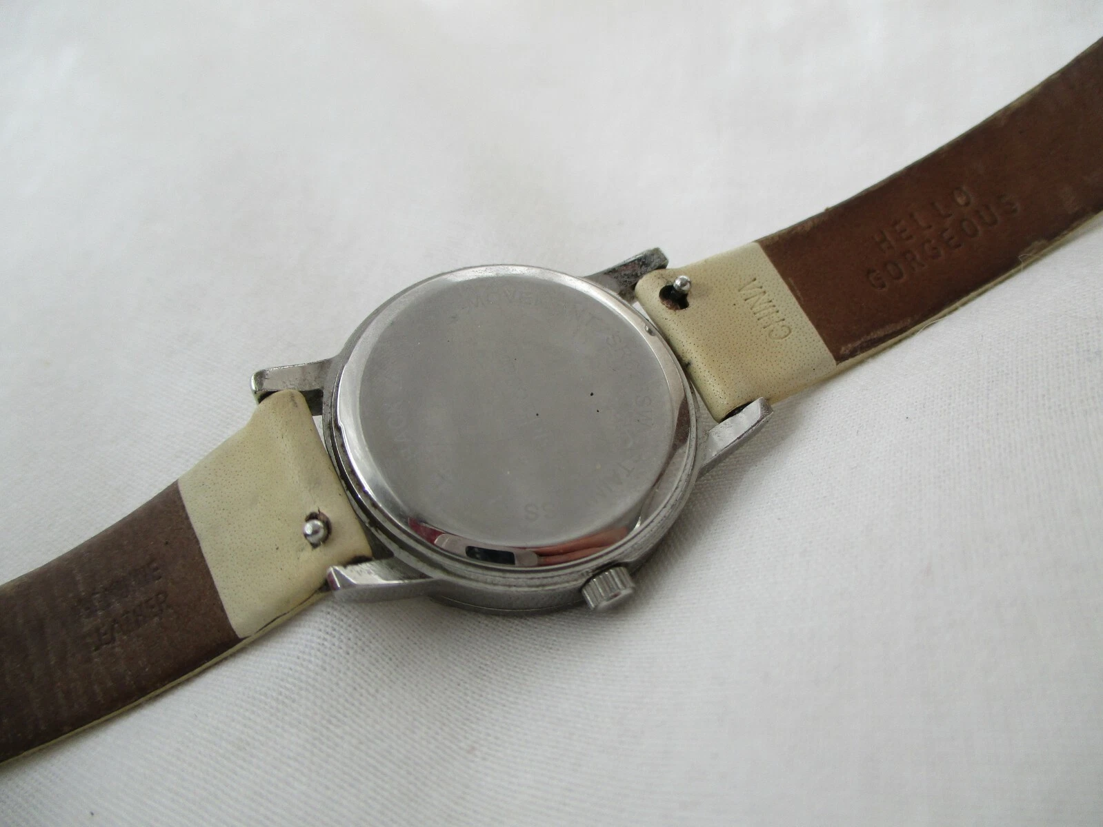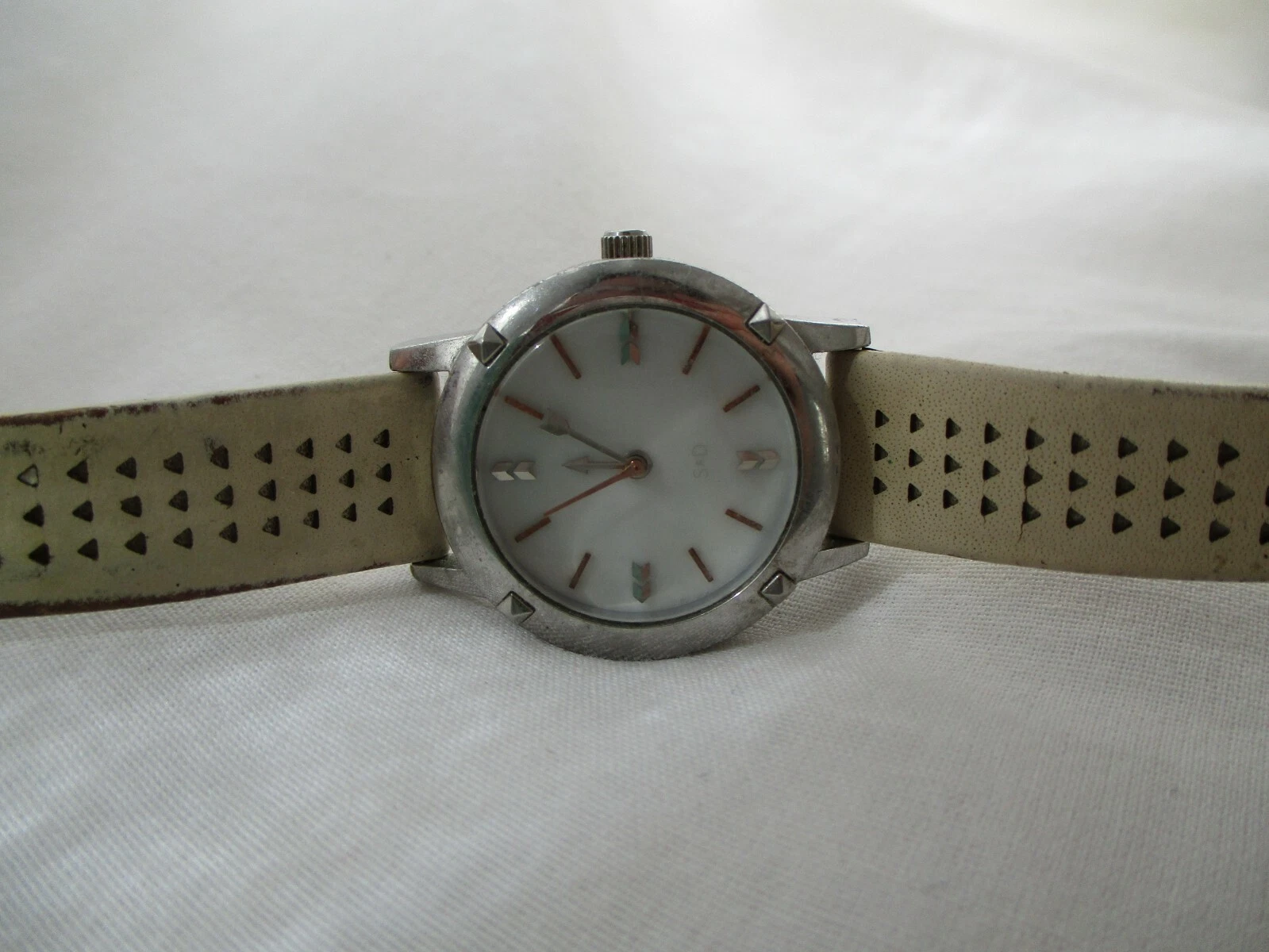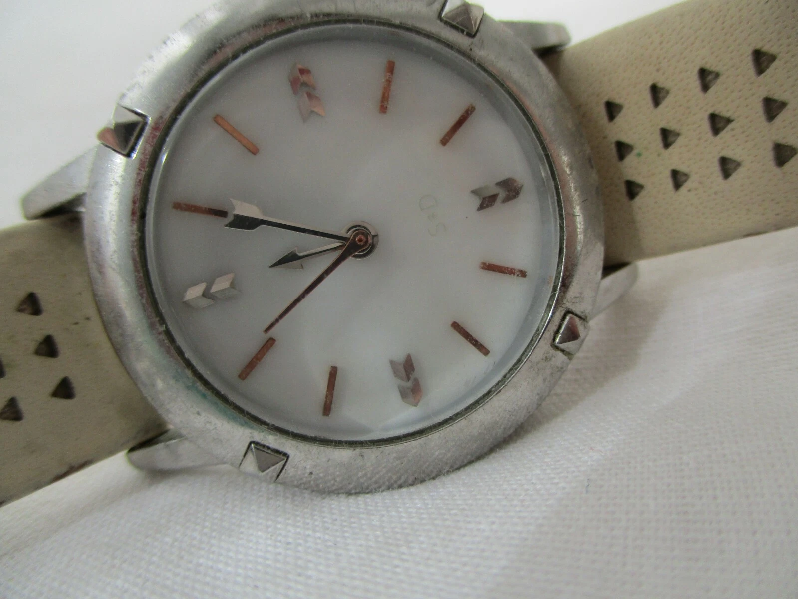 Stella & Dot Watch Beige Buckle Band Round White Face Silver Toned