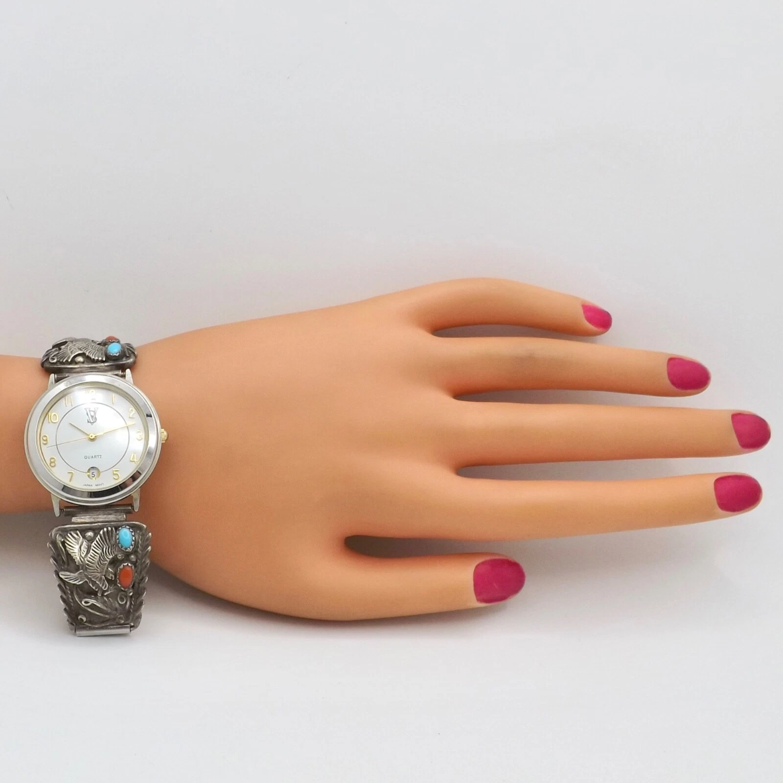 Silver Nugget Co Sterling Coral Turquoise Eagle Watch Tips Band Native American