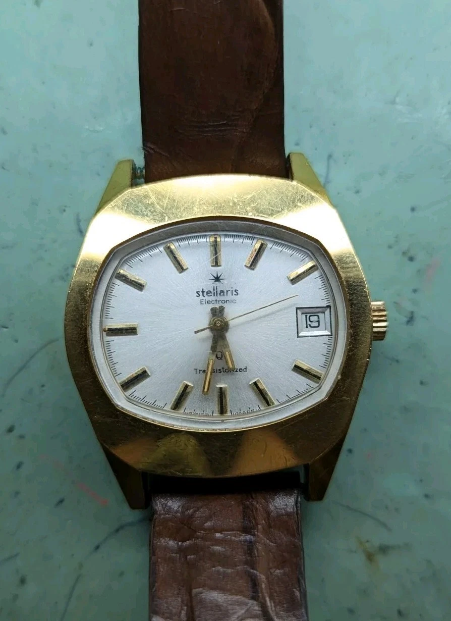 1970s Stellaris 7j Mens Electronic Transistorized Wristwatch Date Runs