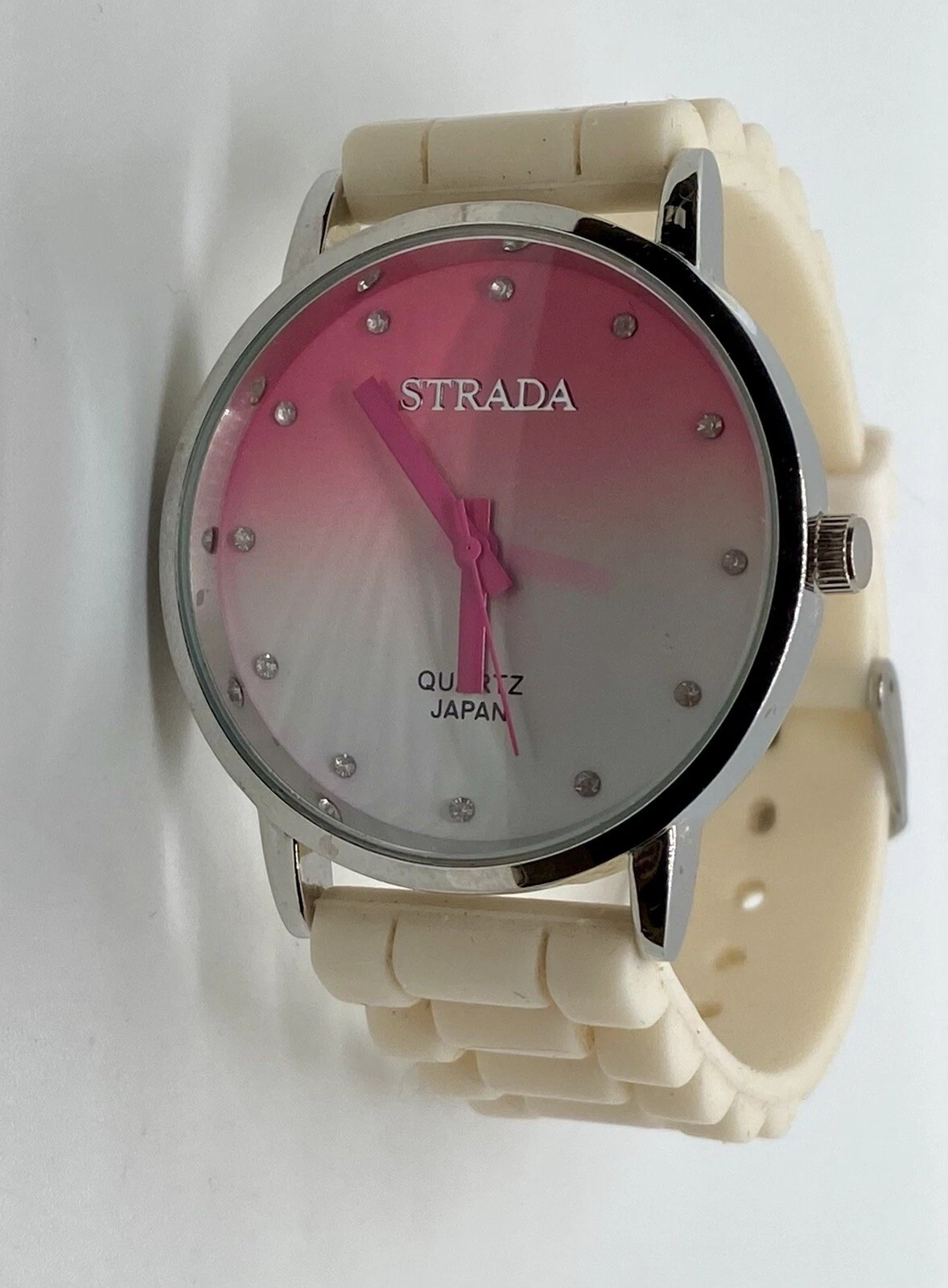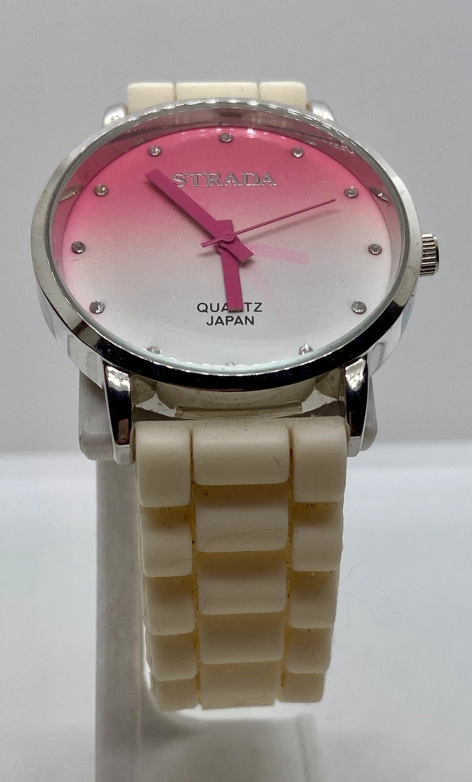 NEW STRADA Ladies Watch Fresh Battery Iced Indices Pink Ombré Dial White Band