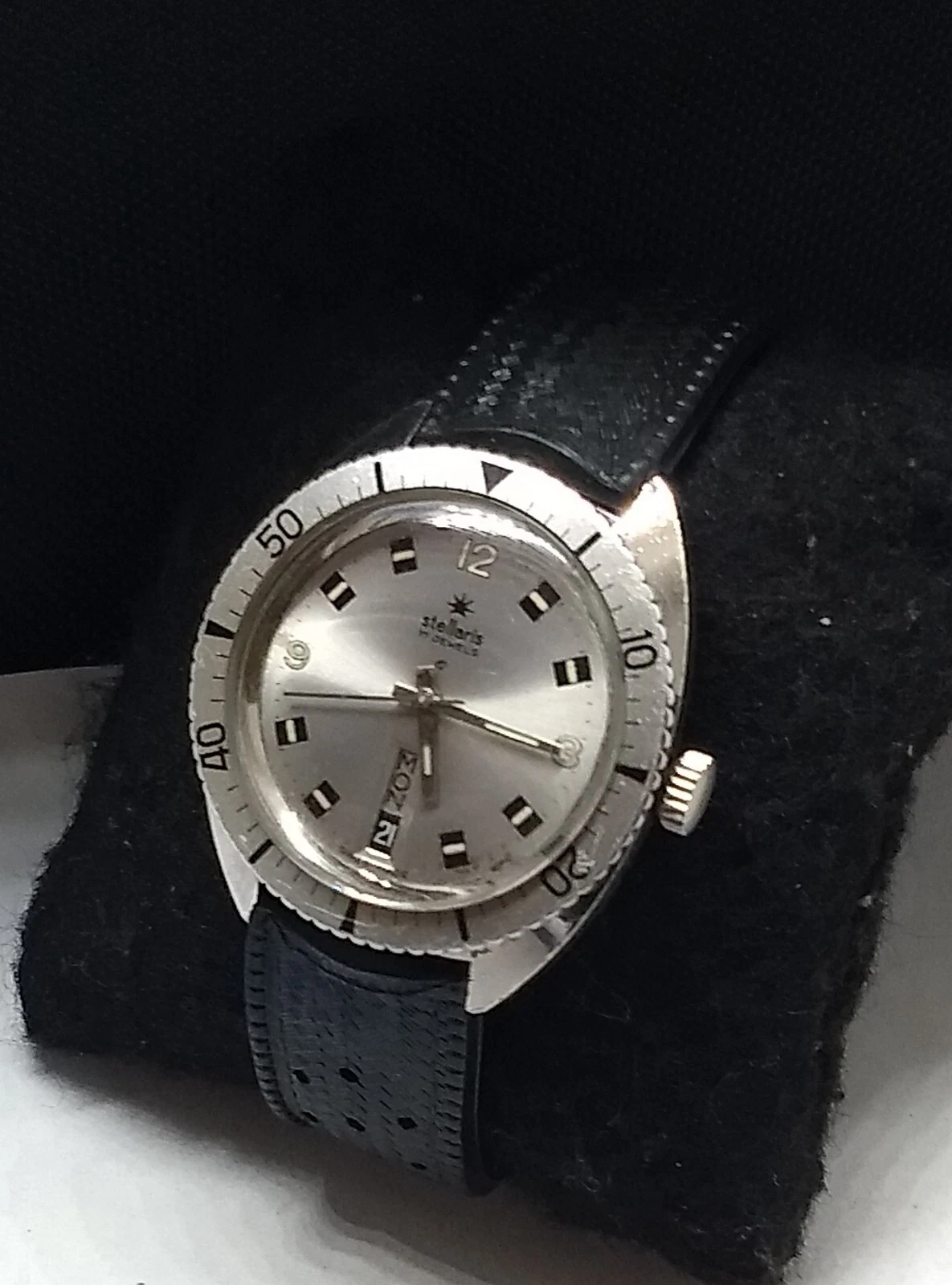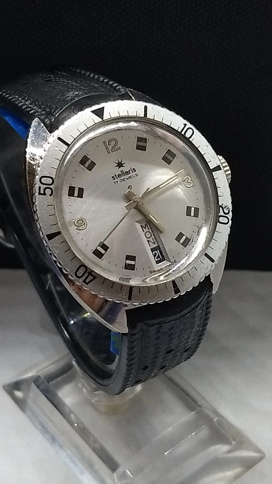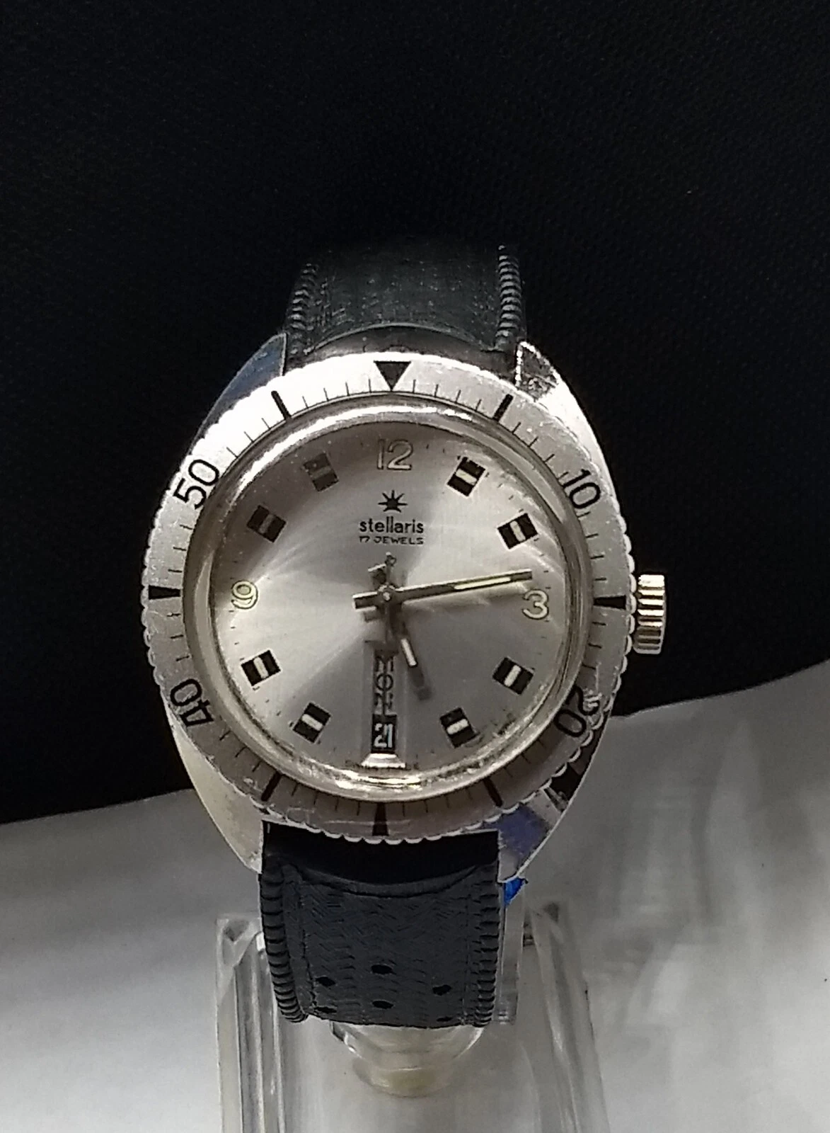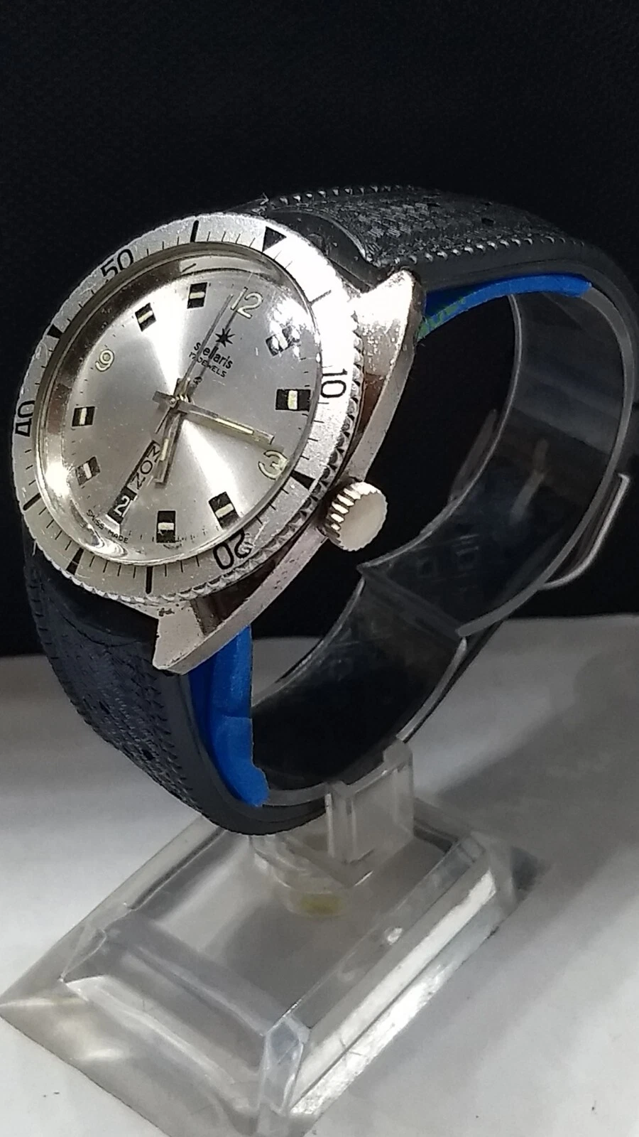 Vintage 70s Stellaris Skin Diver Watch.17j.Day&Date,At 6:00,Swiss Made Wind Up.