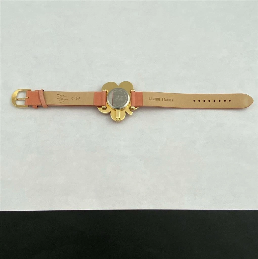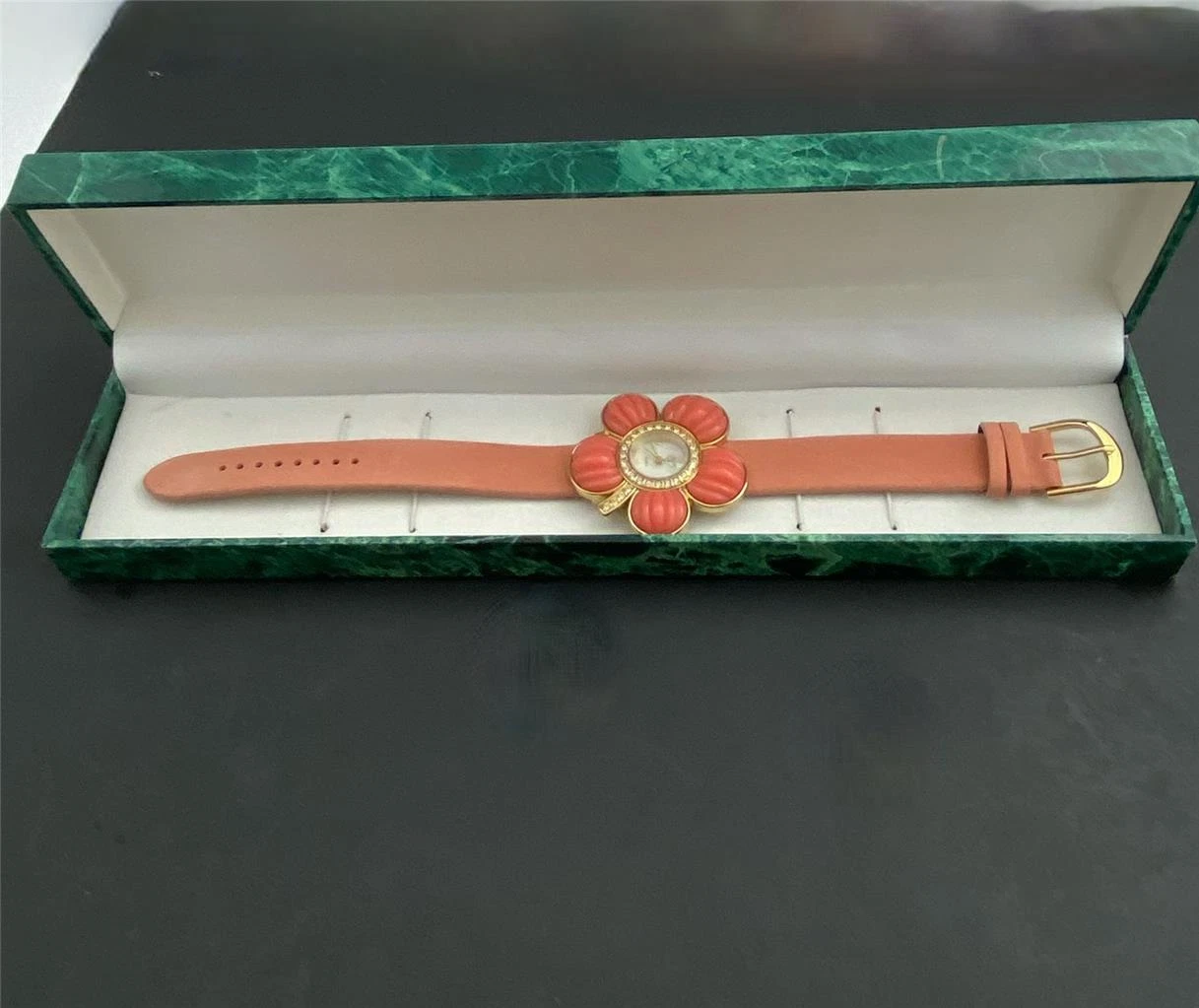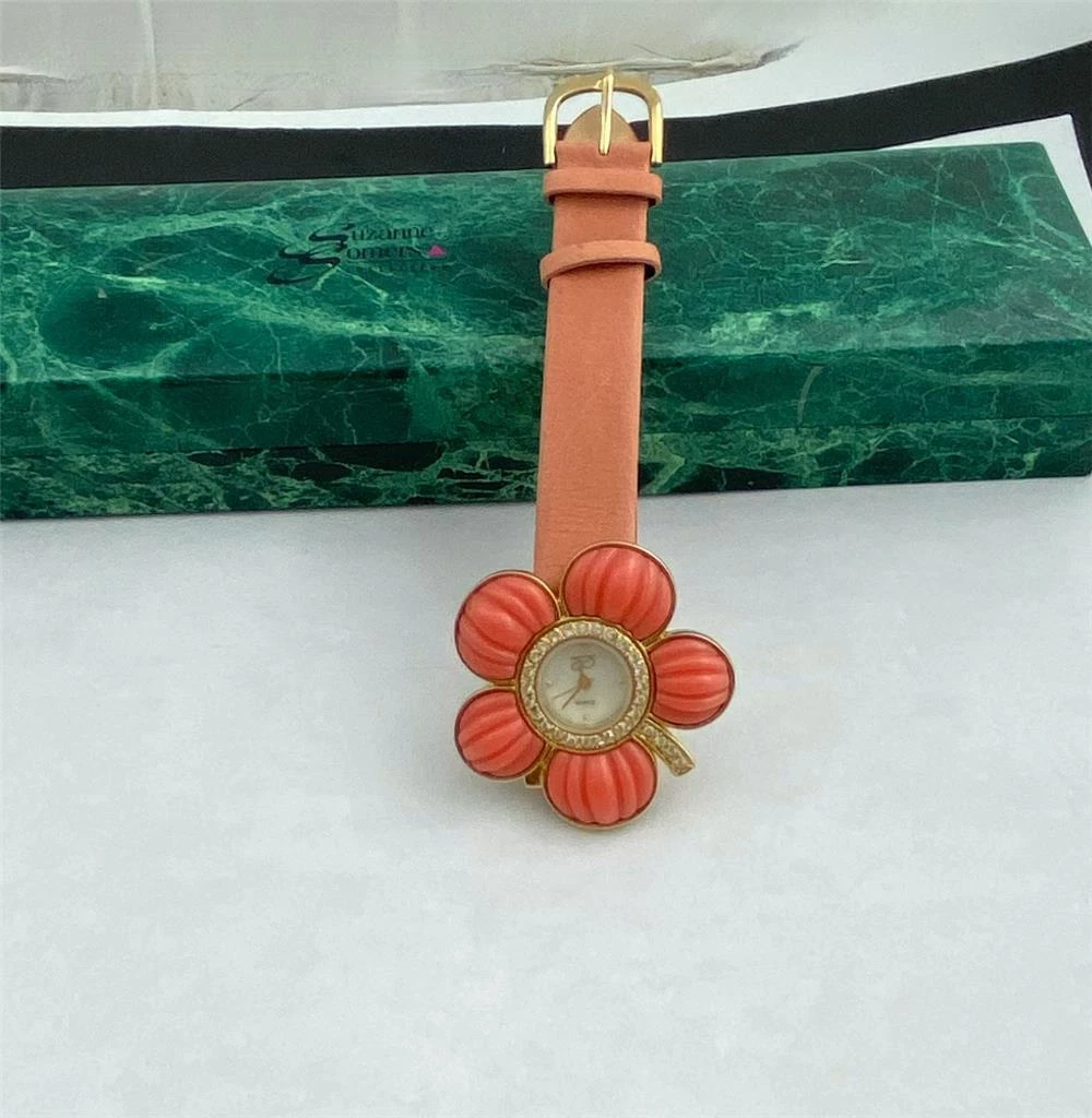 Suzanne Somers Coral Color Flower Crystal Accents Leather Band Watch - new
