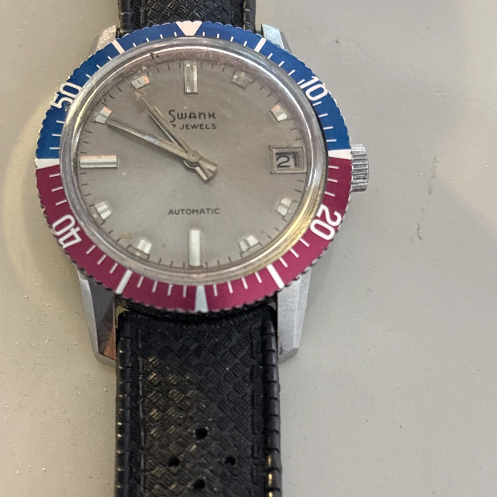Vintage 36mm Swank Men's Automatic Diver Wristwatch Blue Red Pepsi Bezel.