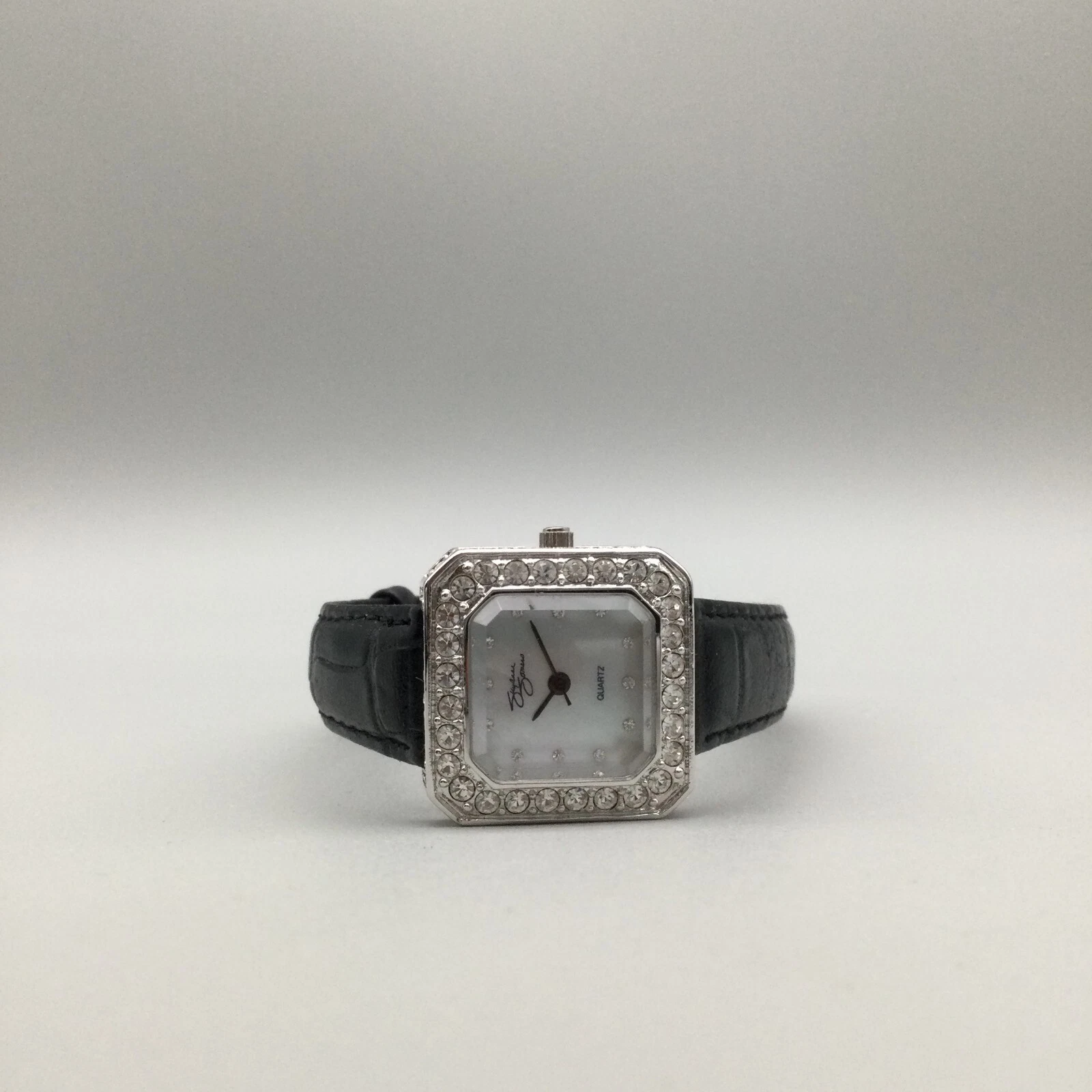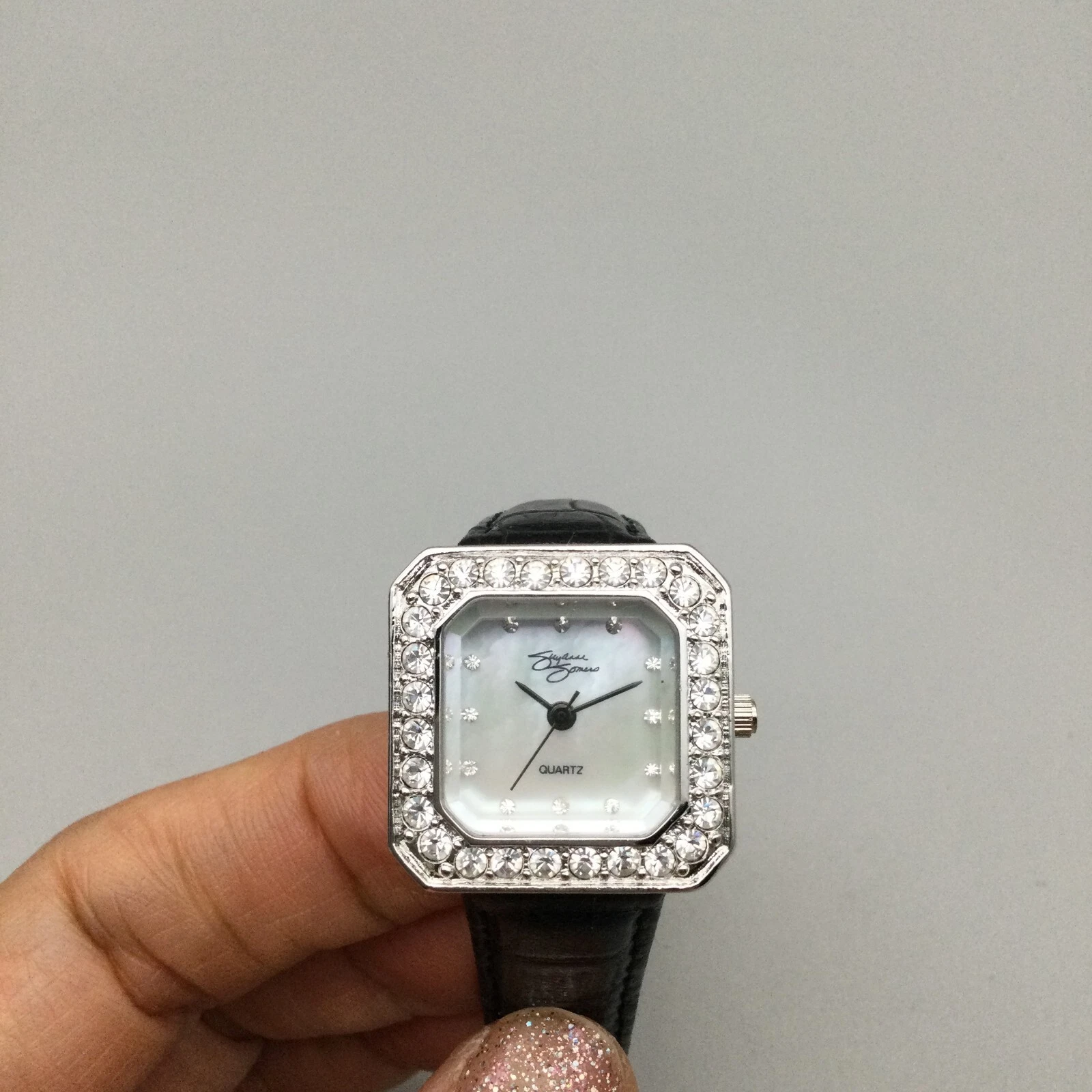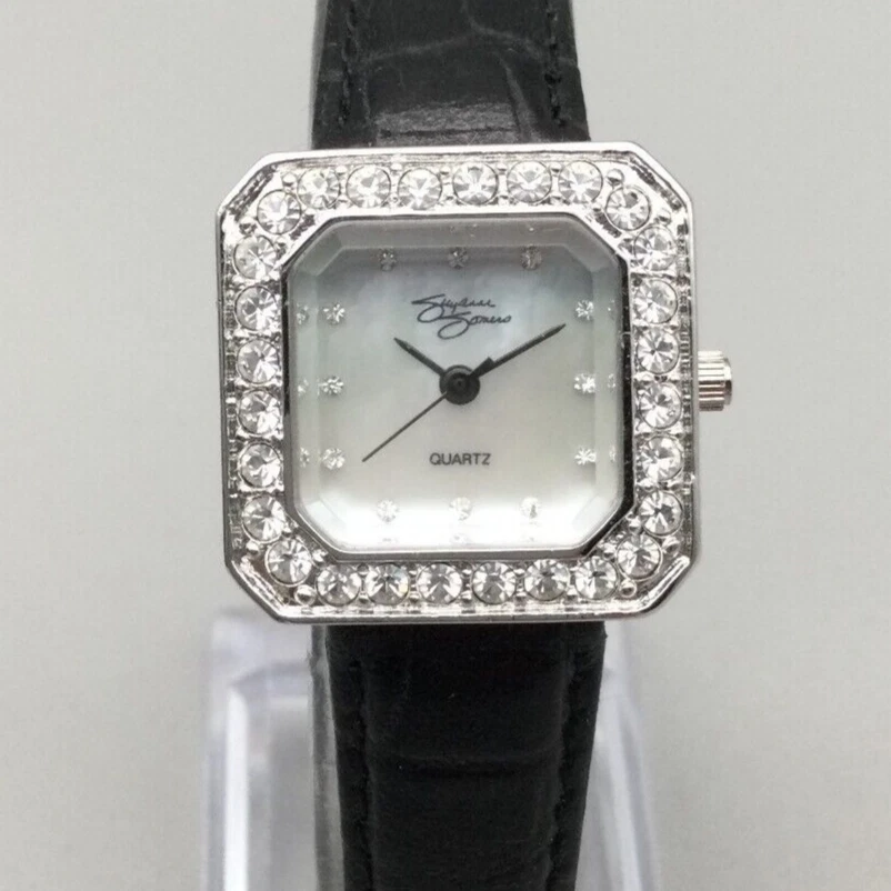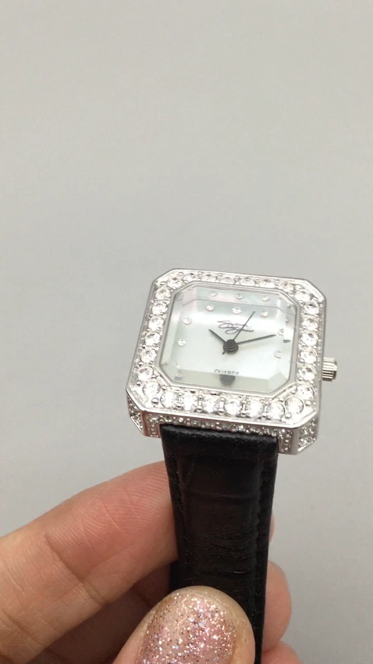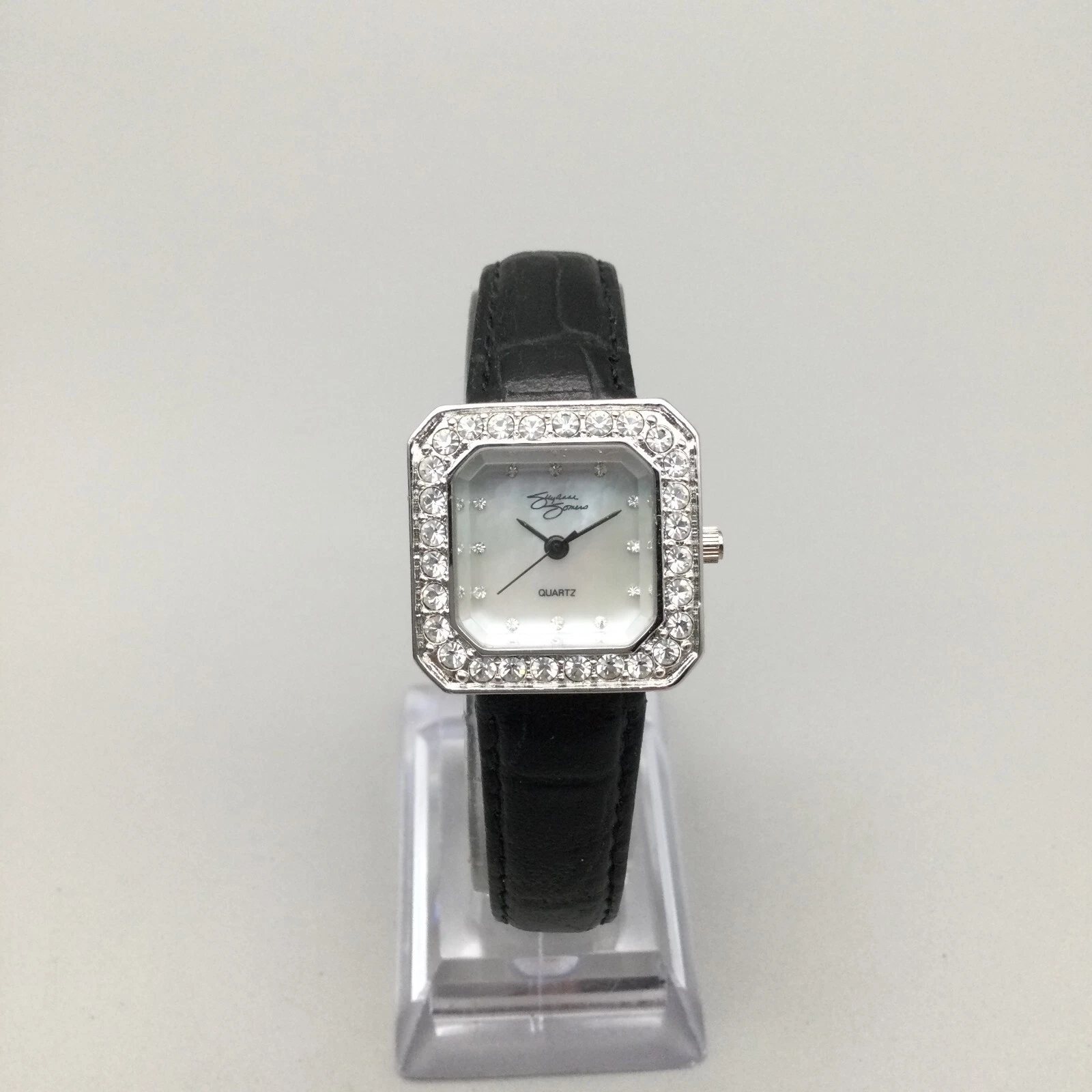 Suzanne Somers Watch Women 24mm Silver Tone MOP Crystals Black Band New Battery