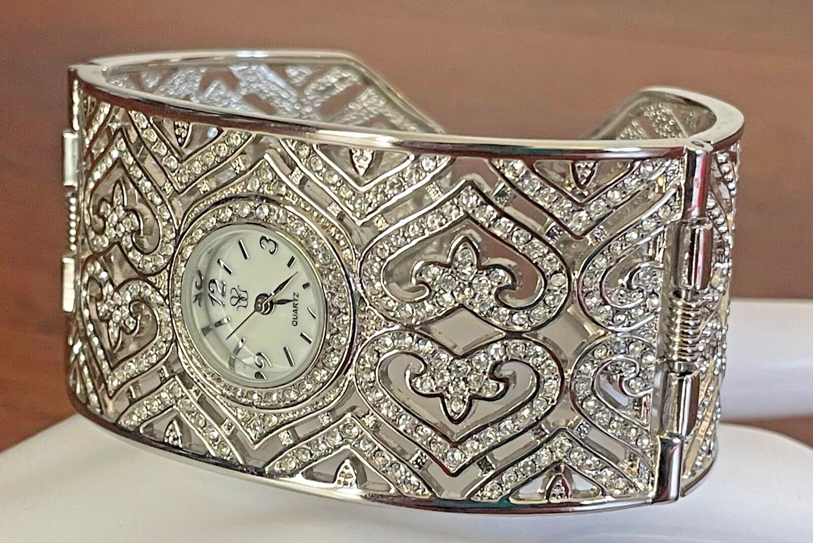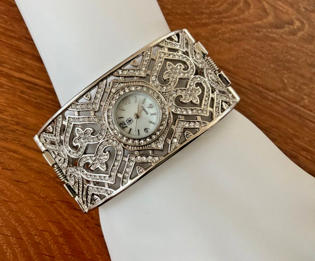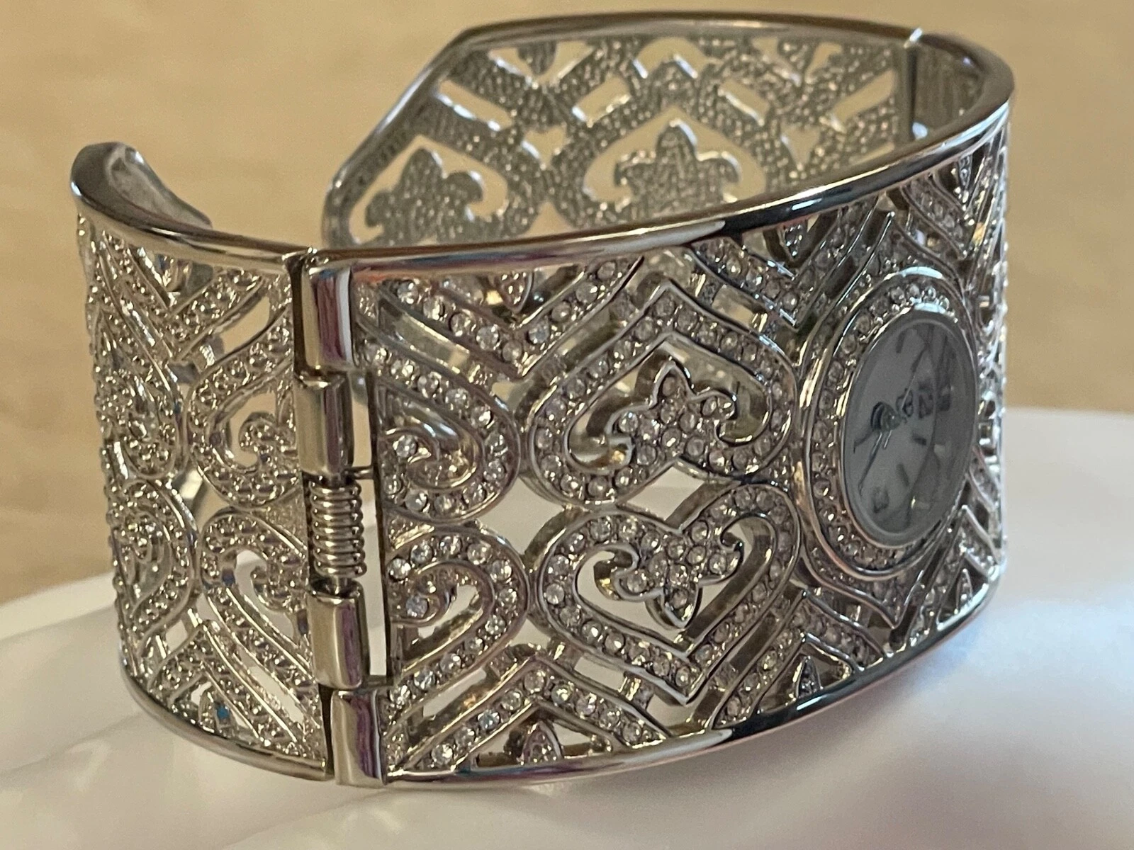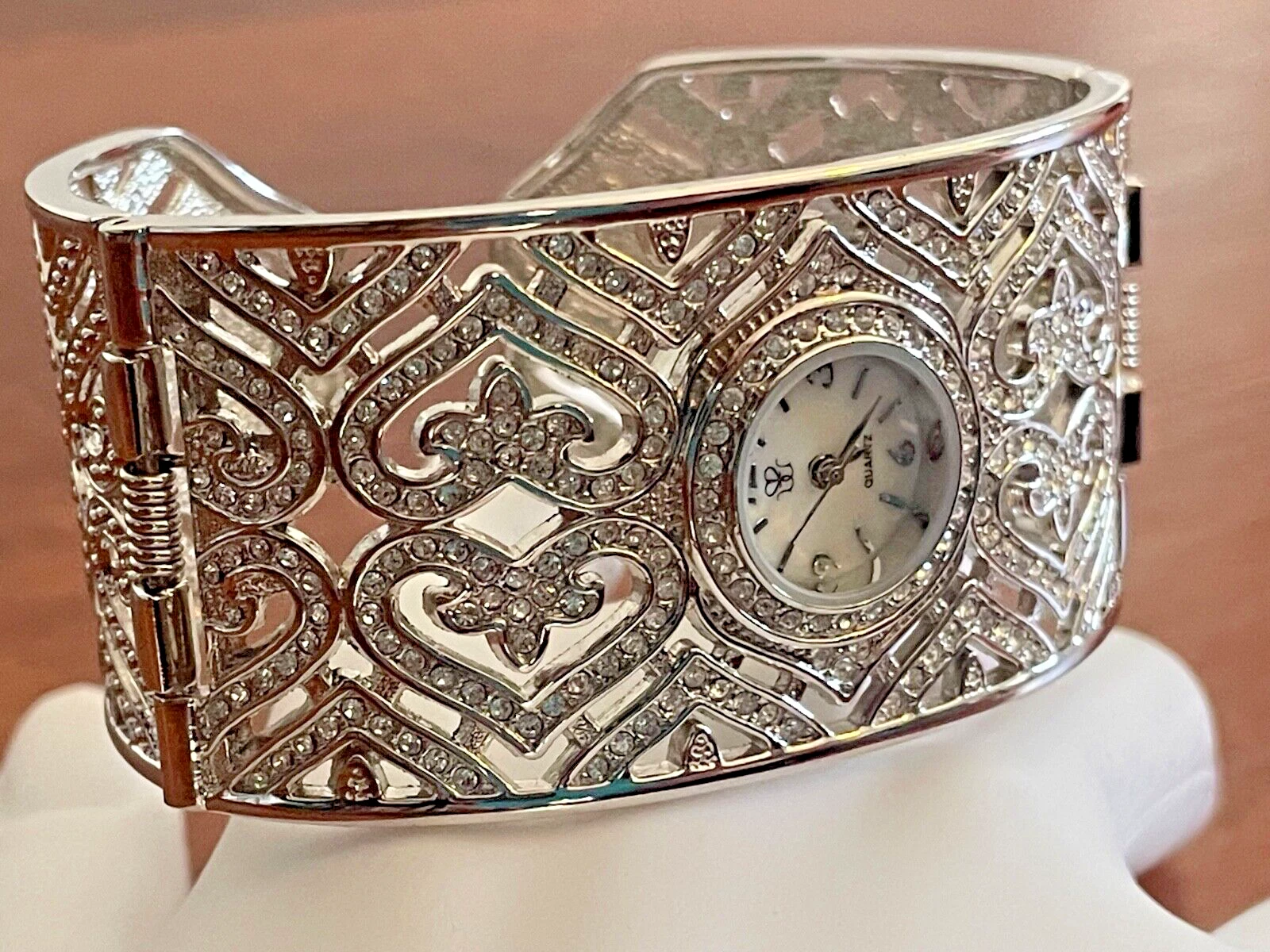 RARE Suzanne Somers Vintage silver tone Rhinestone bangle Bracelet Hinged Watch