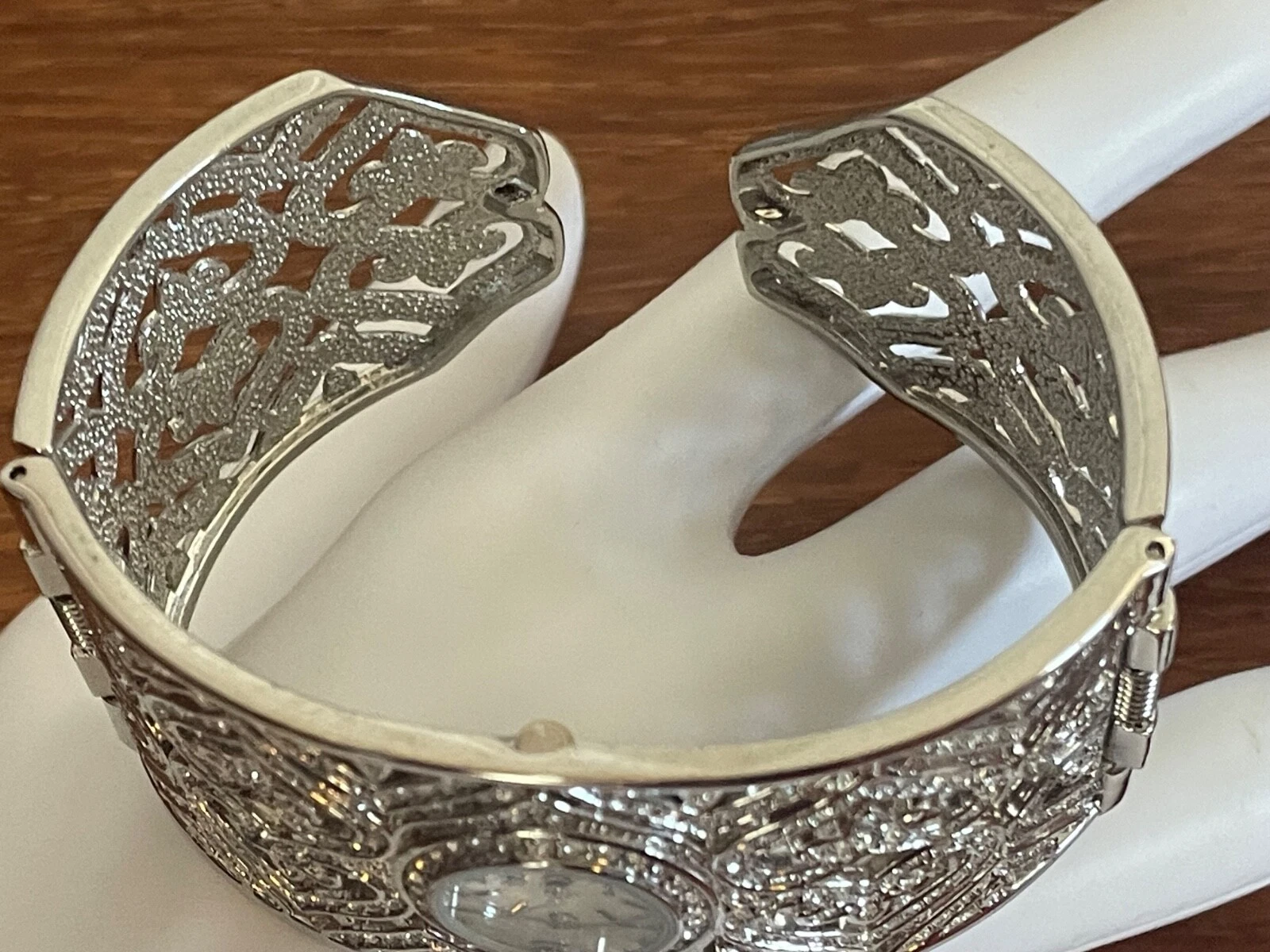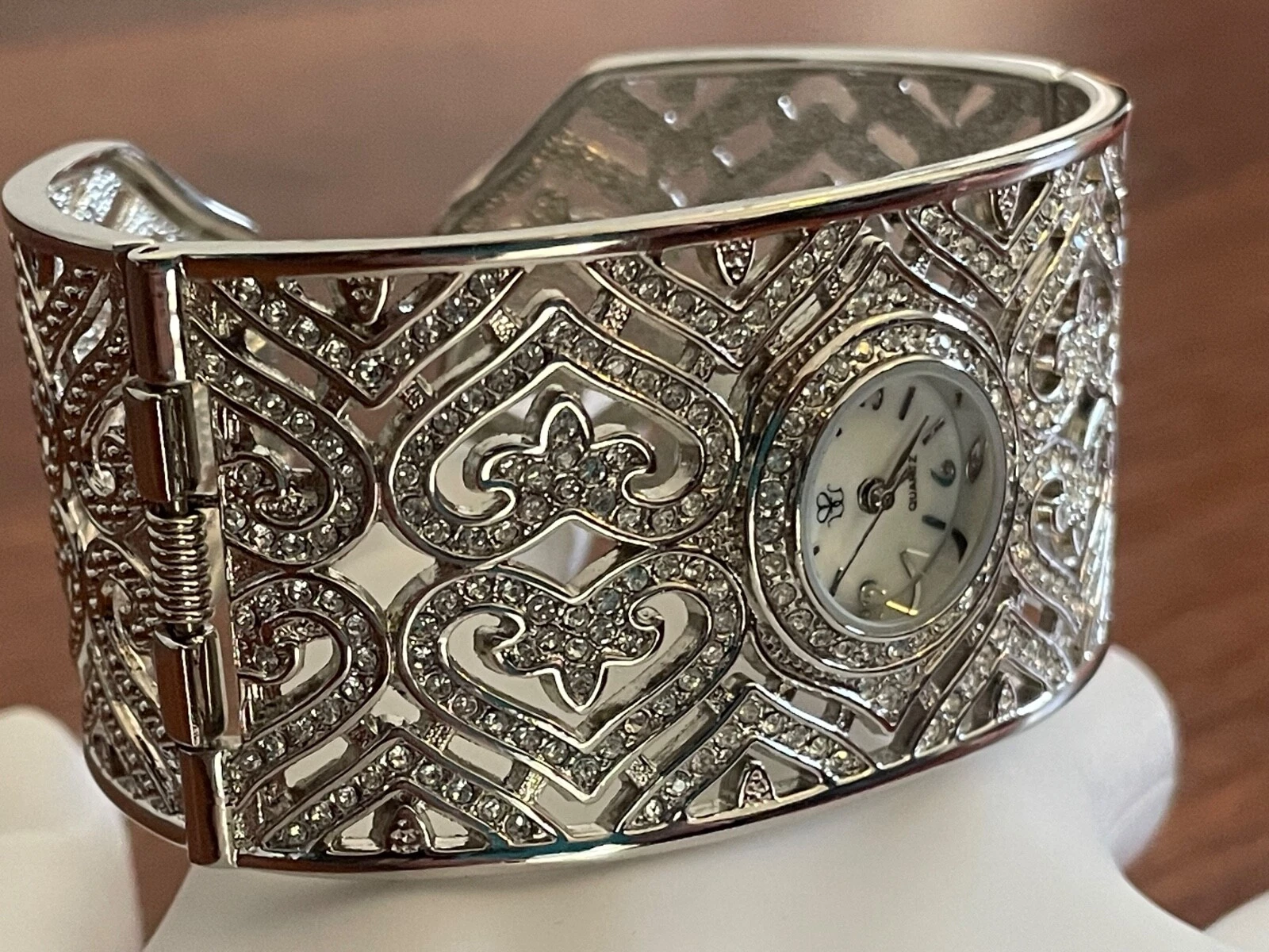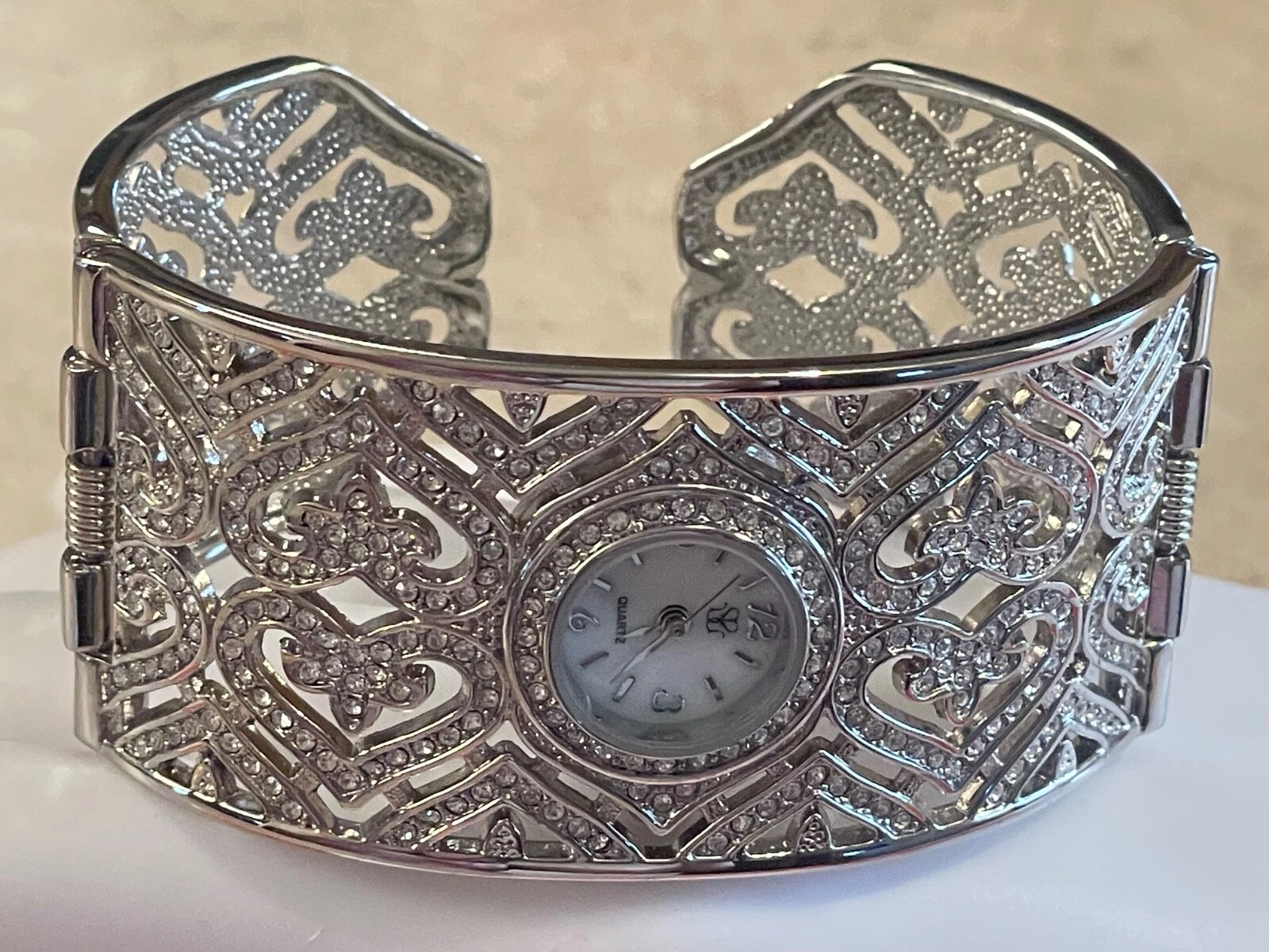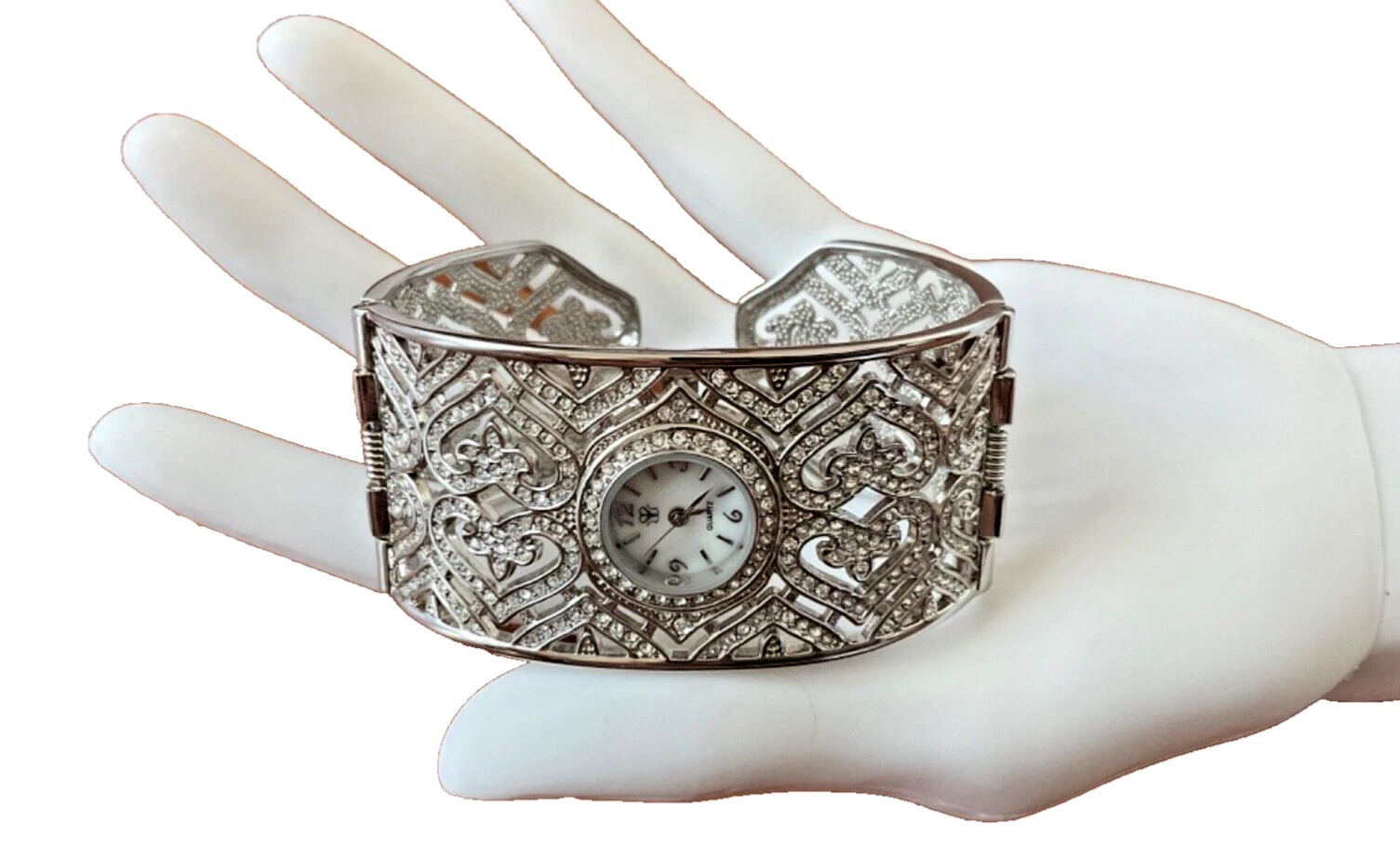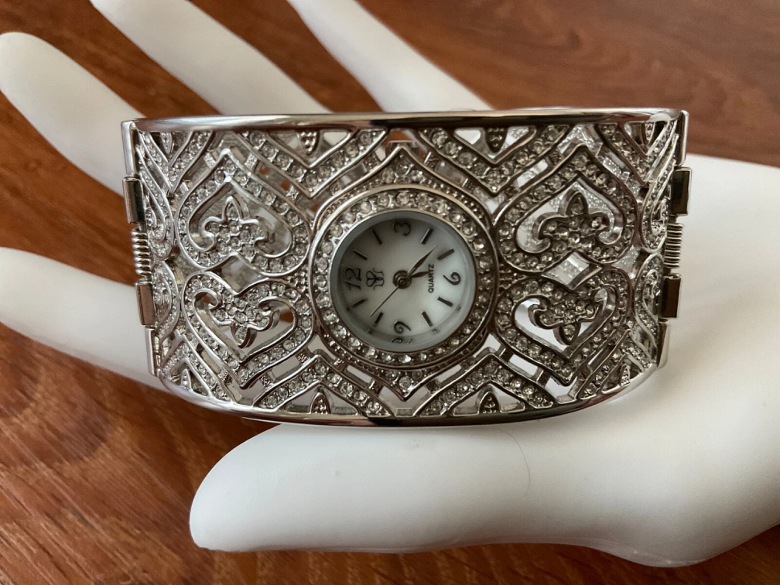 RARE Suzanne Somers Vintage silver tone Rhinestone bangle Bracelet Hinged Watch