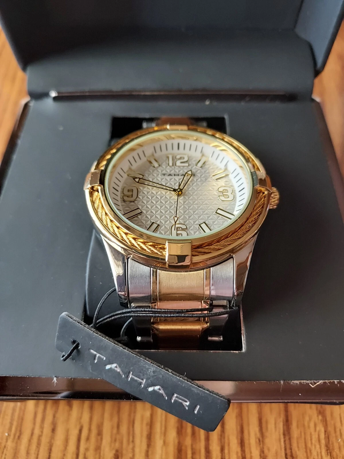 TAHARI men's watch WORKING gold & silver tone NEW IN BOX mrsp $119