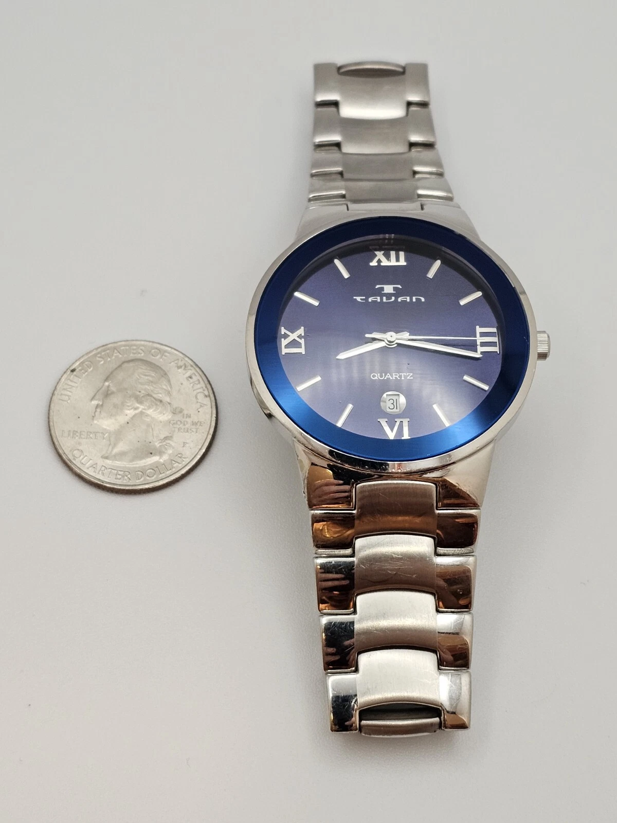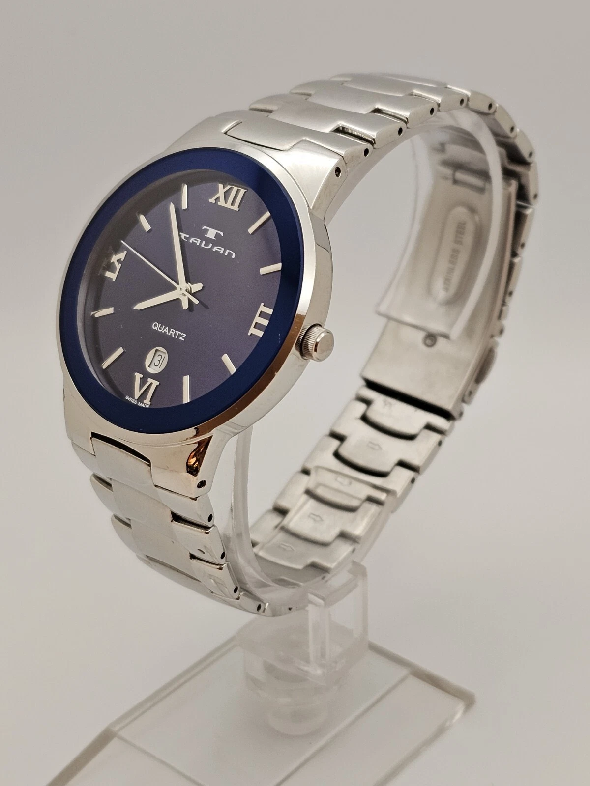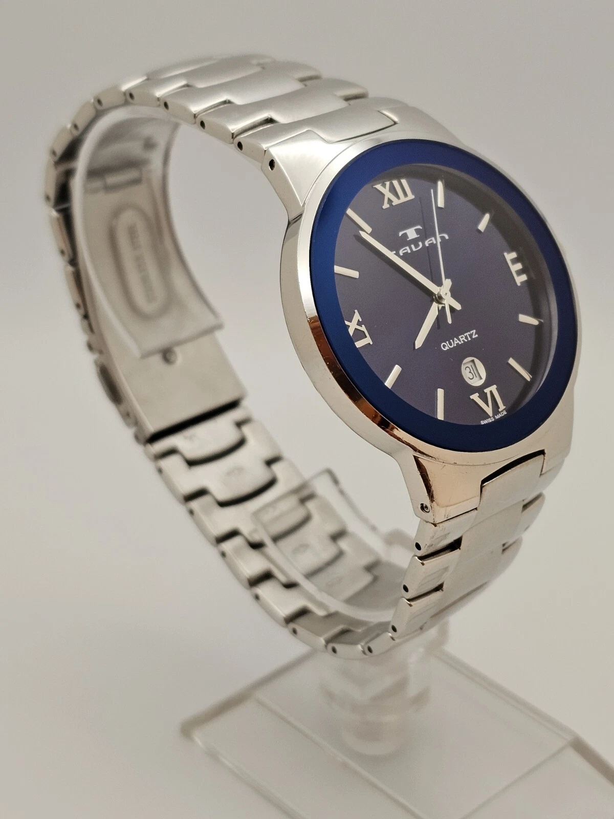 TAVAN MENS QUARTZ DATE WATCH BLUE SUNBURST DIAL SWISS MADE STAINLESS BRACELET