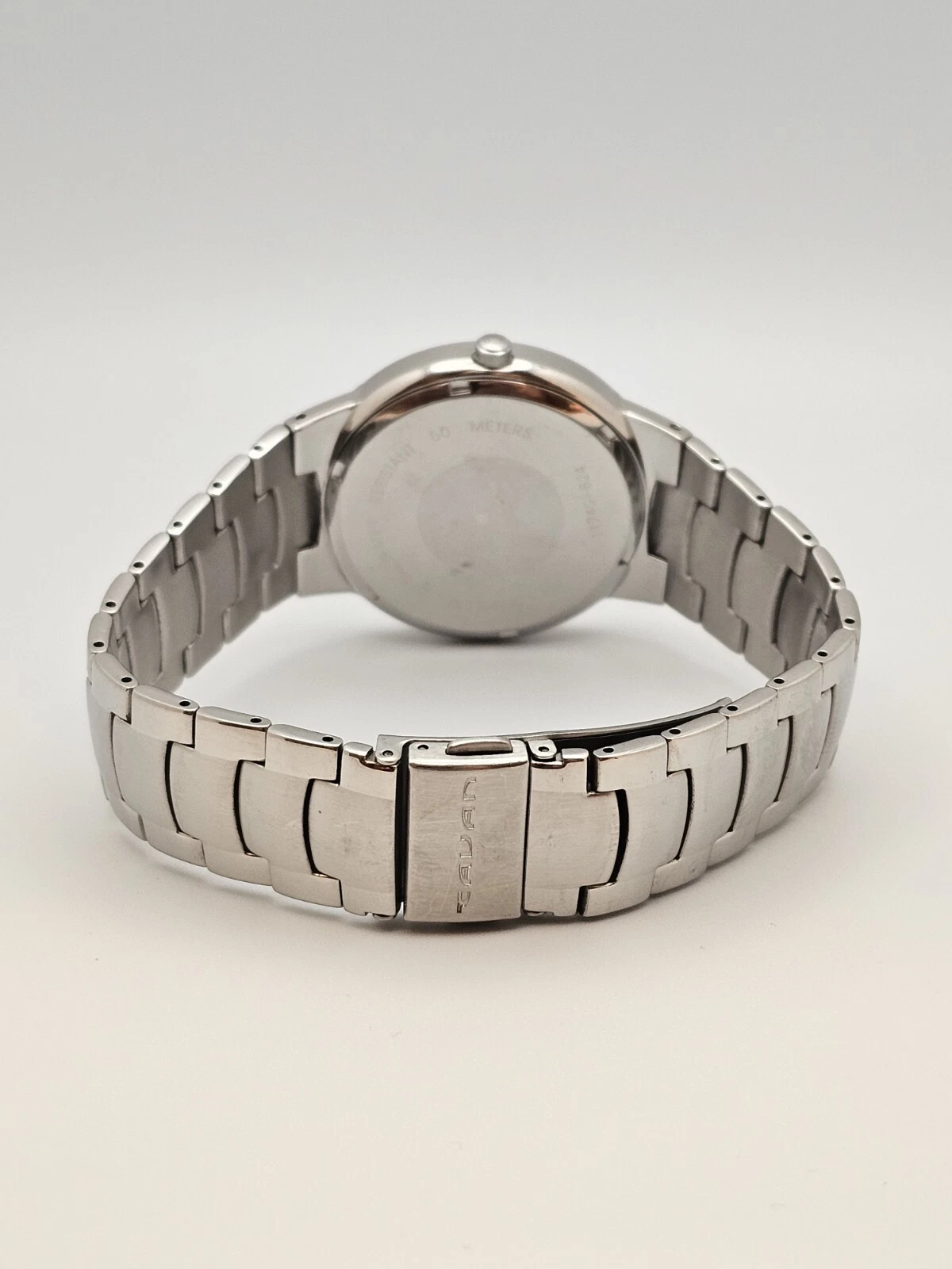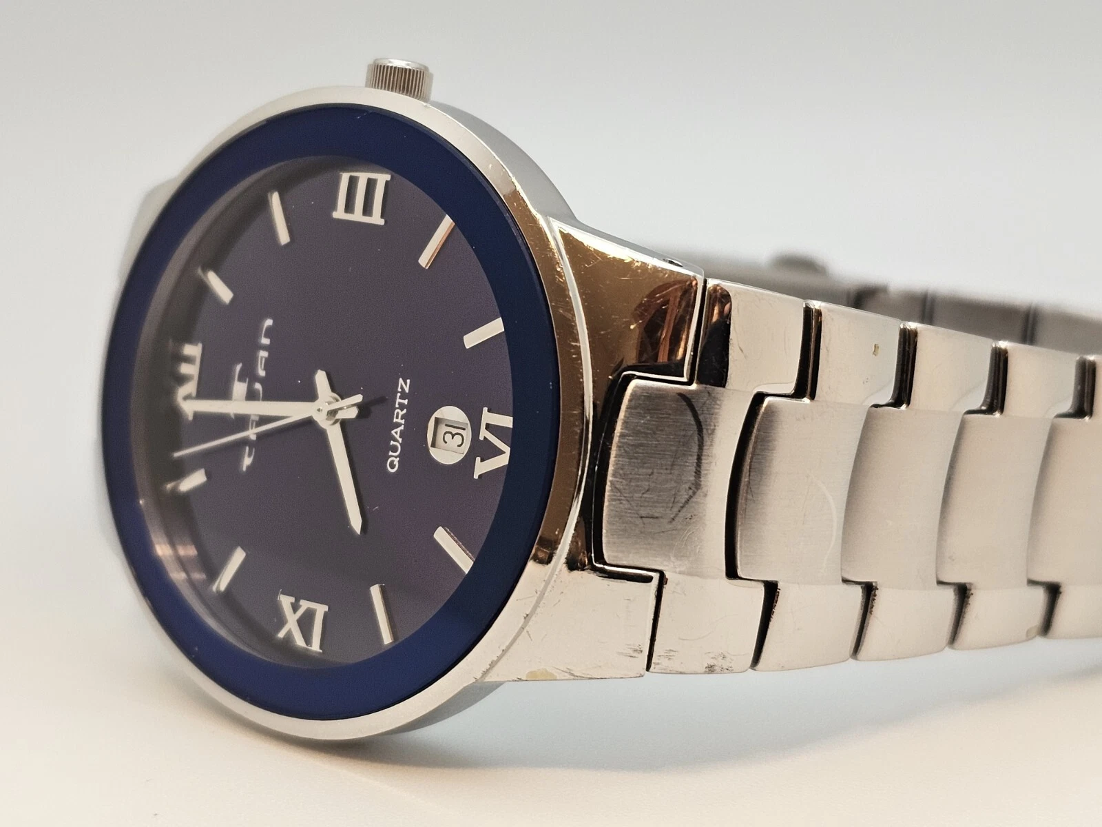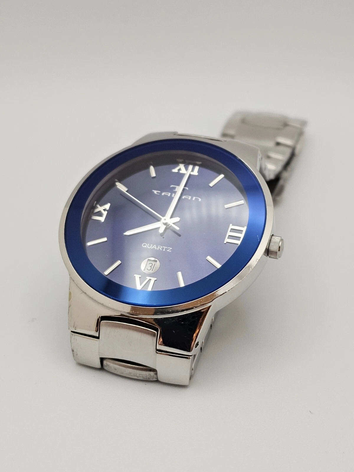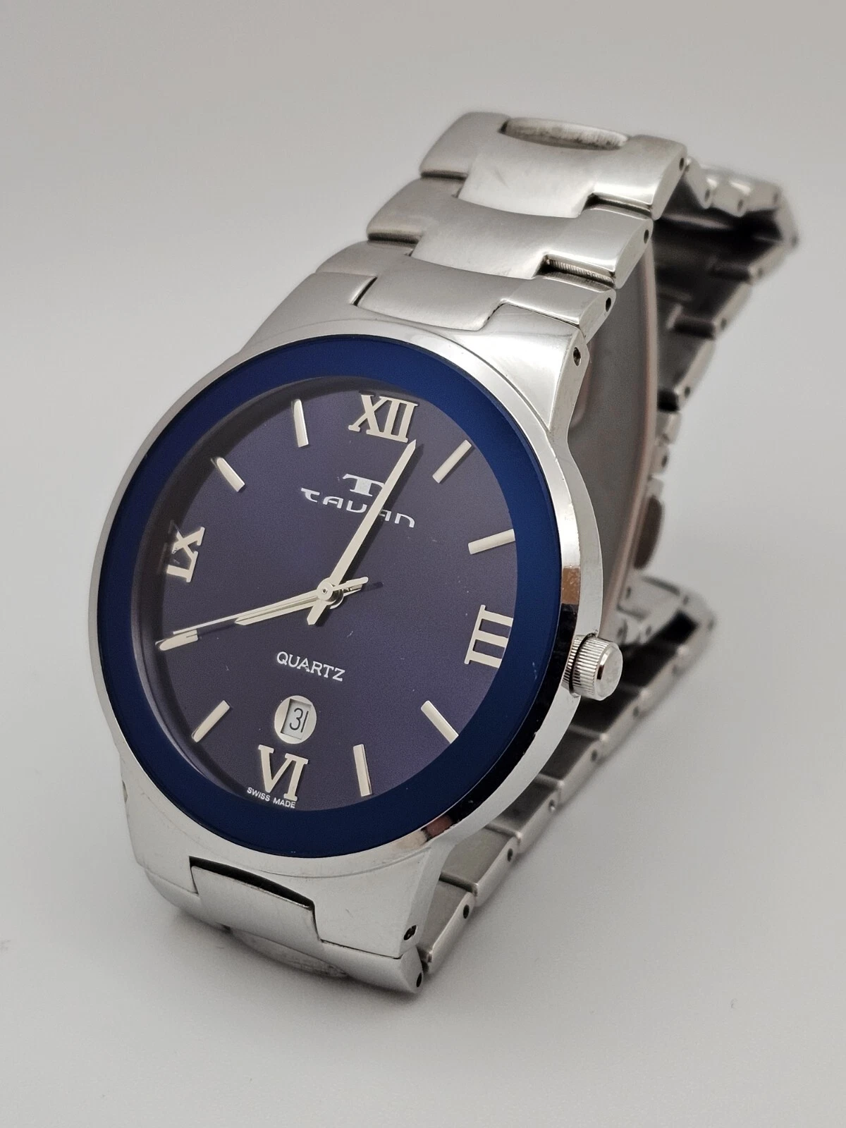 TAVAN MENS QUARTZ DATE WATCH BLUE SUNBURST DIAL SWISS MADE STAINLESS BRACELET