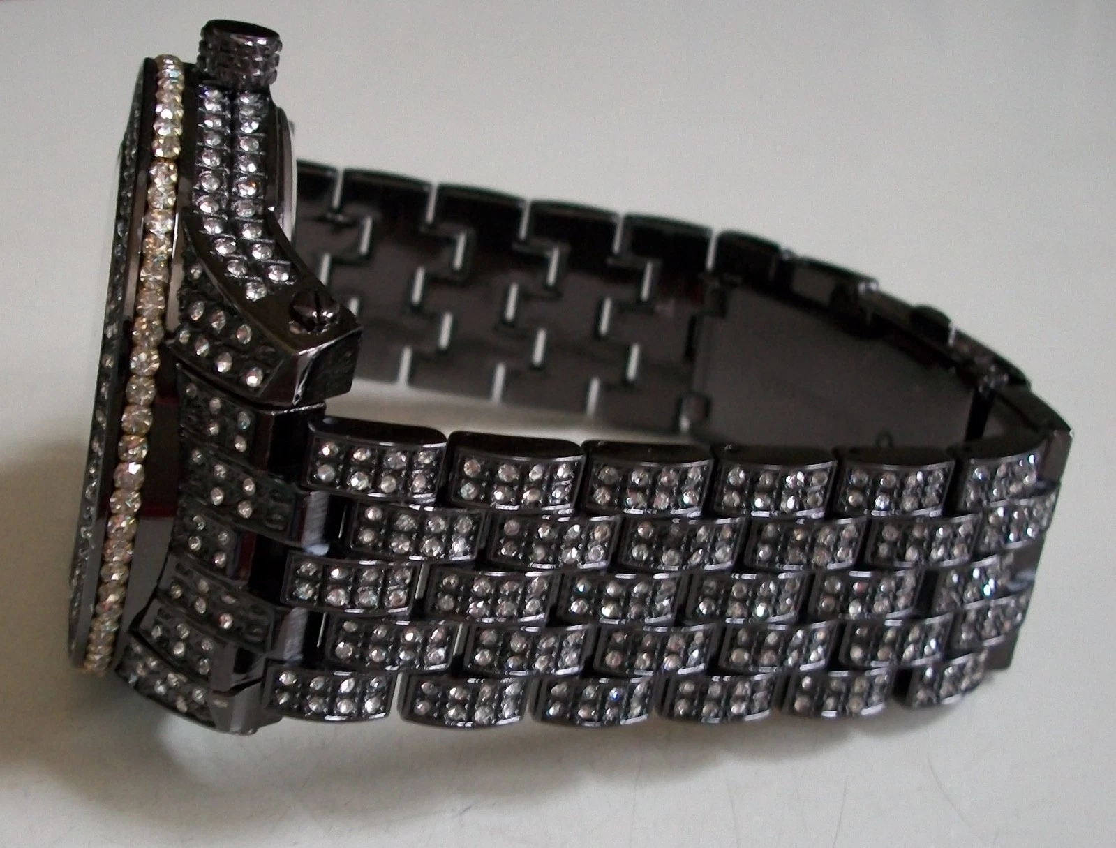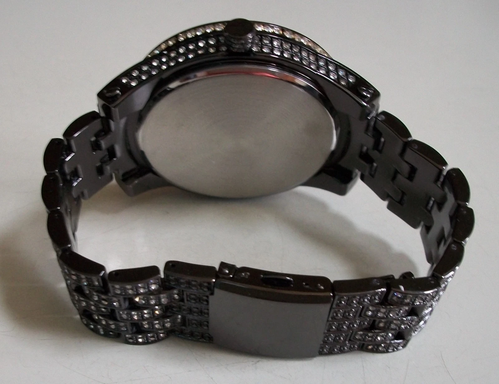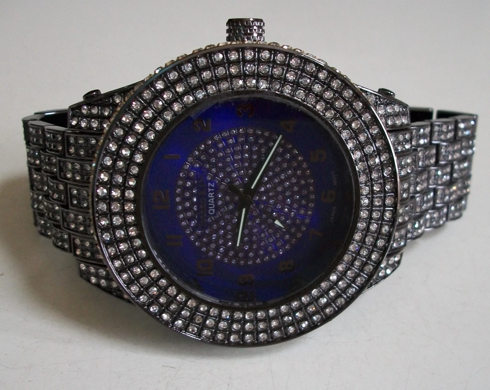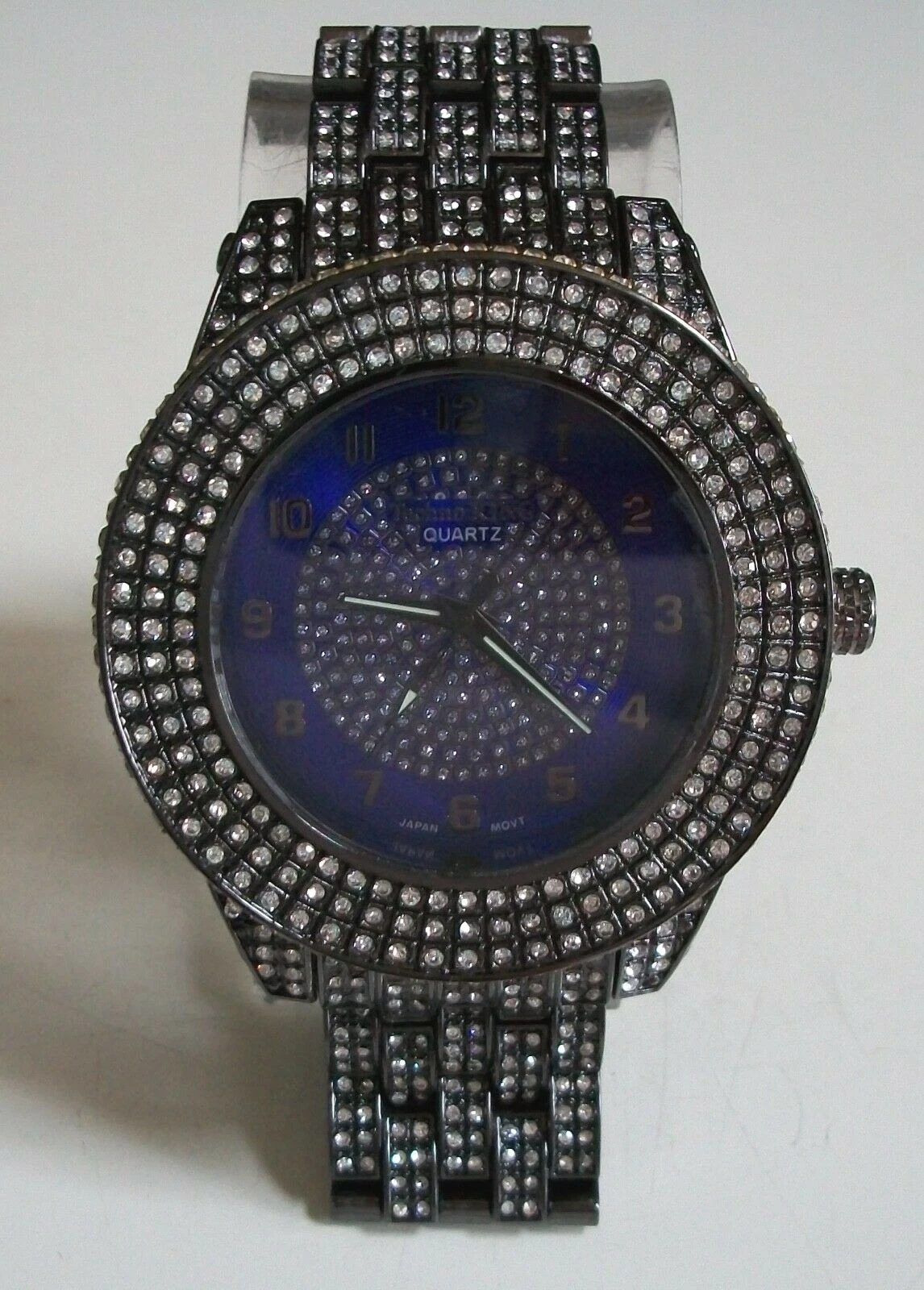 Men's Stone Blue Dial Hematite Black Finish Fashion Dressy Hip Hop Link Watch