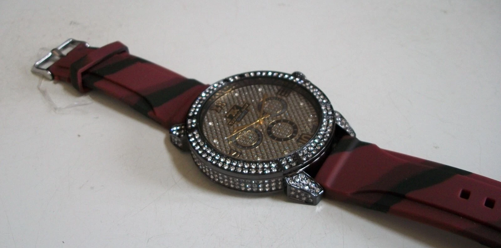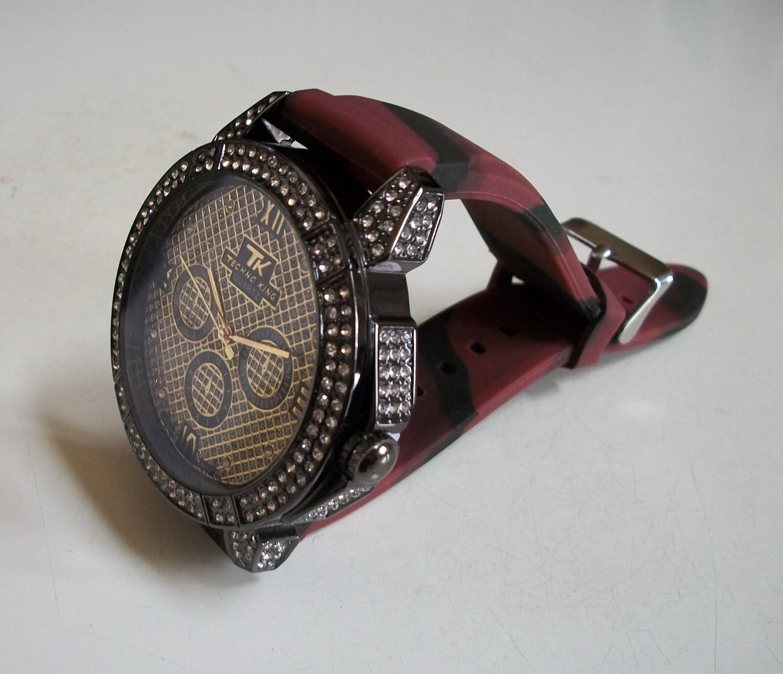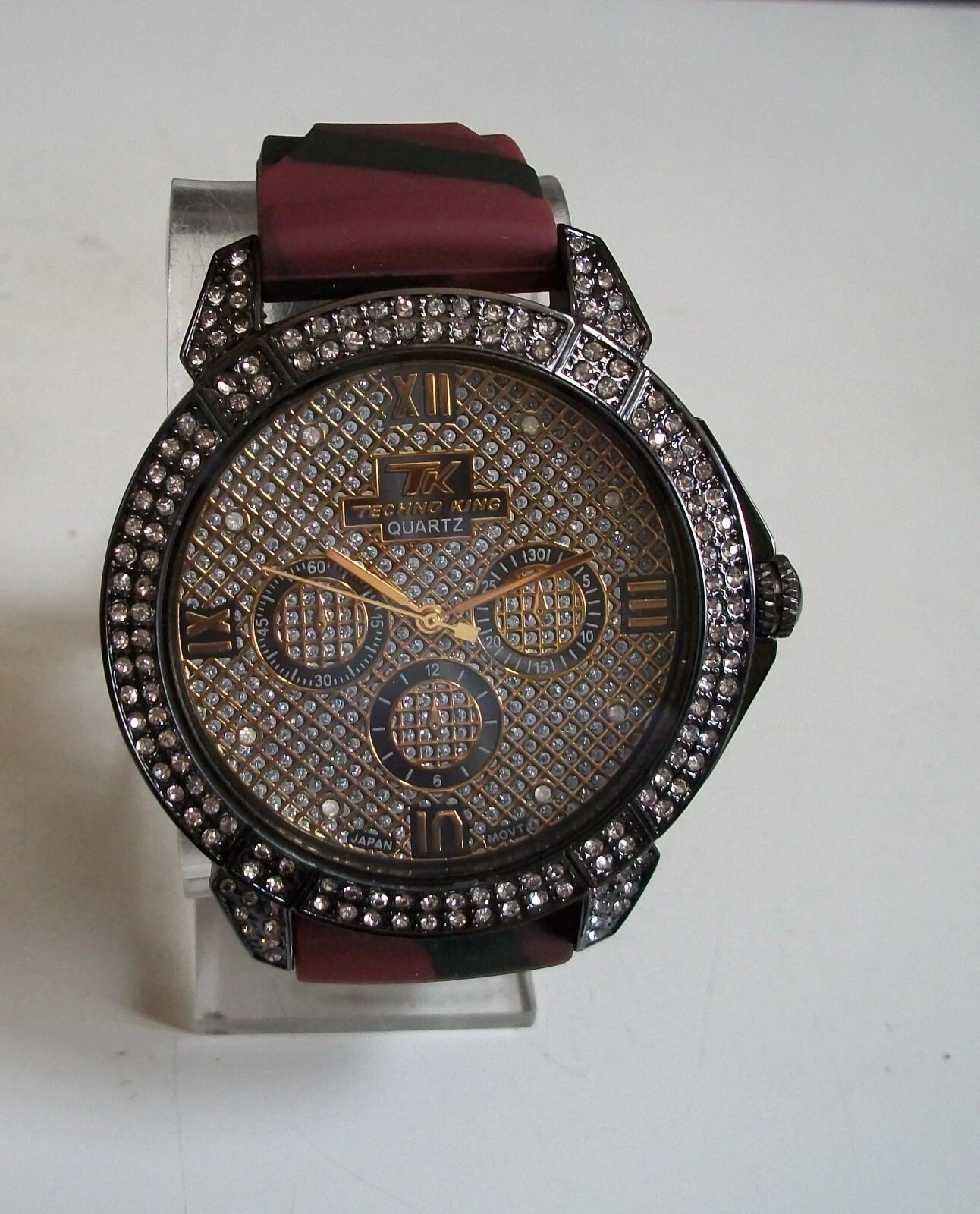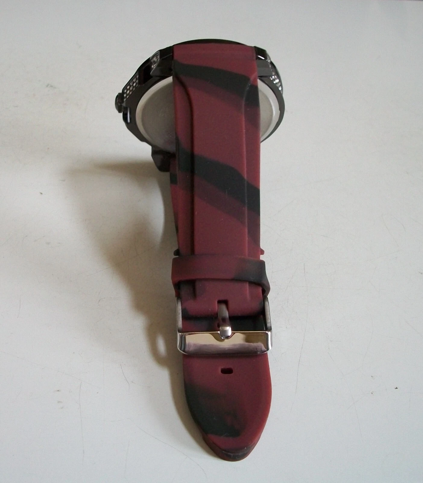 Men's Stones Hematite Finish Burgundy & Black Silicon Band Fashion Hip Hop Watch