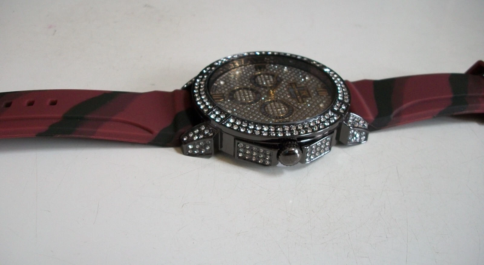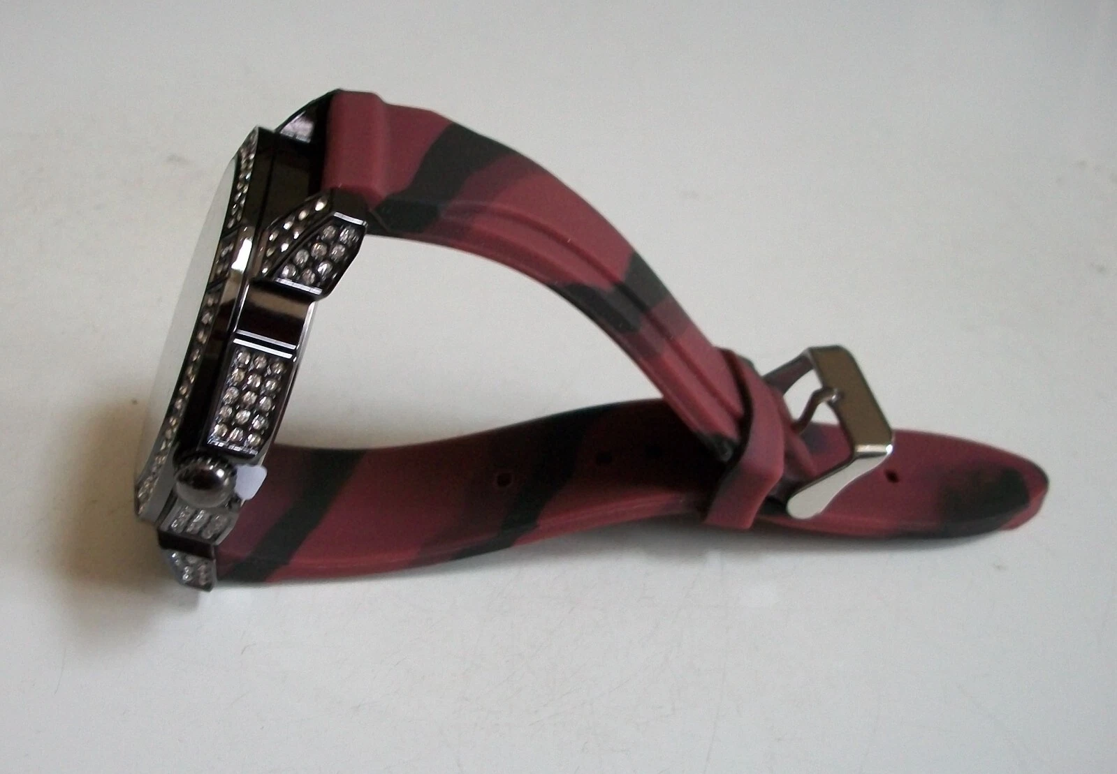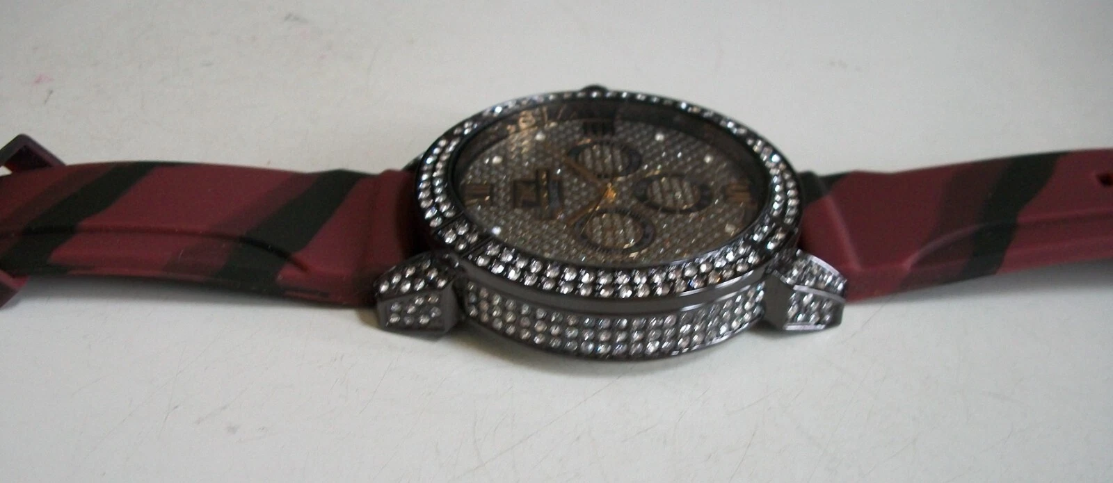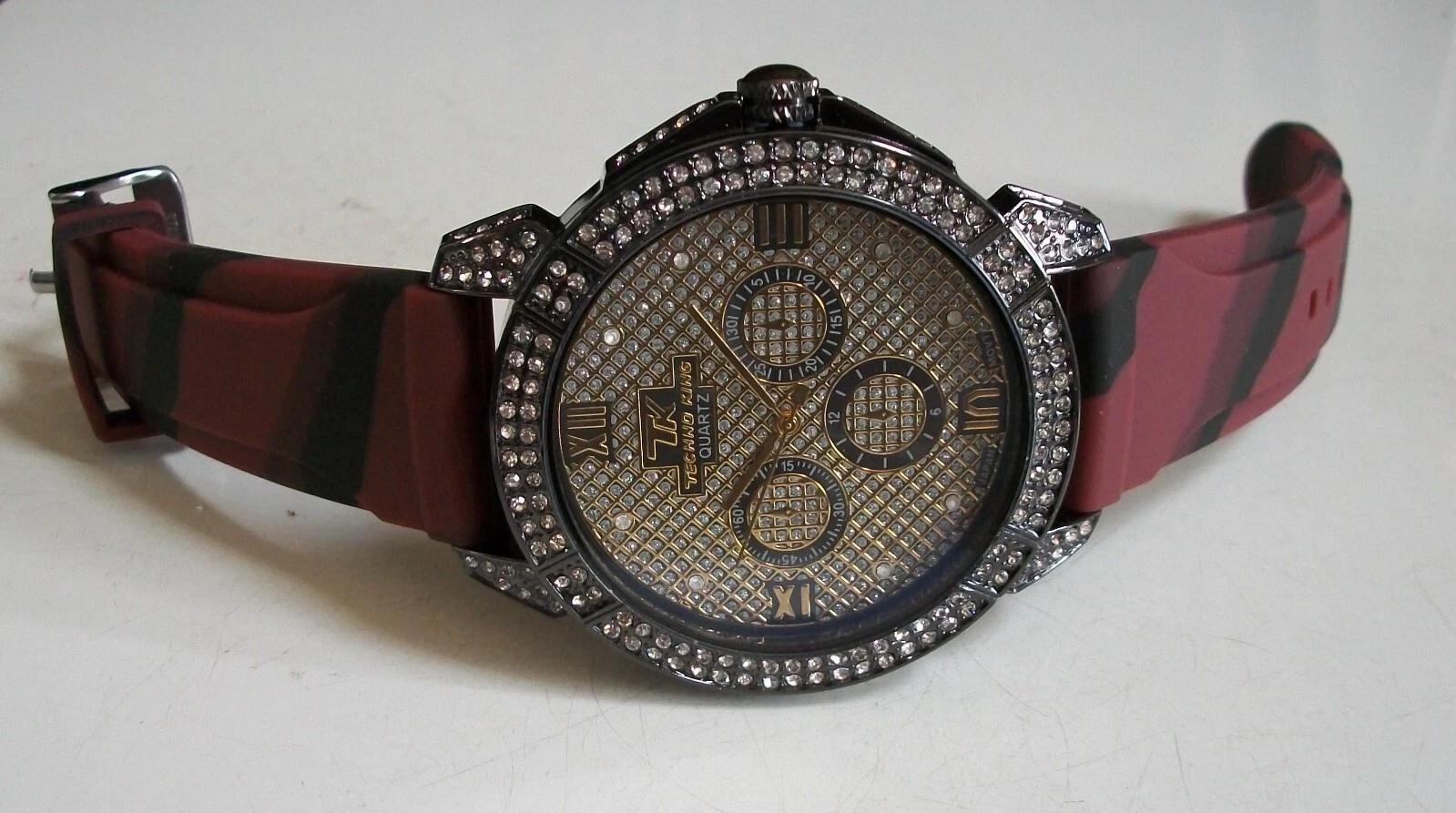 Men's Stones Hematite Finish Burgundy & Black Silicon Band Fashion Hip Hop Watch