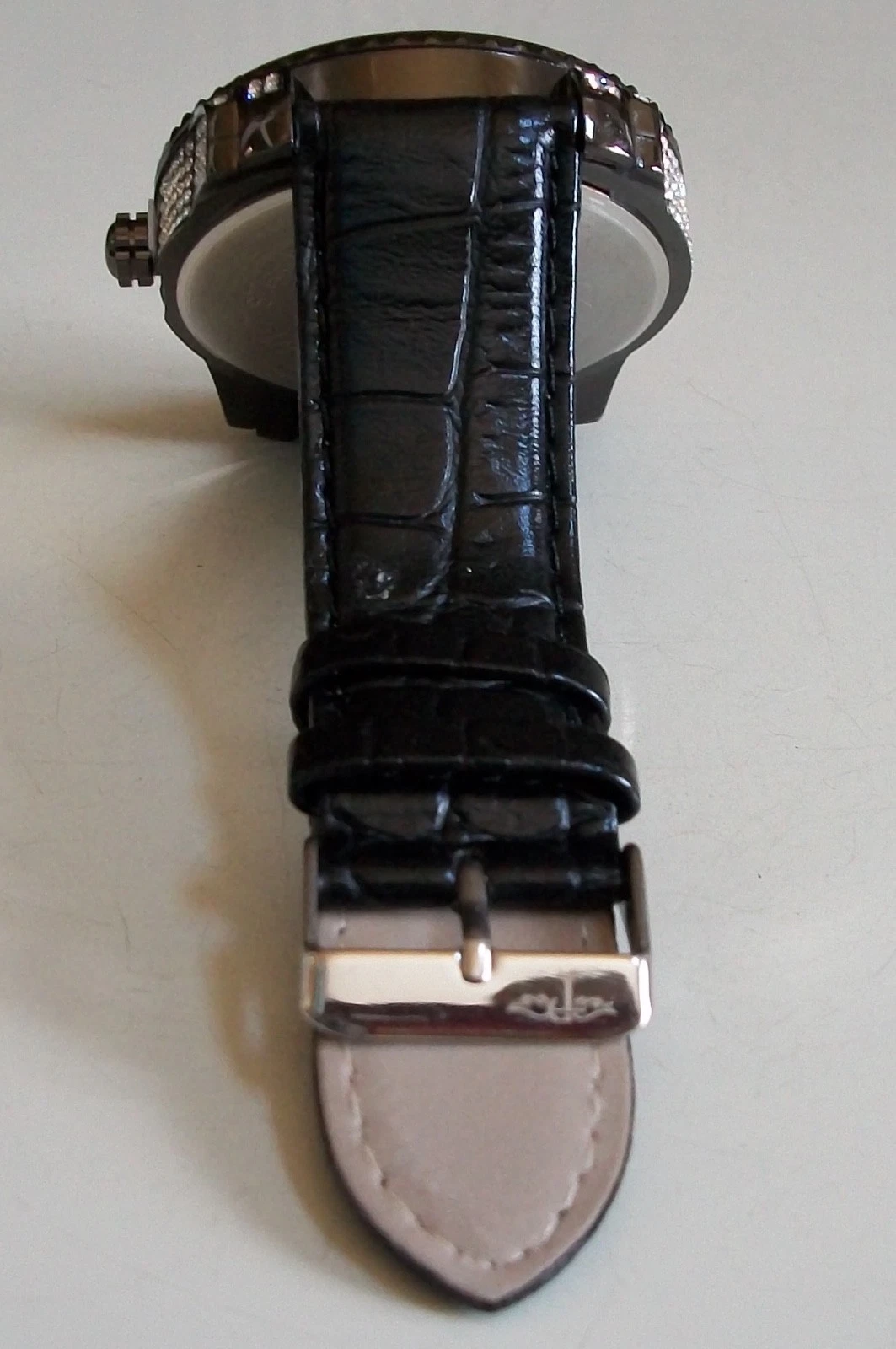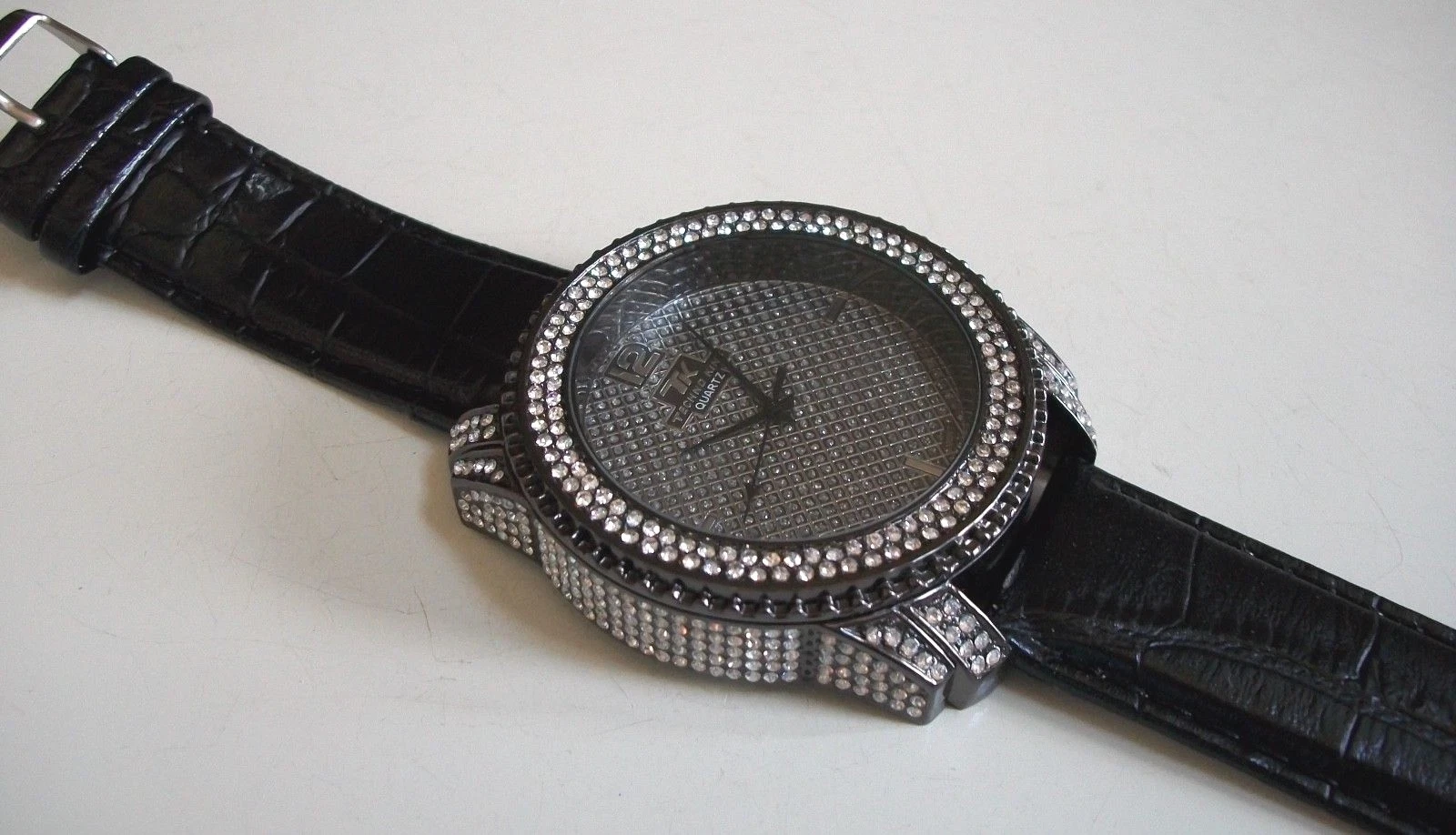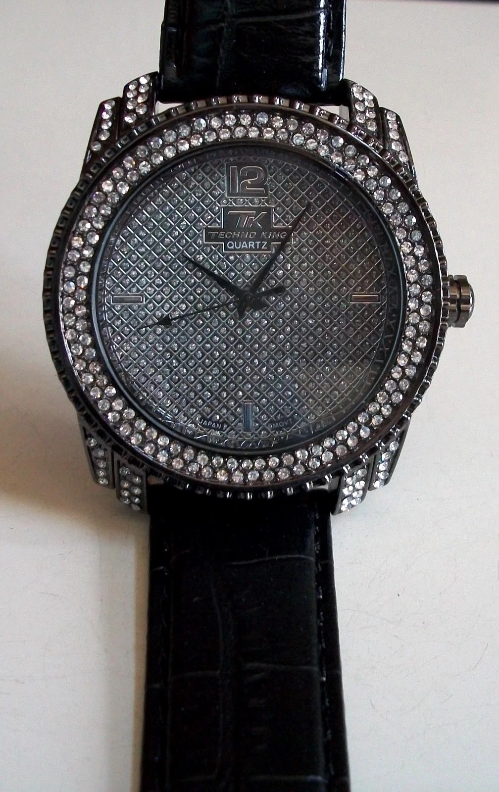 Men's Stone Hematite Finish Black Leather Band Fashion Hip Hop Watch
