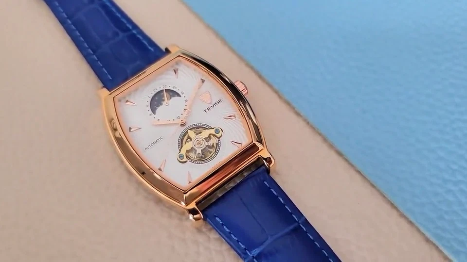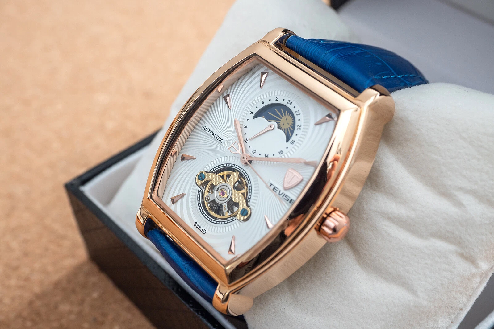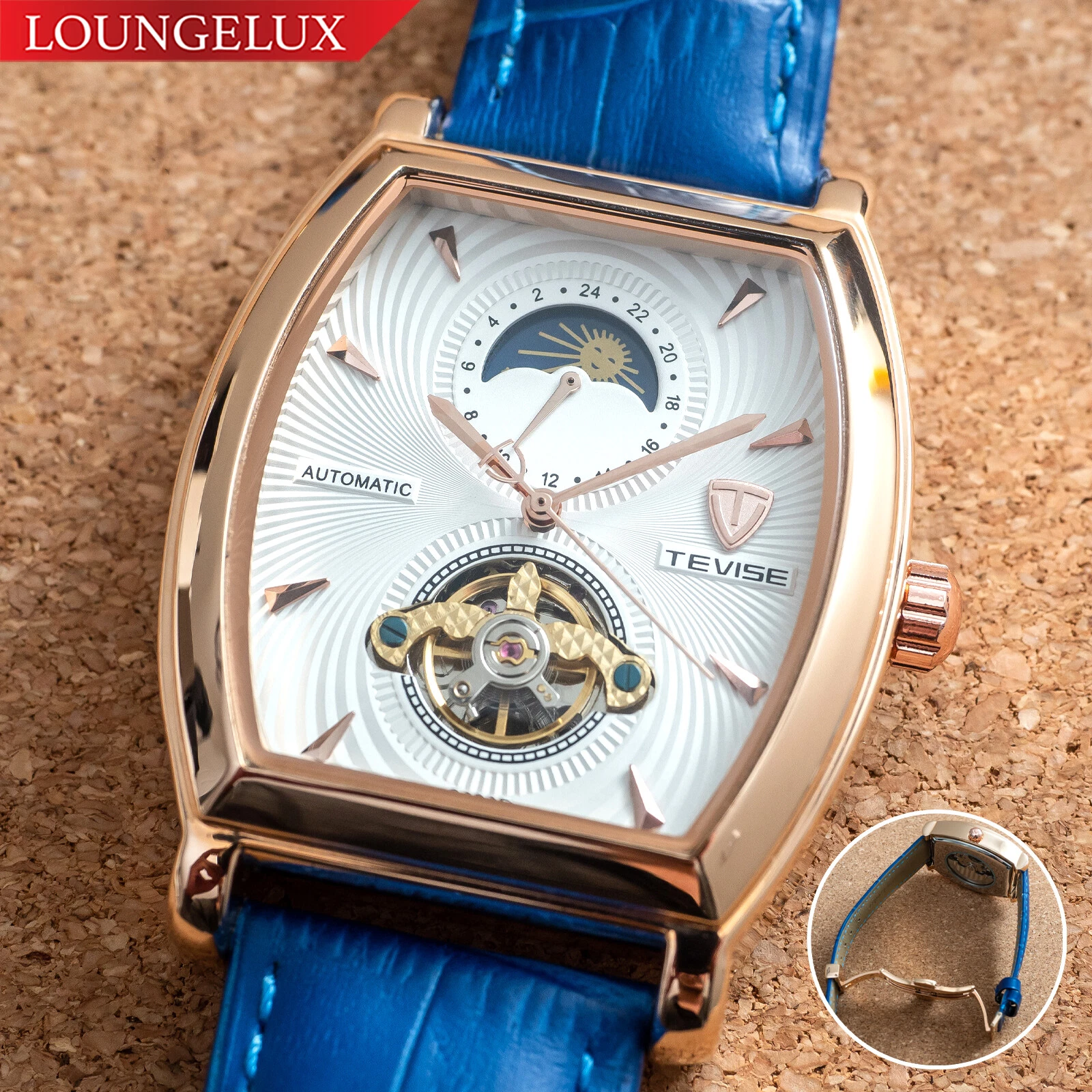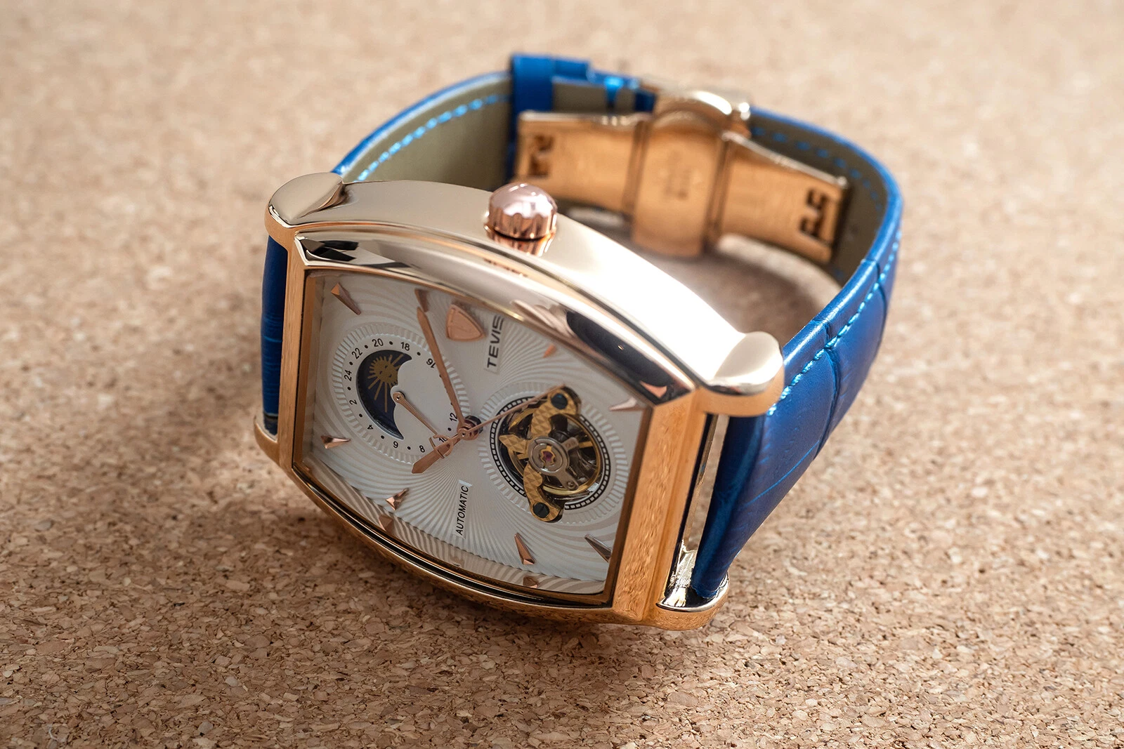 Mens Rose Gold Moon Phase Automatic Mechanical Watch Blue Leather 24HR Dial